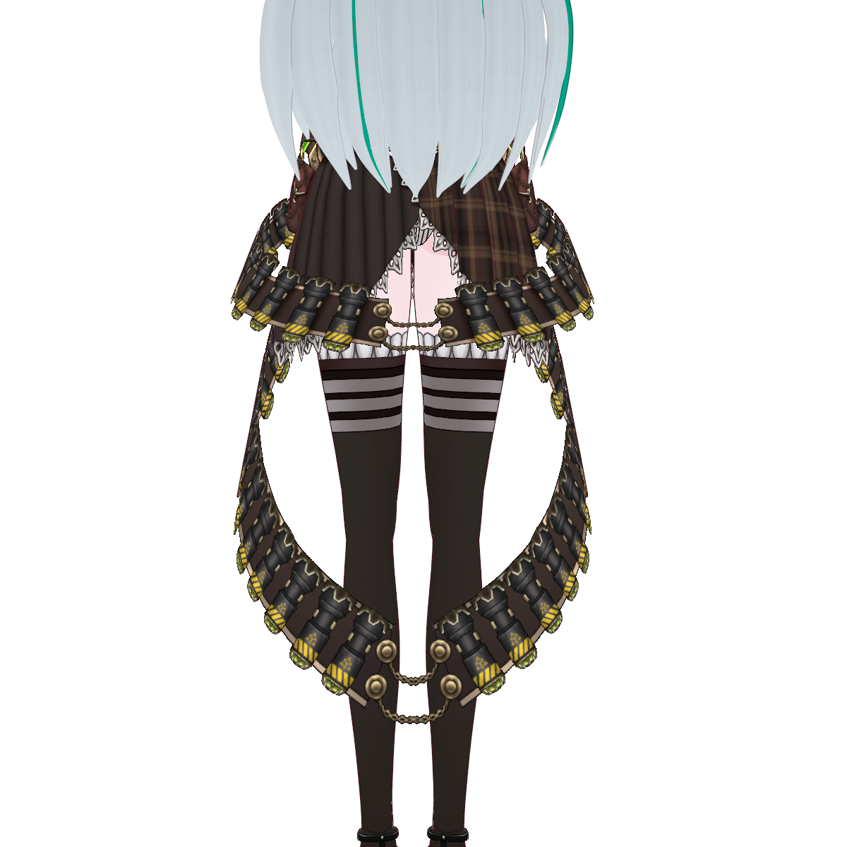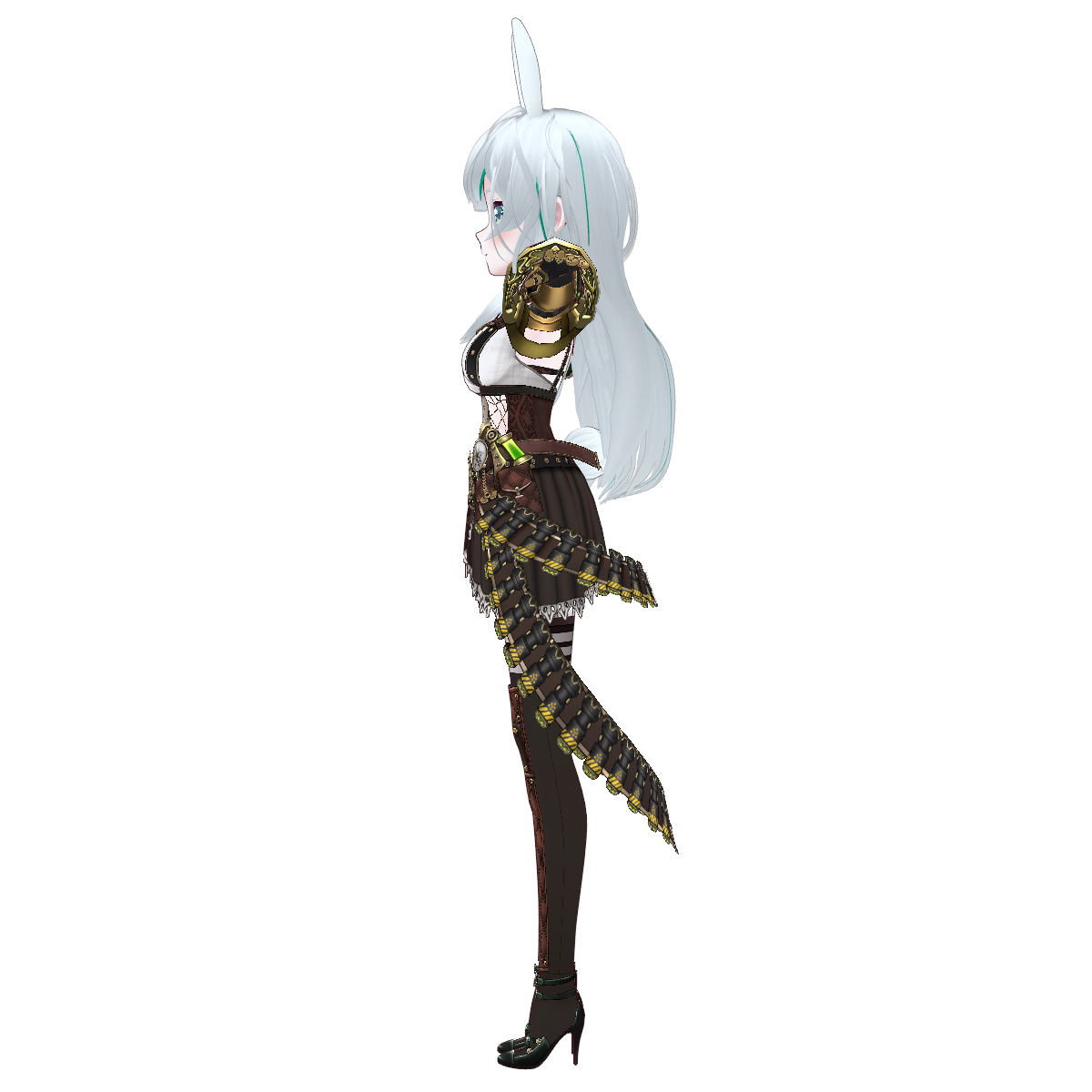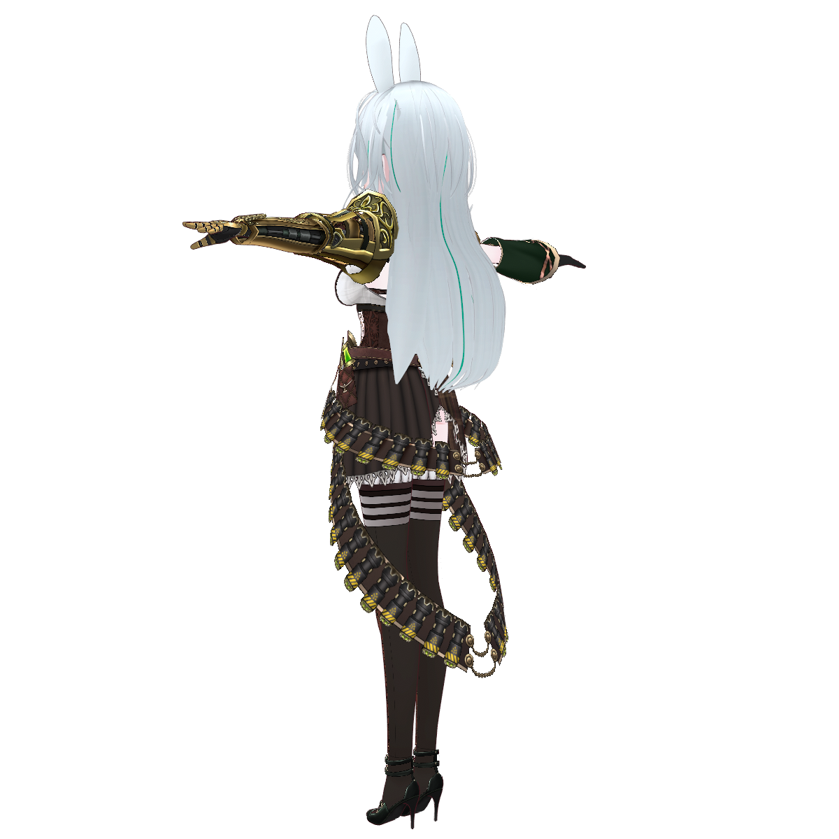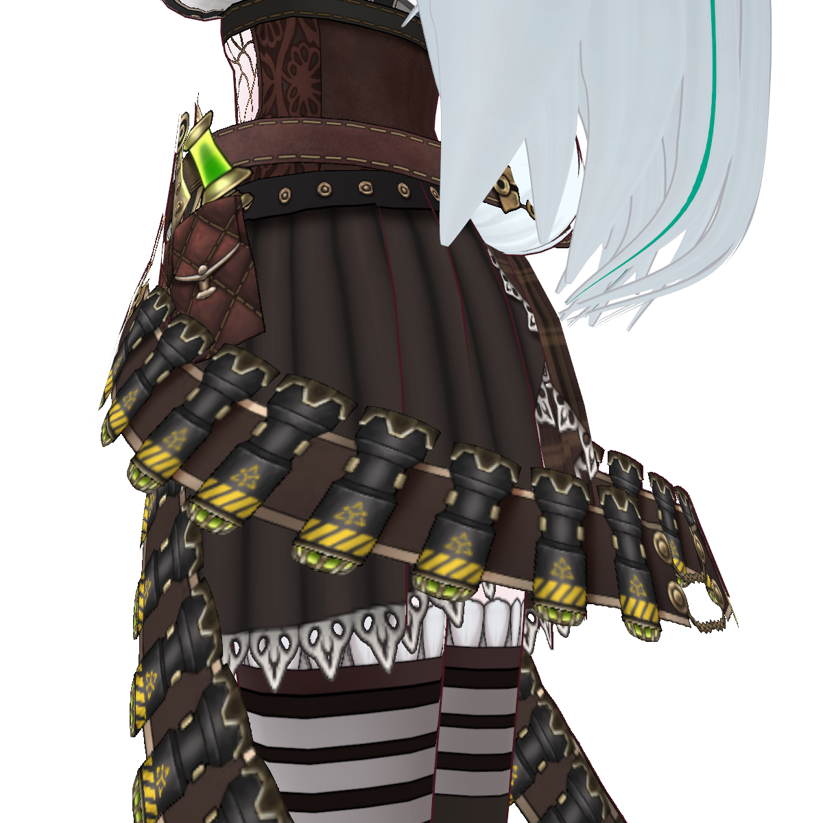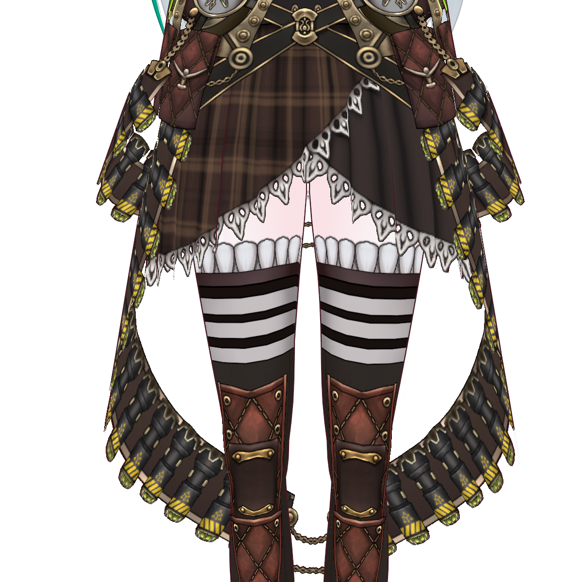 スチームパンクのイメージです。腰回りから武器弾をスカートのようにベルトで垂らしています。