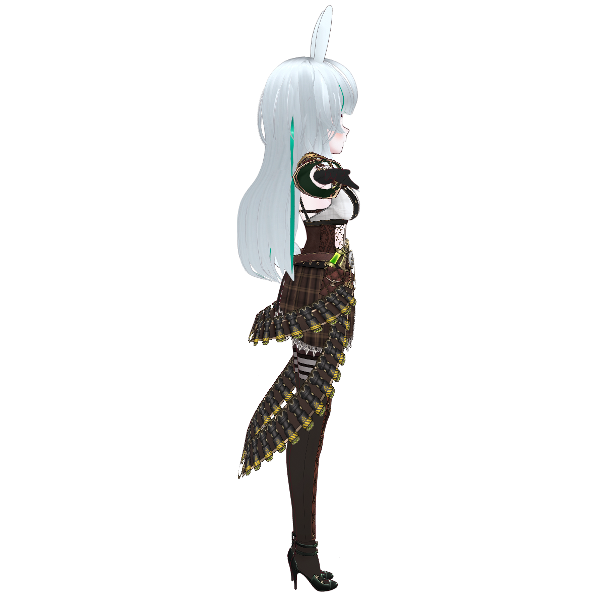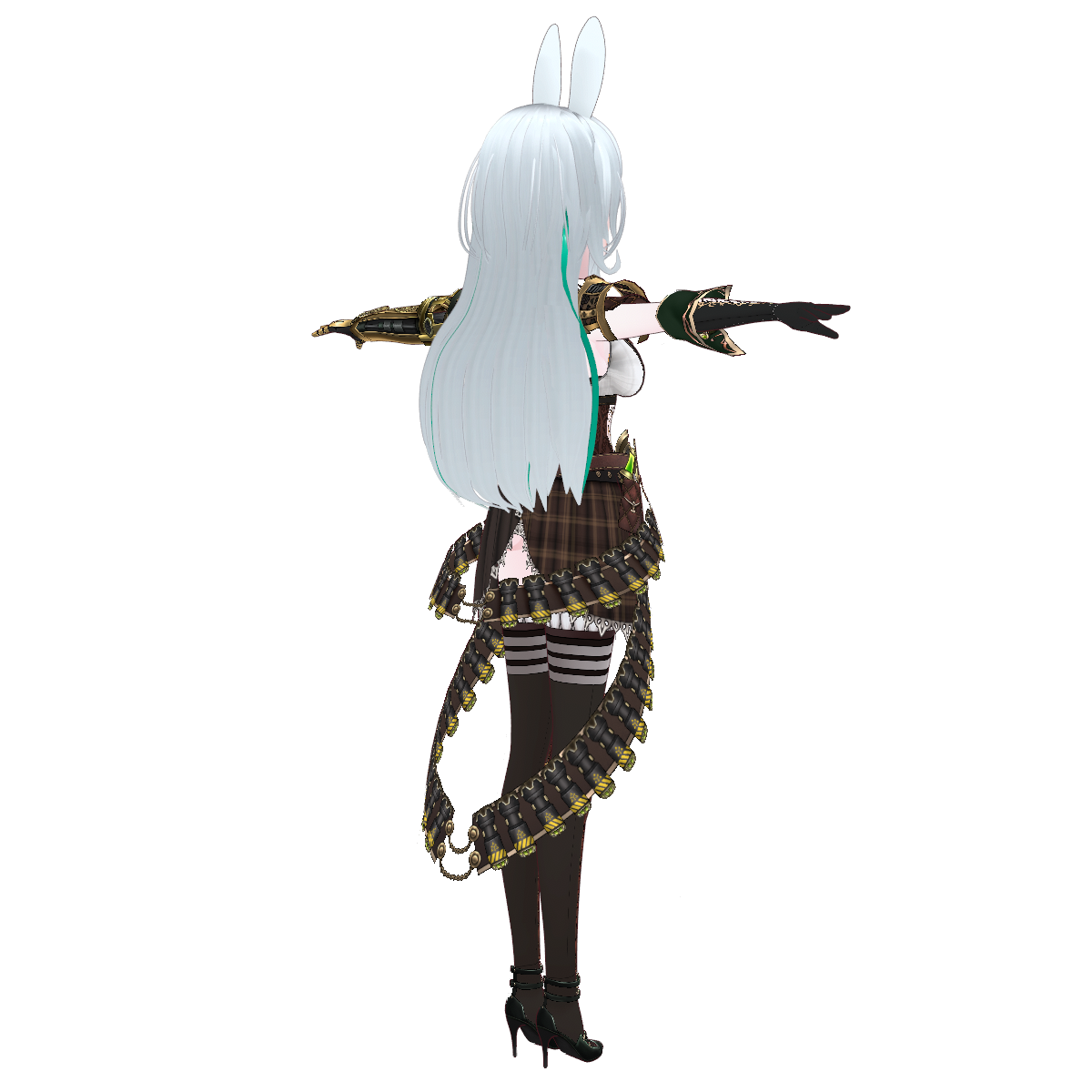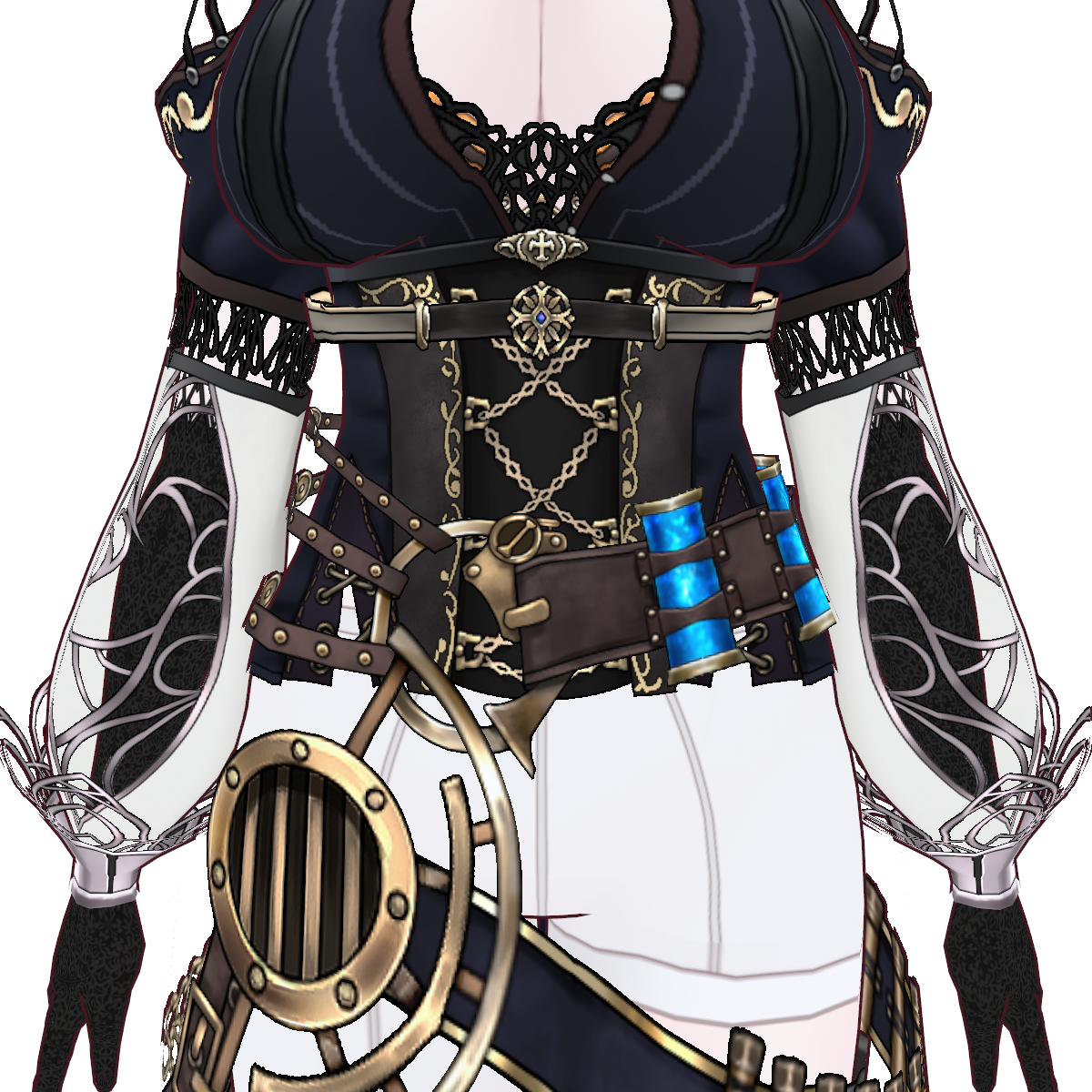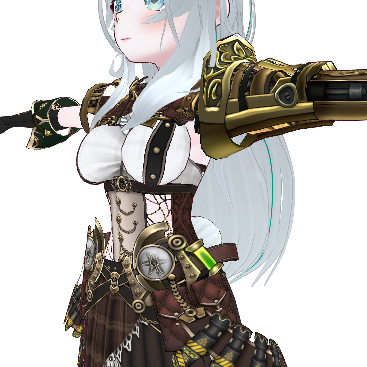 スチームパンクのイメージです。腰回りから武器弾をスカートのようにベルトで垂らしています。