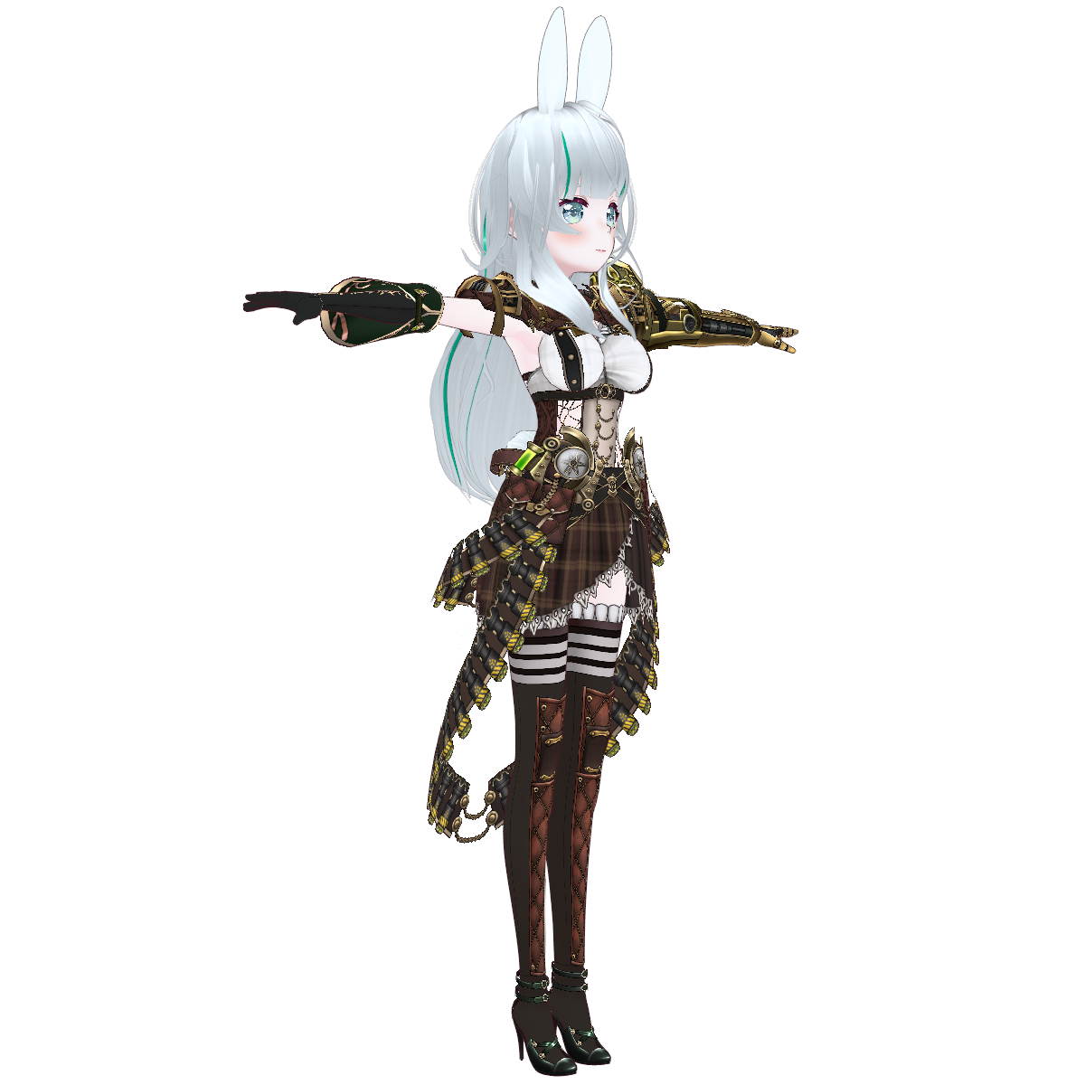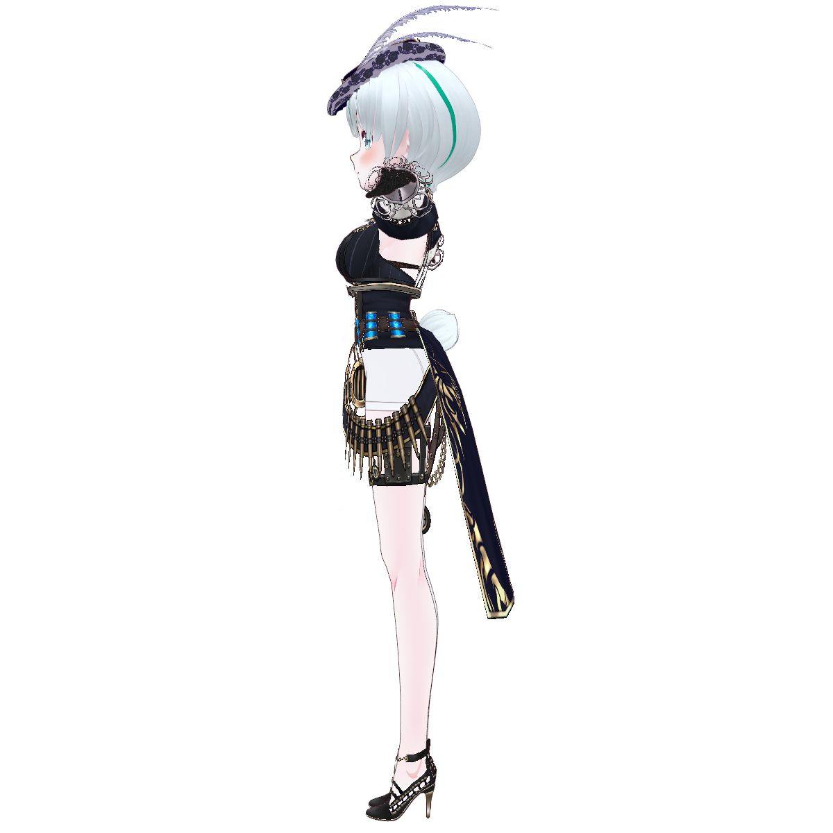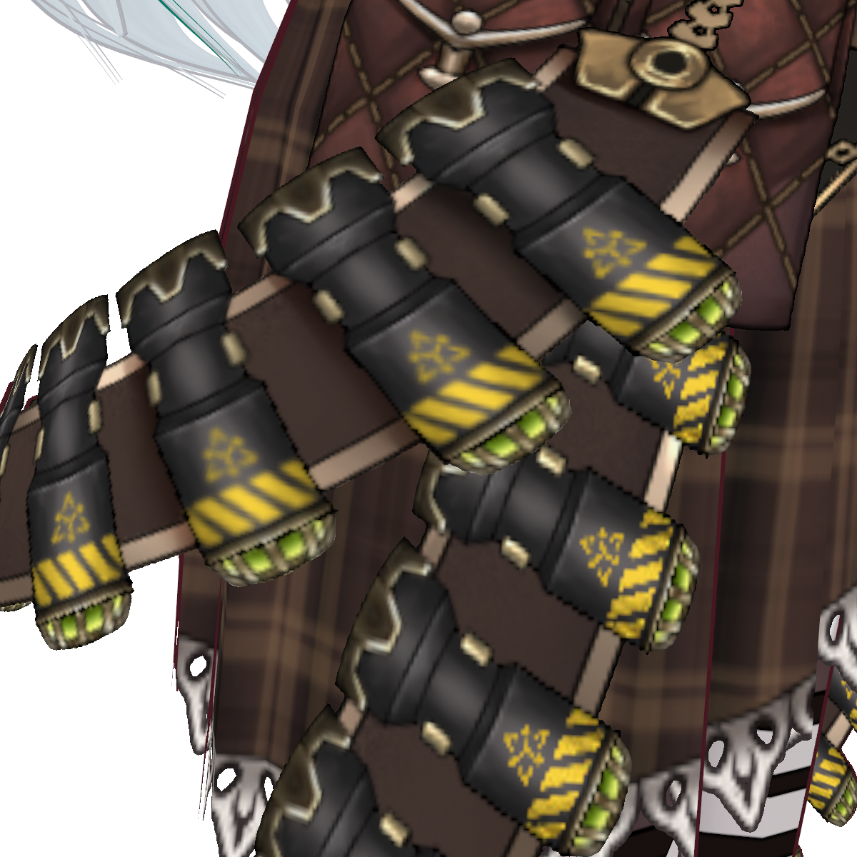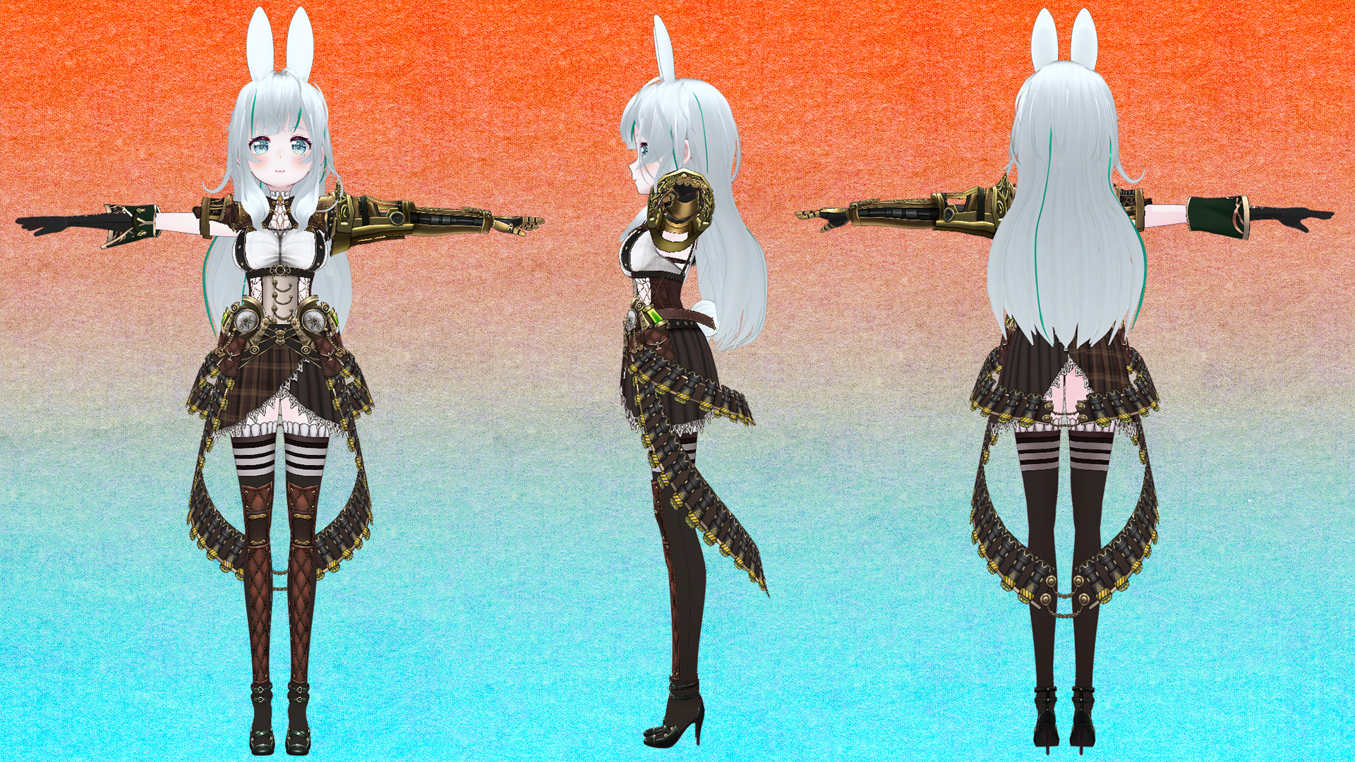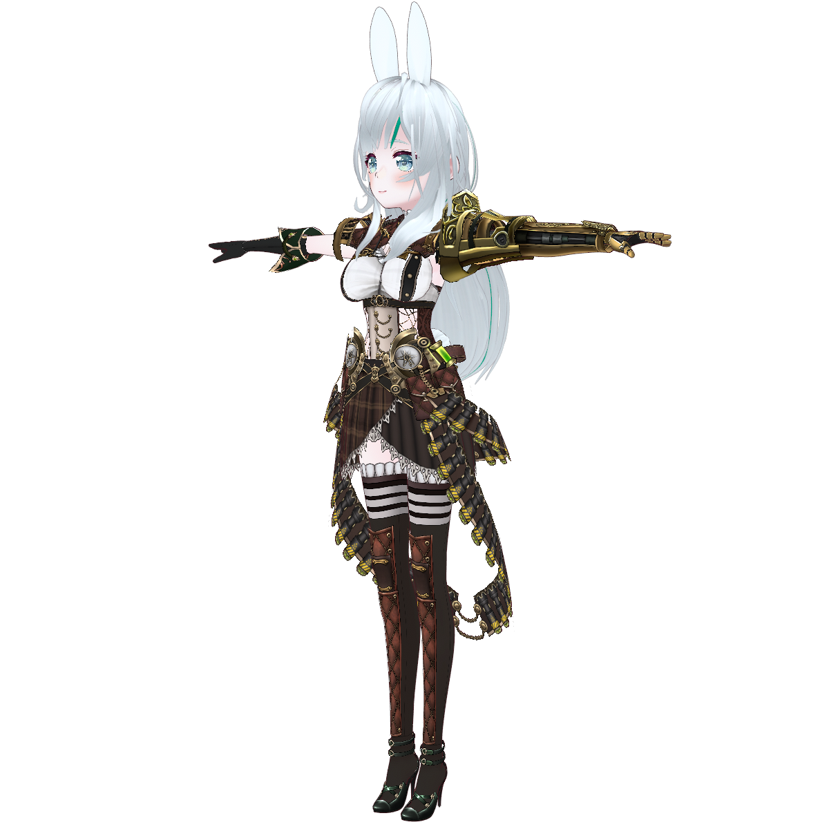 スチームパンクのイメージです。腰回りから武器弾をスカートのようにベルトで垂らしています。