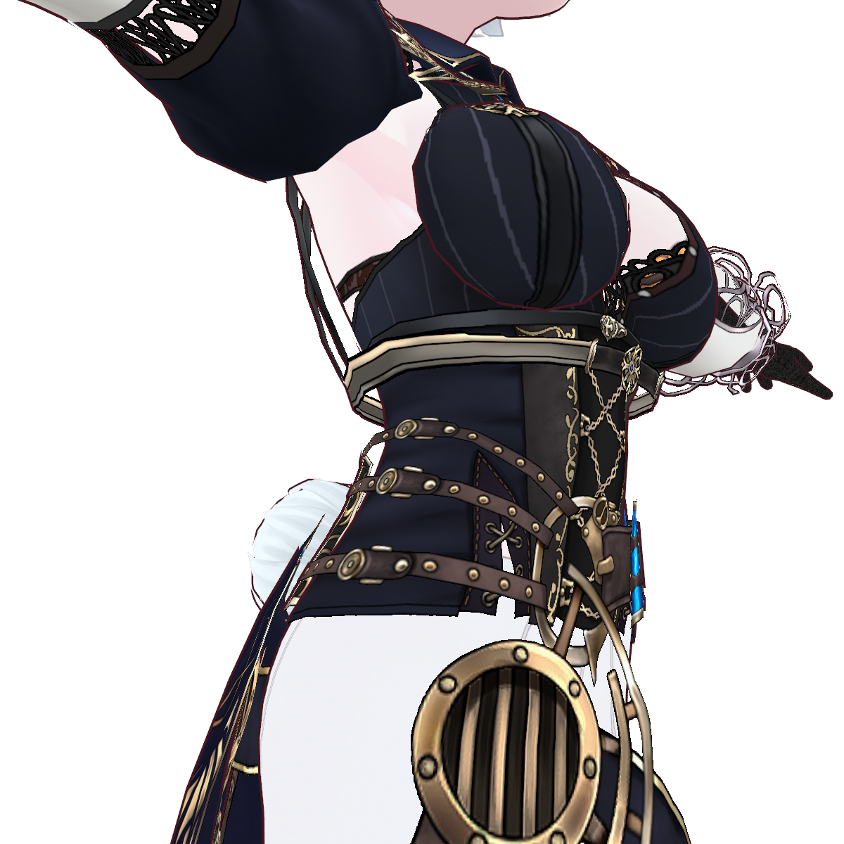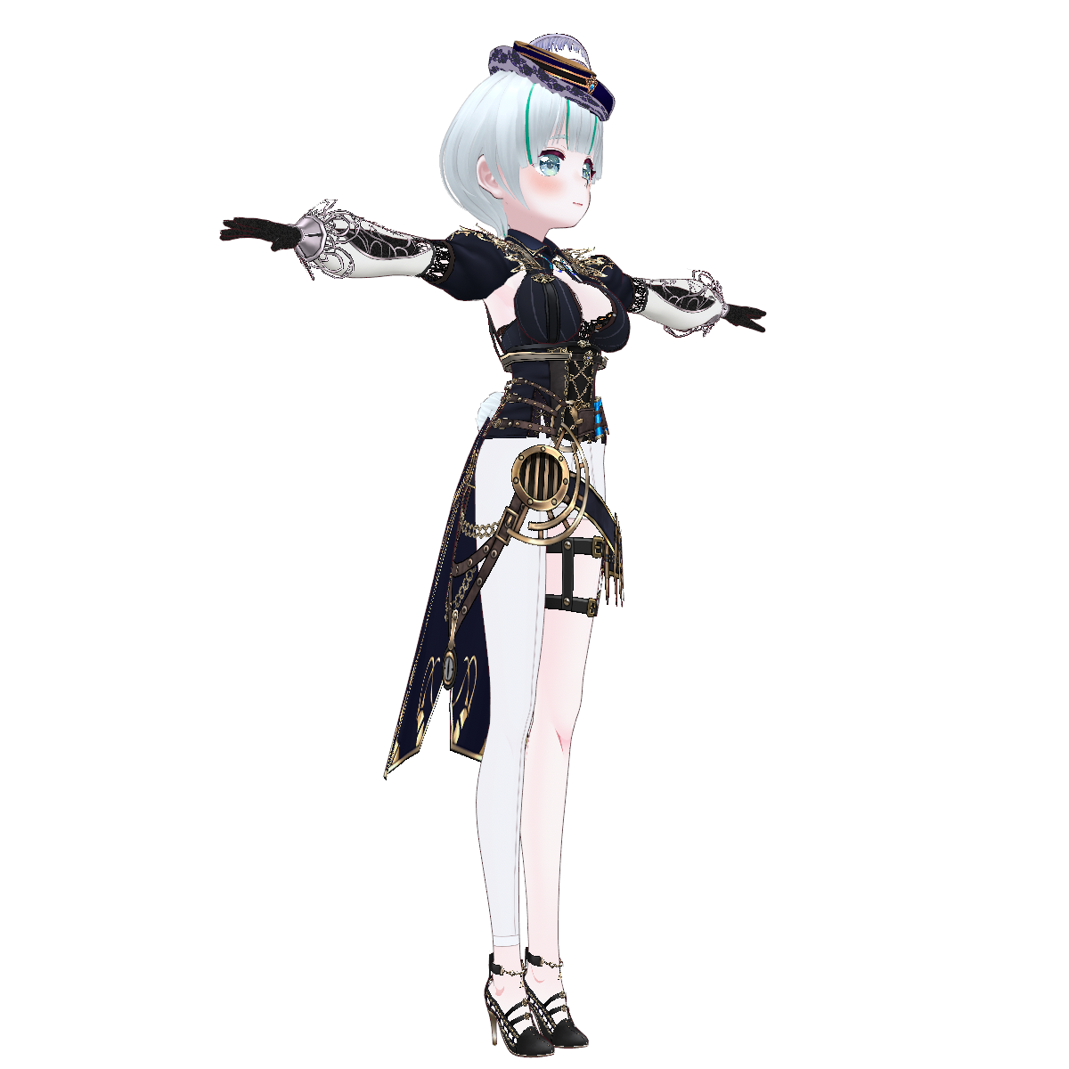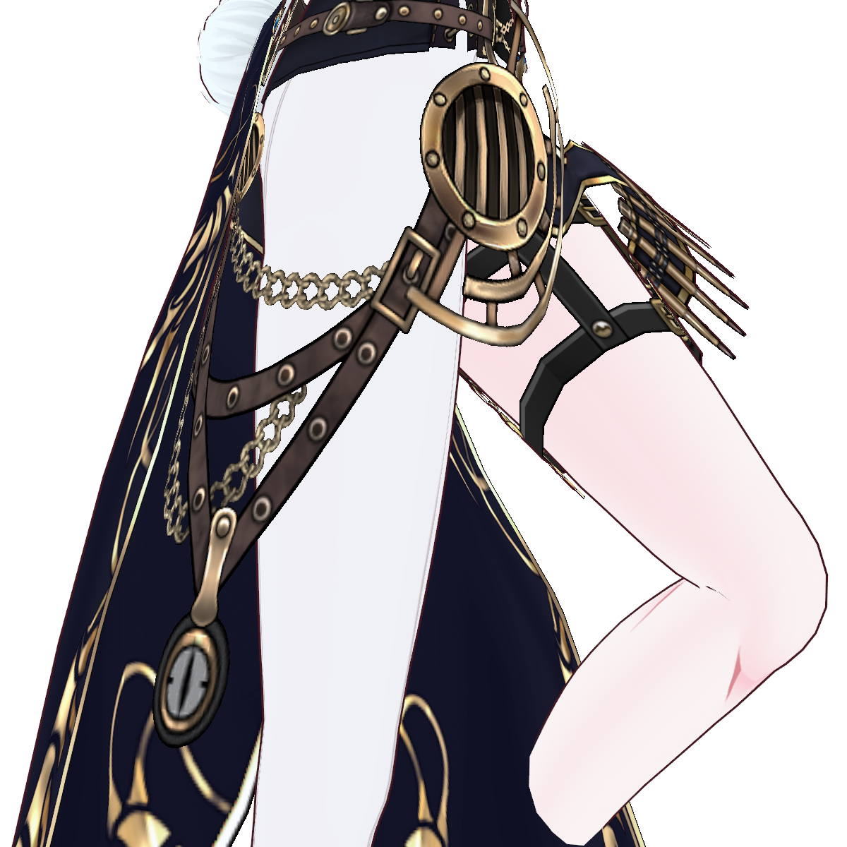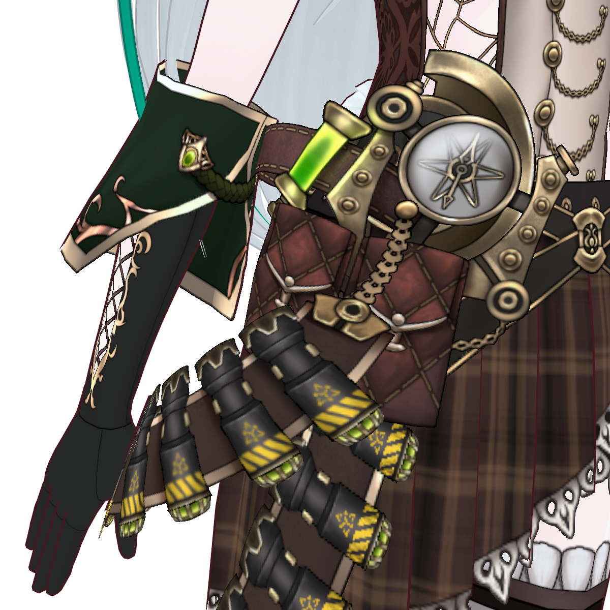 向かって右側の腕は義手となっています。腰の左右にはコンパスがあしらわれており、丈の短いチェックのレイヤースカートを履いています。