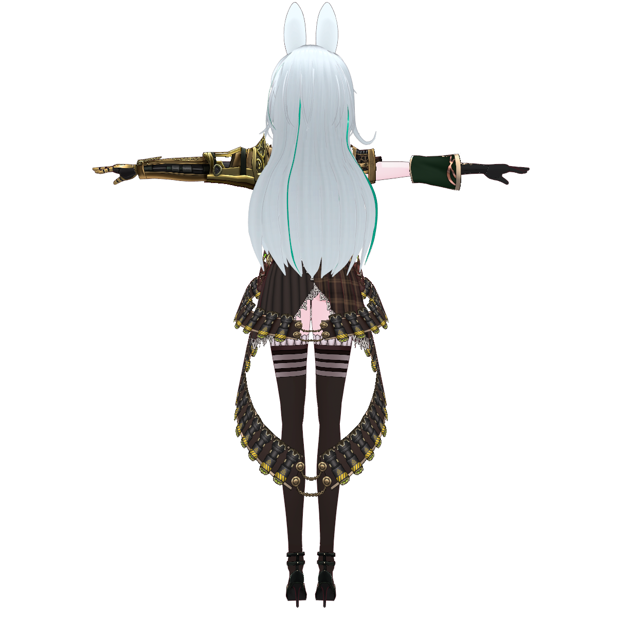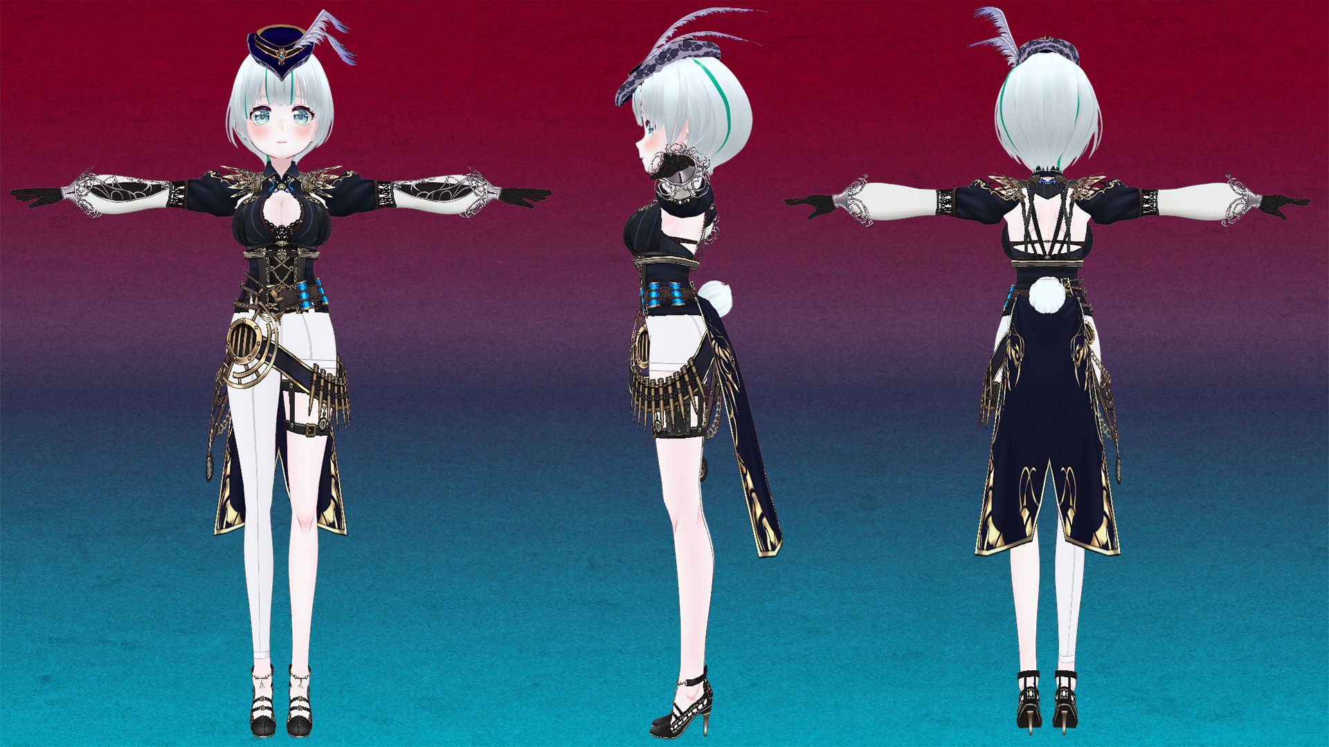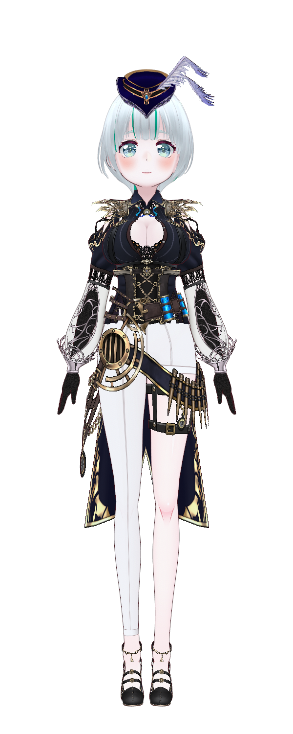 向かって右側の腕は義手となっています。腰の左右にはコンパスがあしらわれており、丈の短いチェックのレイヤースカートを履いています。