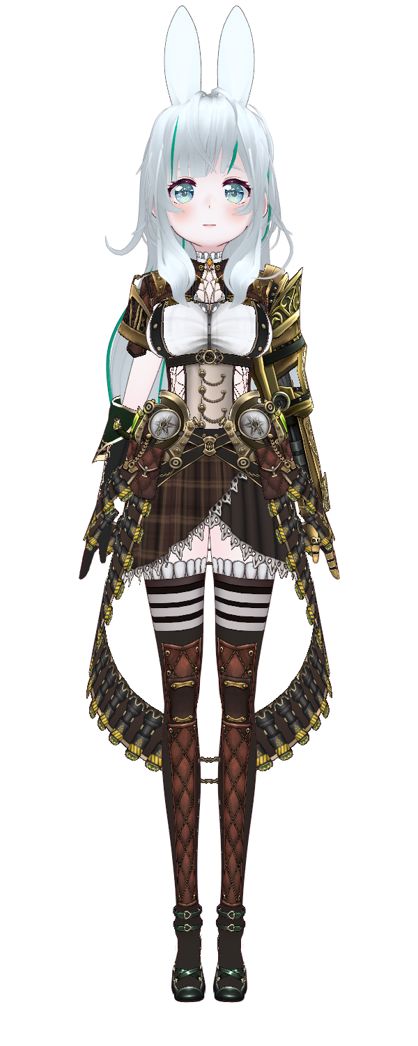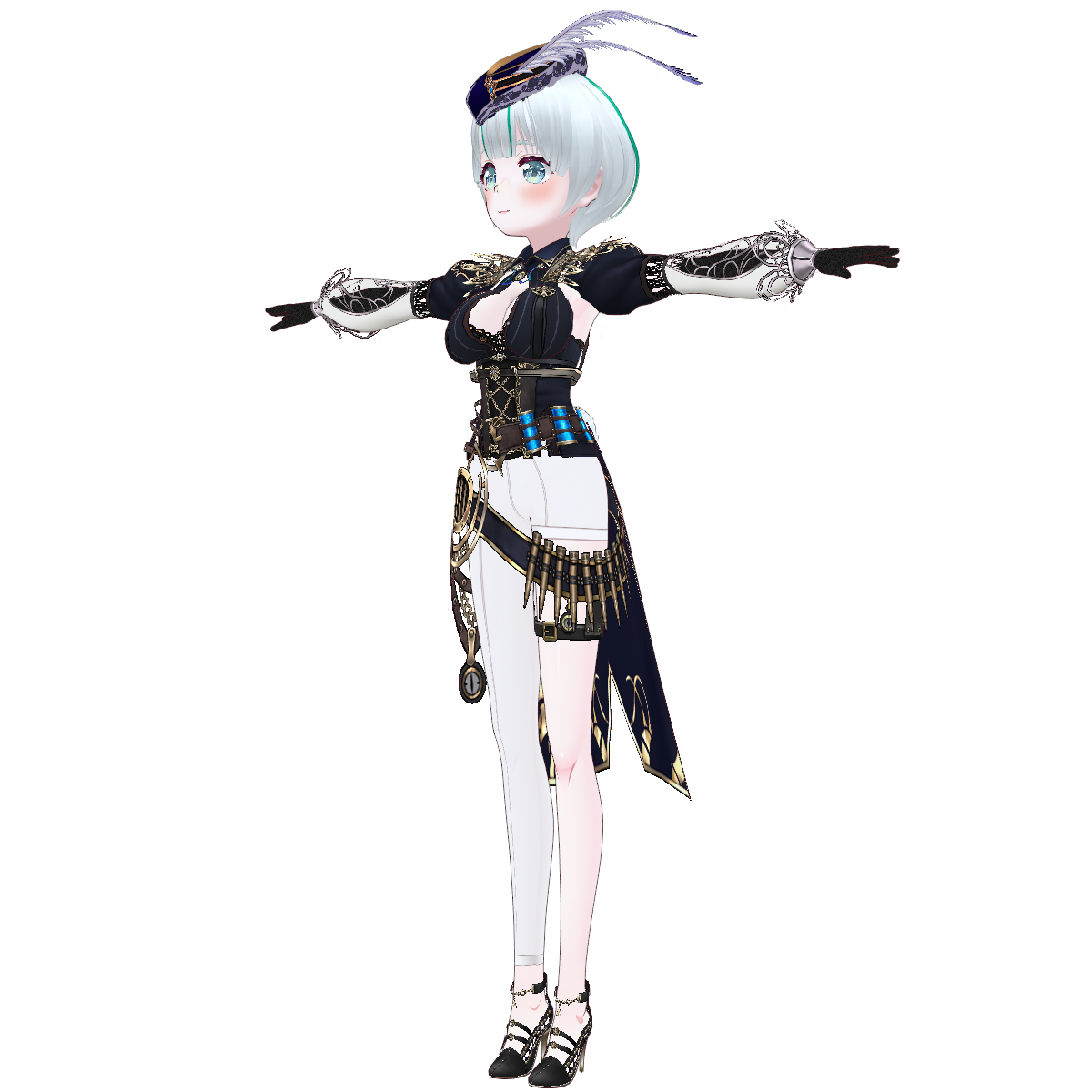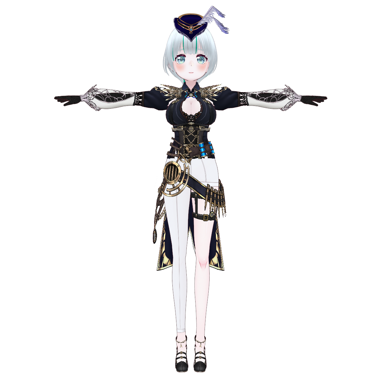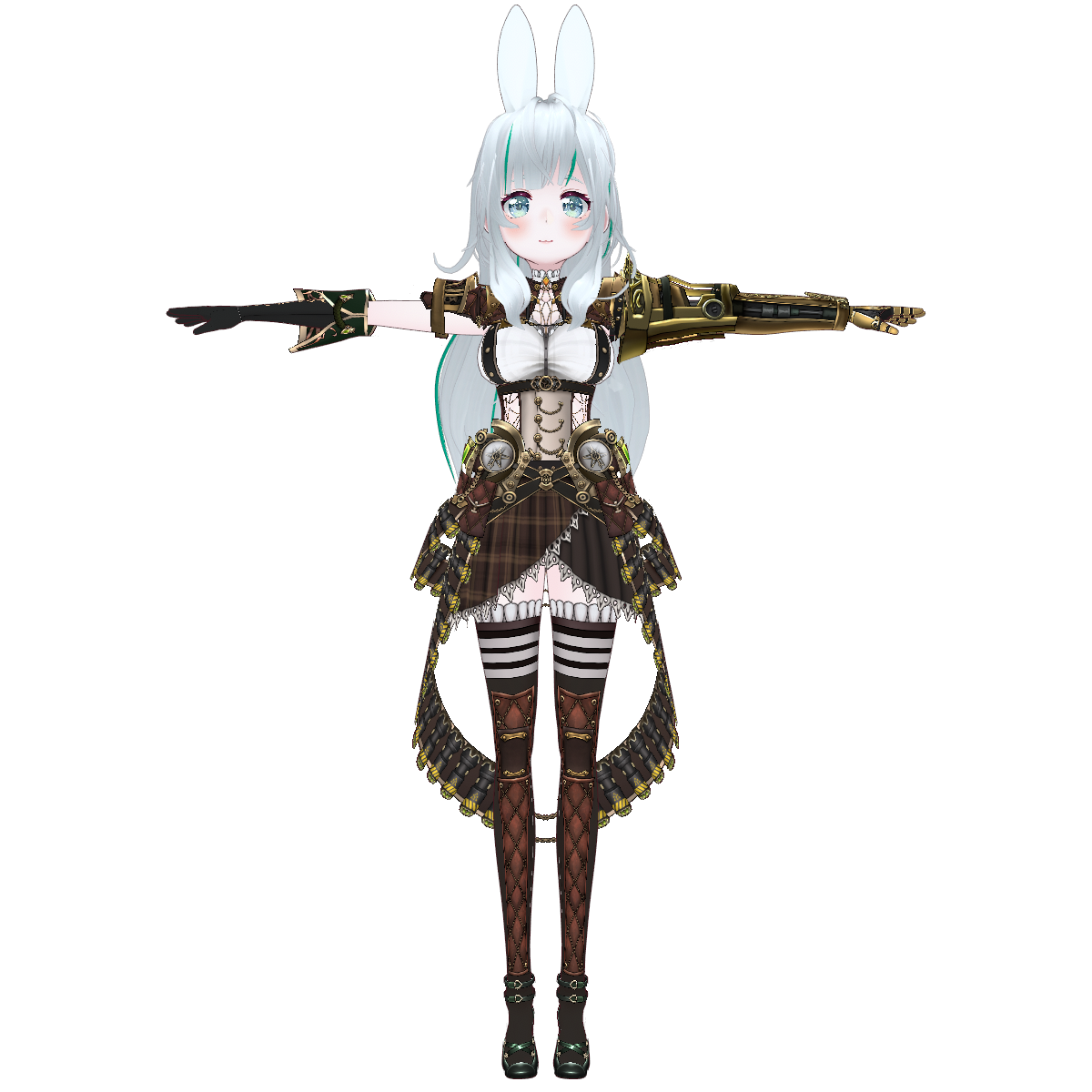 向かって右側の腕は義手となっています。腰の左右にはコンパスがあしらわれており、丈の短いチェックのレイヤースカートを履いています。