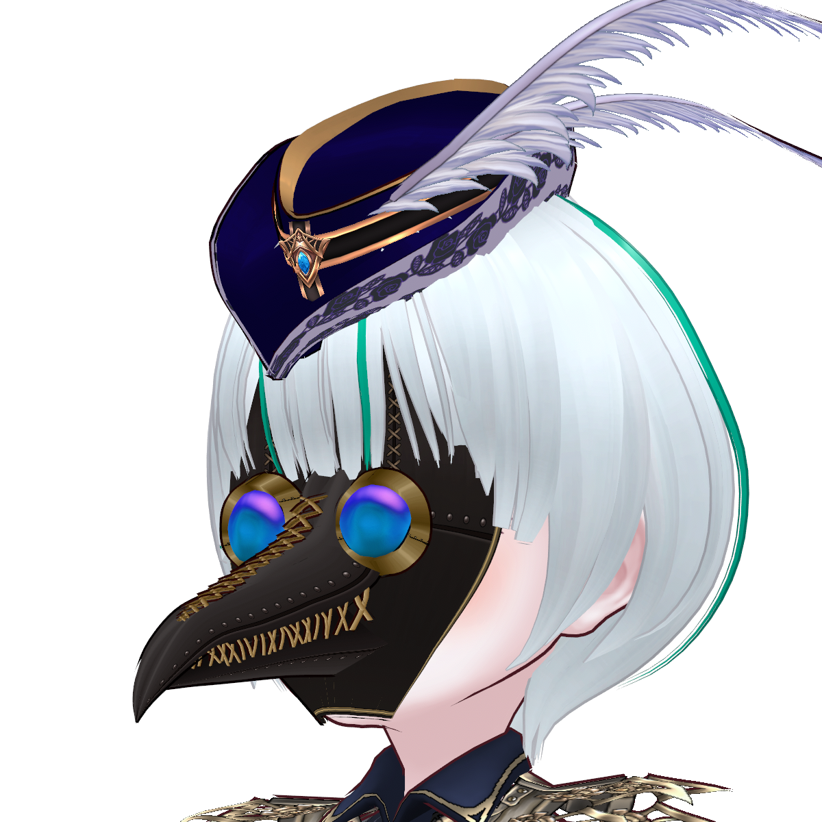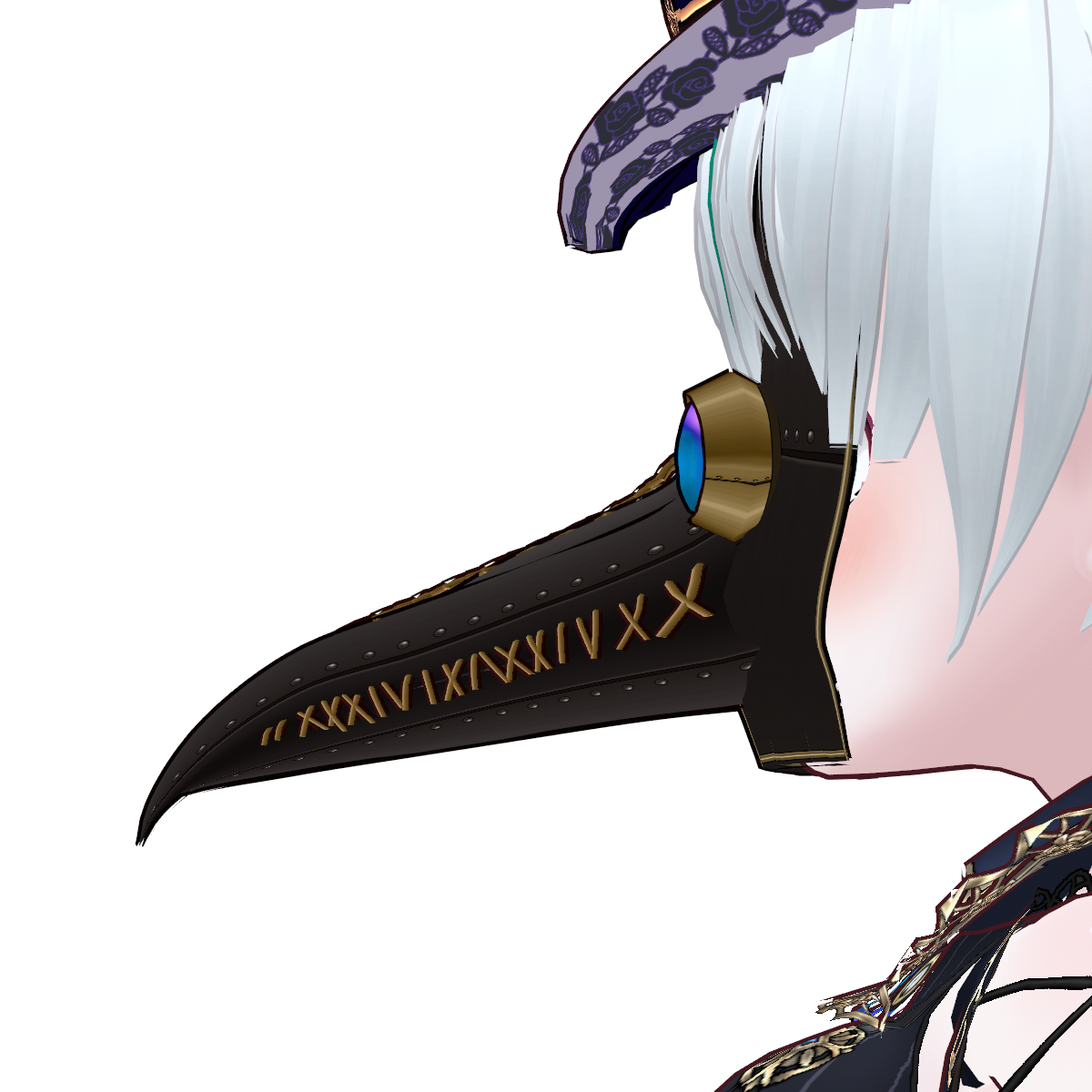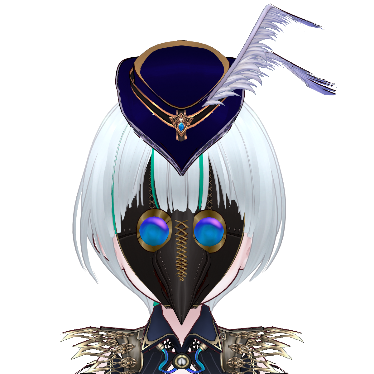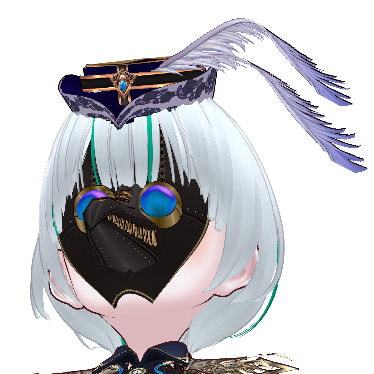 革製のペストマスクを着けています。うさ耳は帽子の中に完全にしまい込んでいます。帽子には長い鳥の羽がついています。