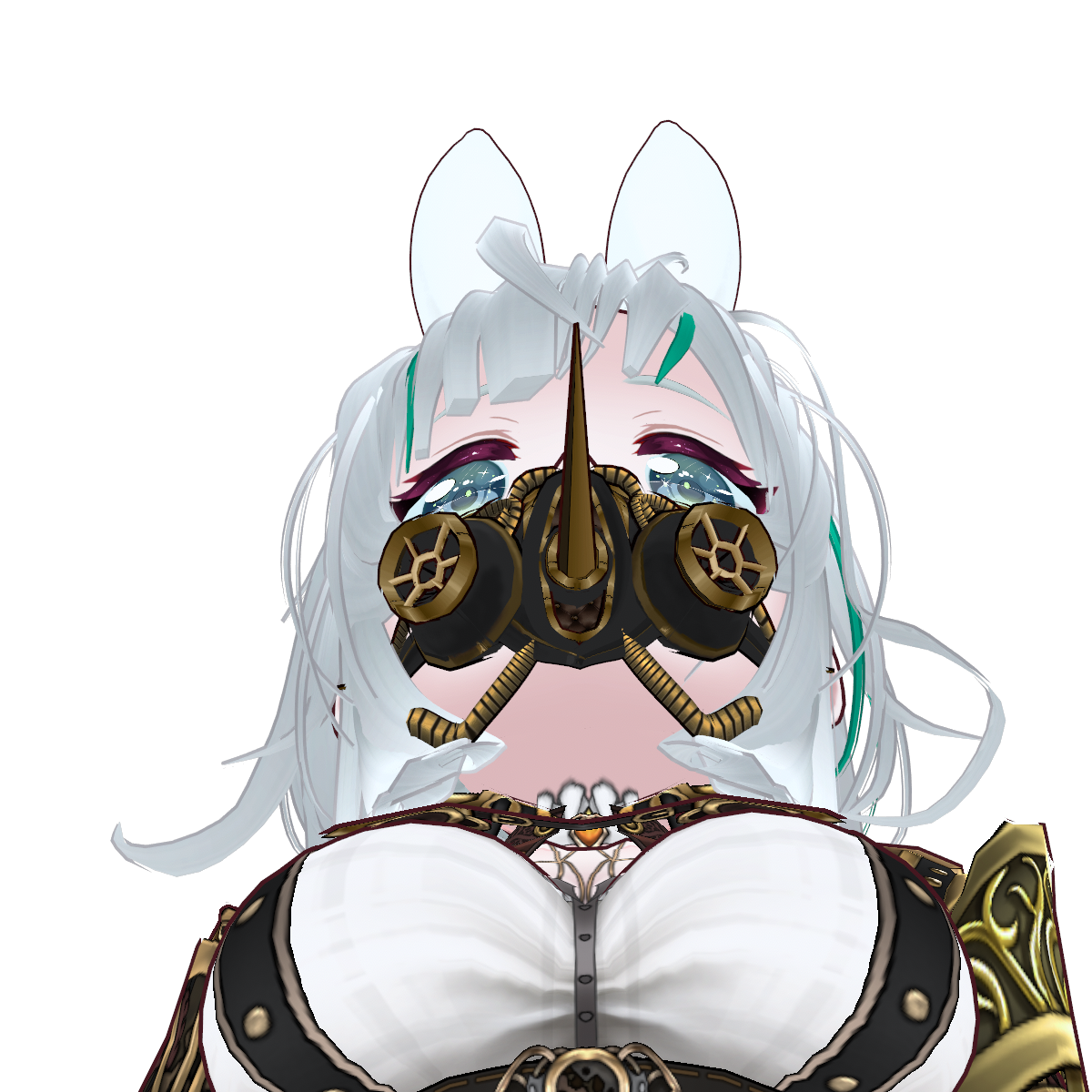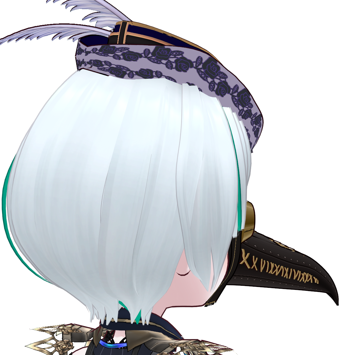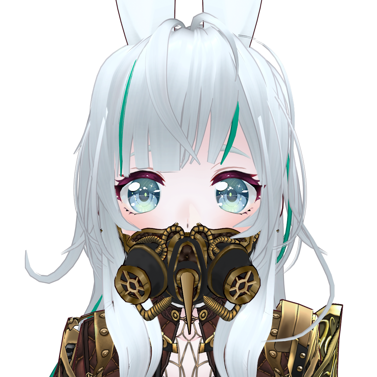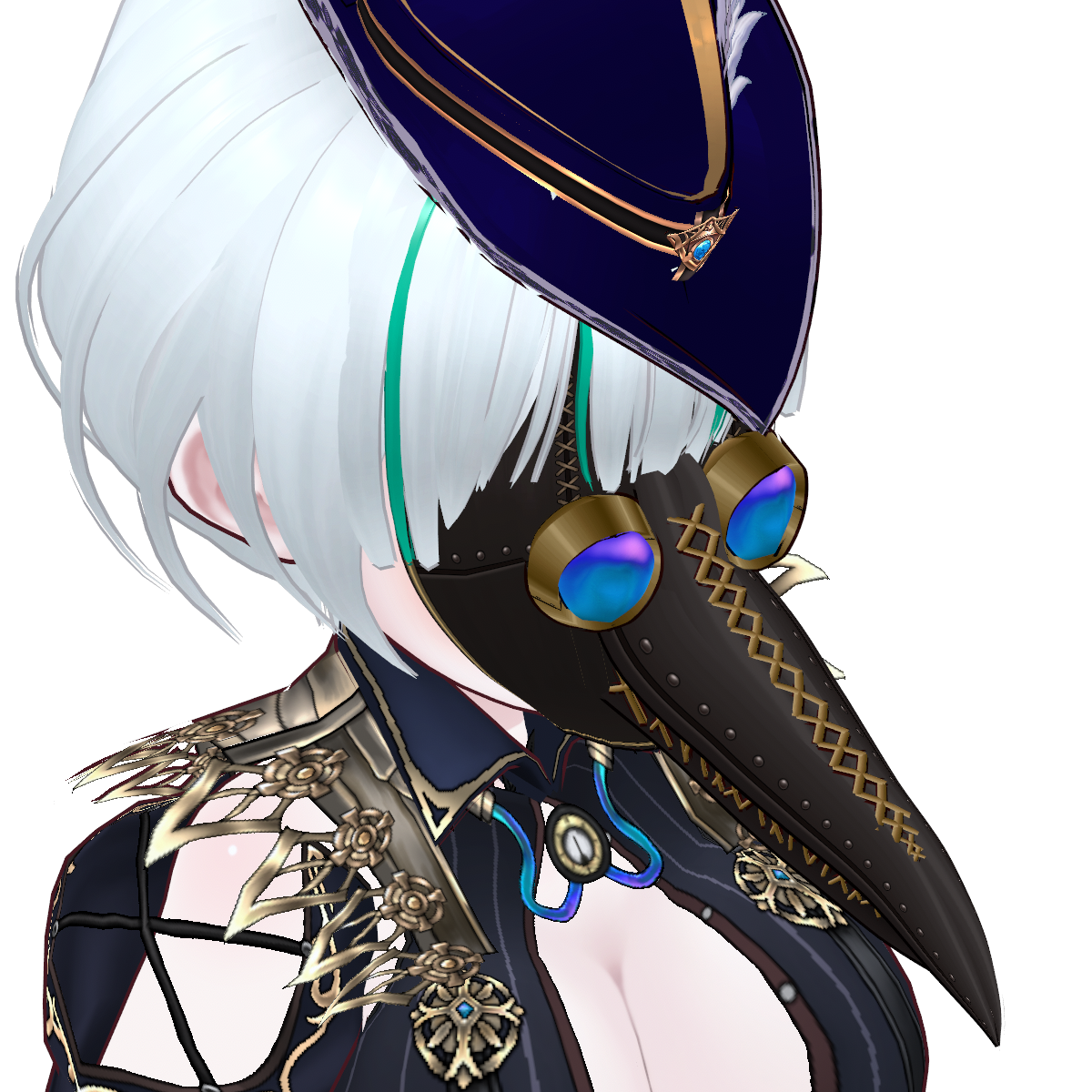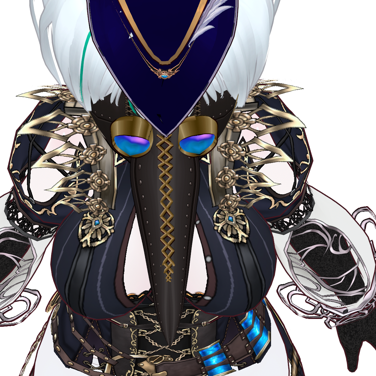 革製のペストマスクを着けています。うさ耳は帽子の中に完全にしまい込んでいます。帽子には長い鳥の羽がついています。