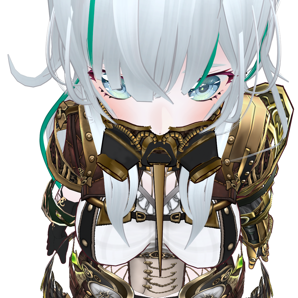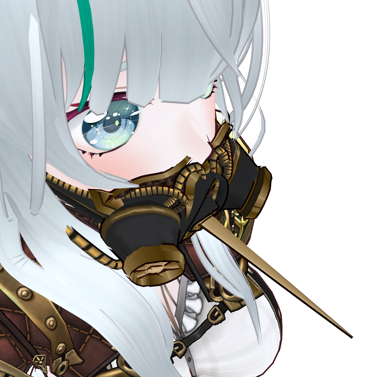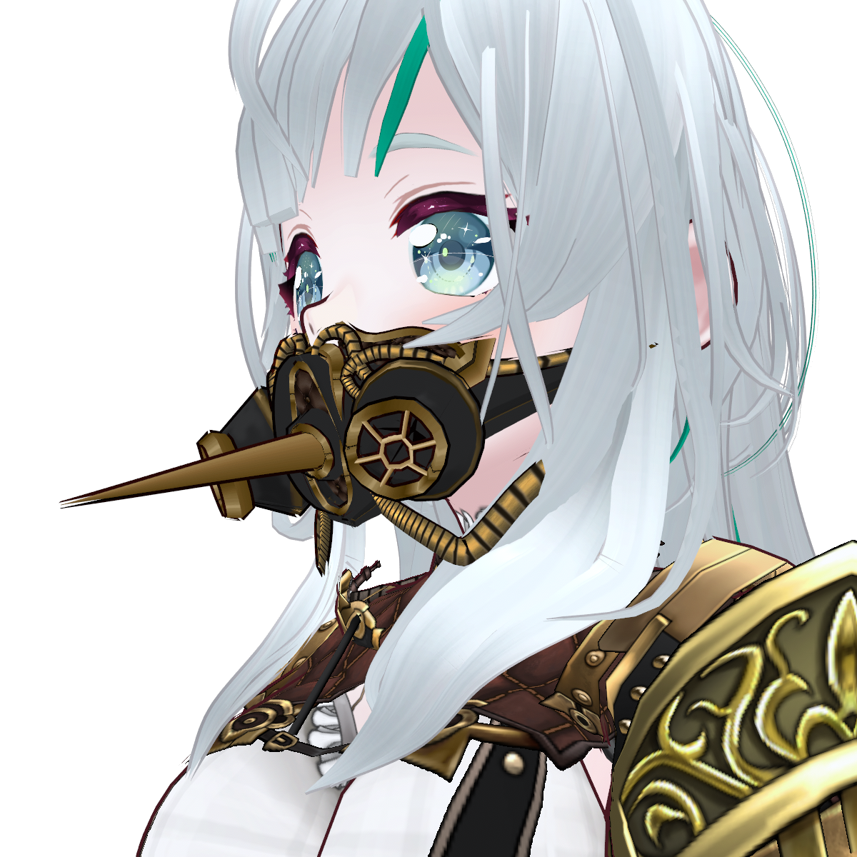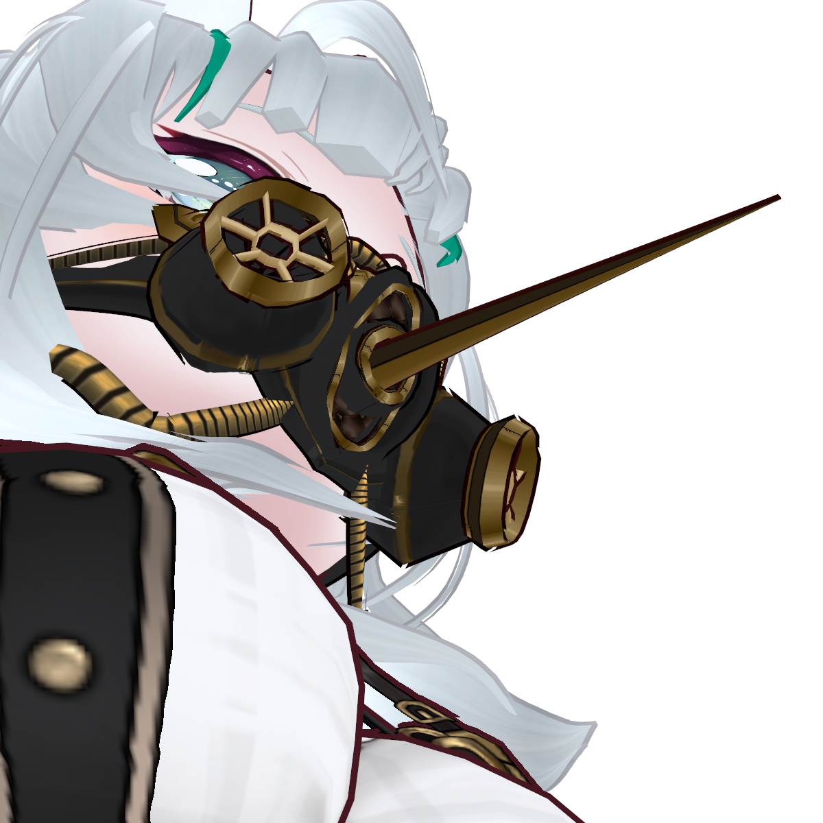 革製のペストマスクを着けています。うさ耳は帽子の中に完全にしまい込んでいます。帽子には長い鳥の羽がついています。