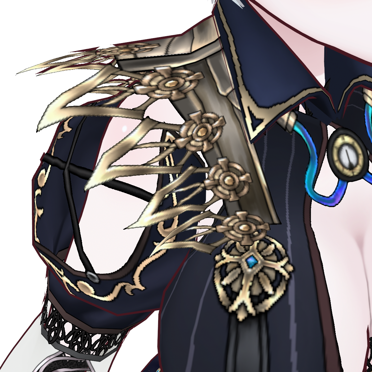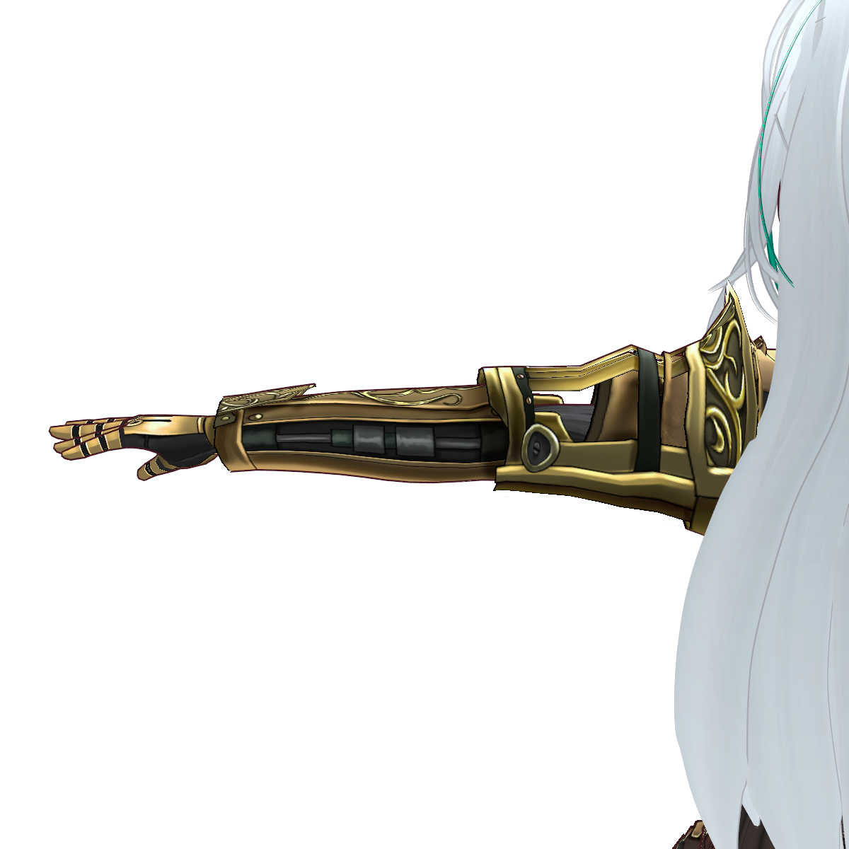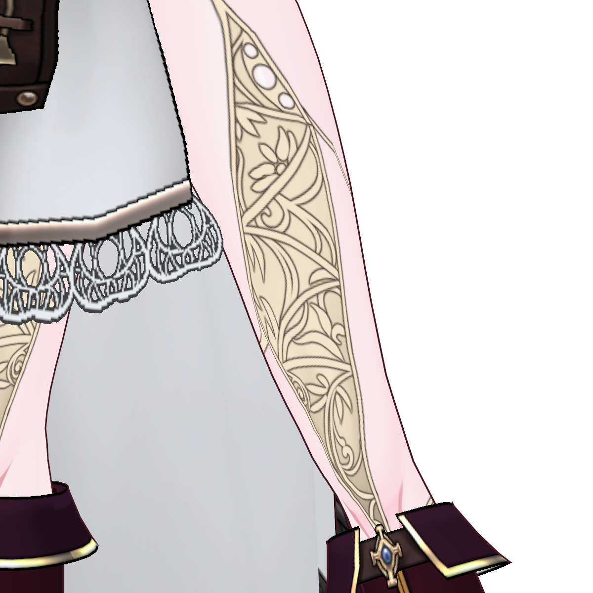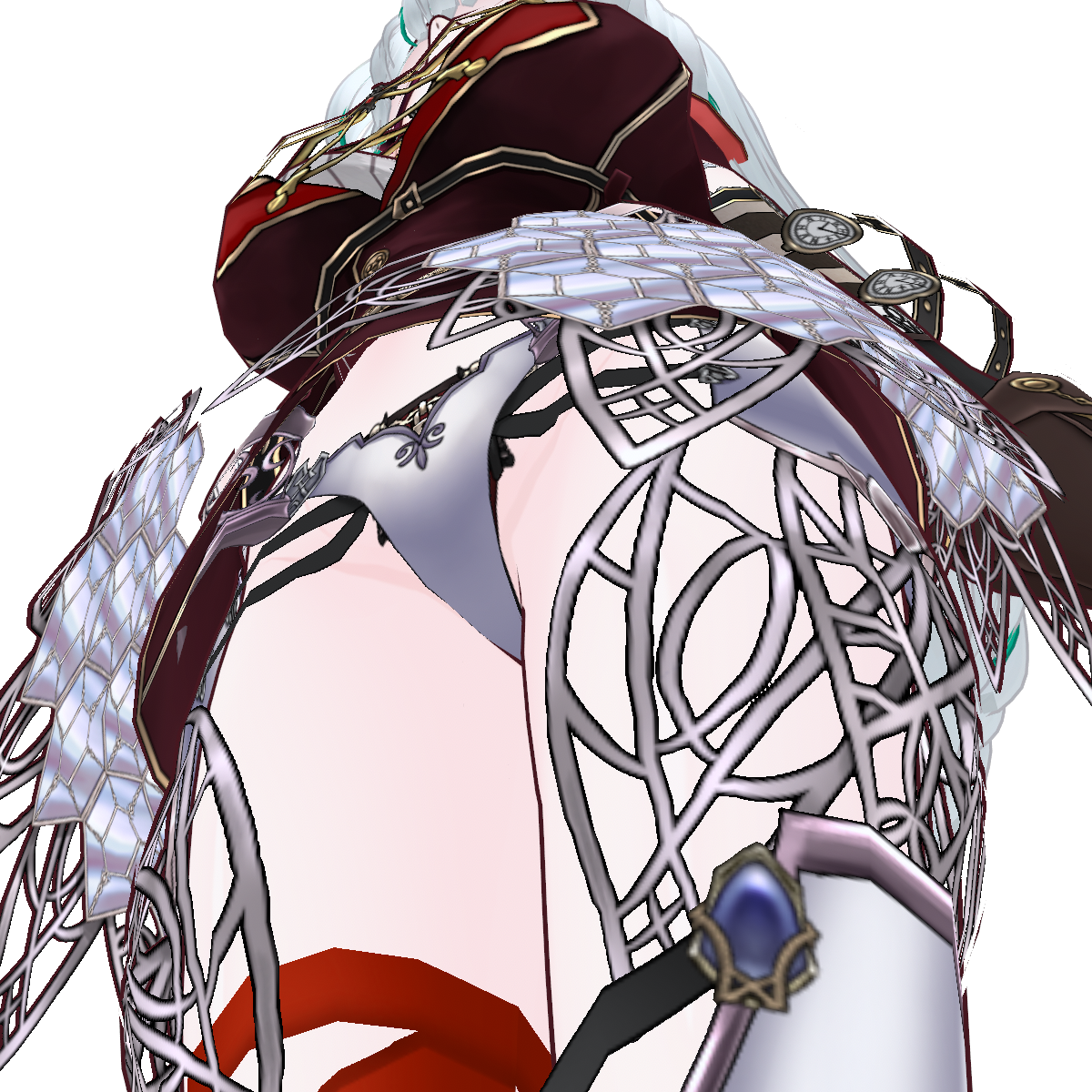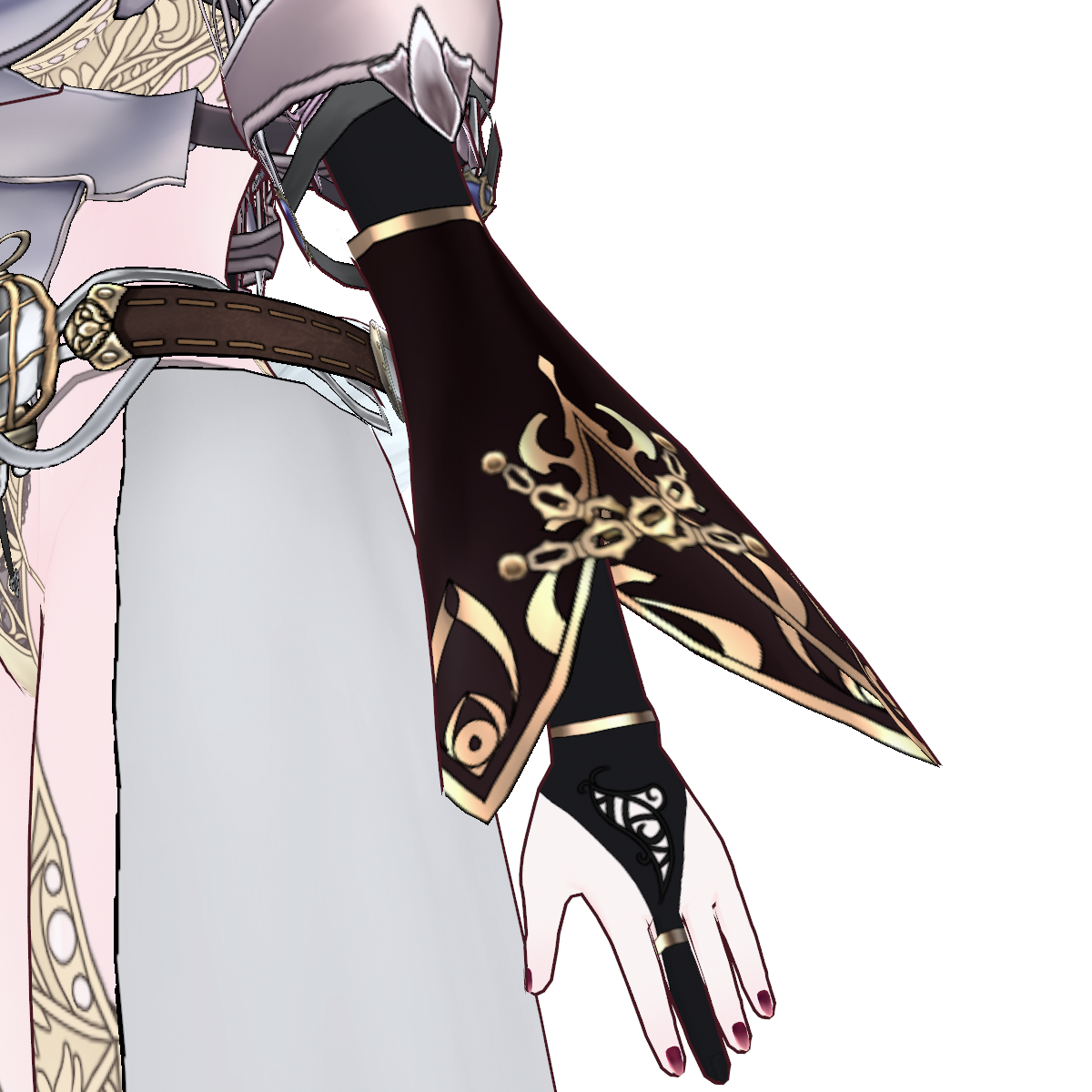 肌が露出している部分があります。露出部分にはレースのようなディテールがあしらわれています。重たい衣装なので肌とのバランスで重くなりすぎないようにしてください。左右で腕の装飾が違います。