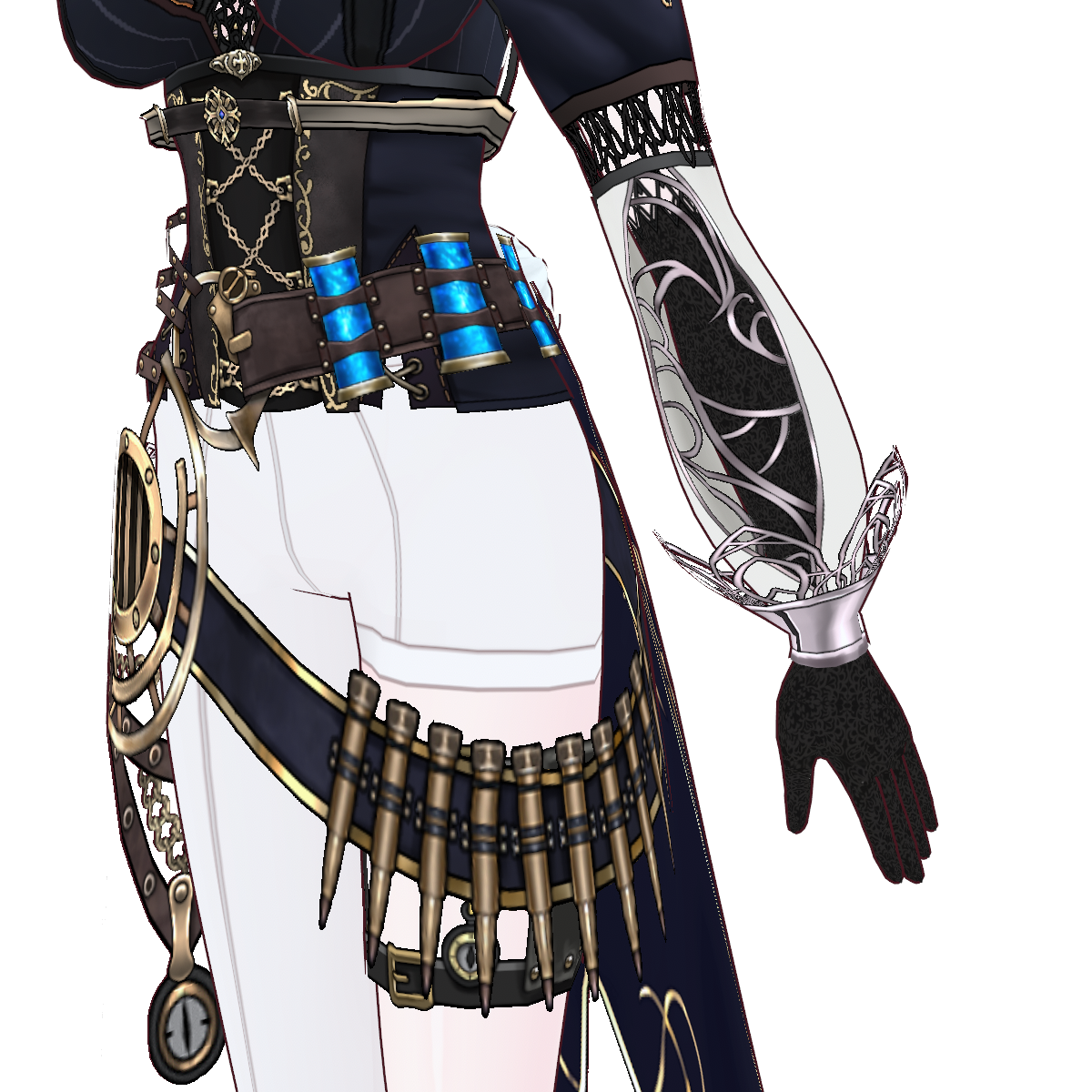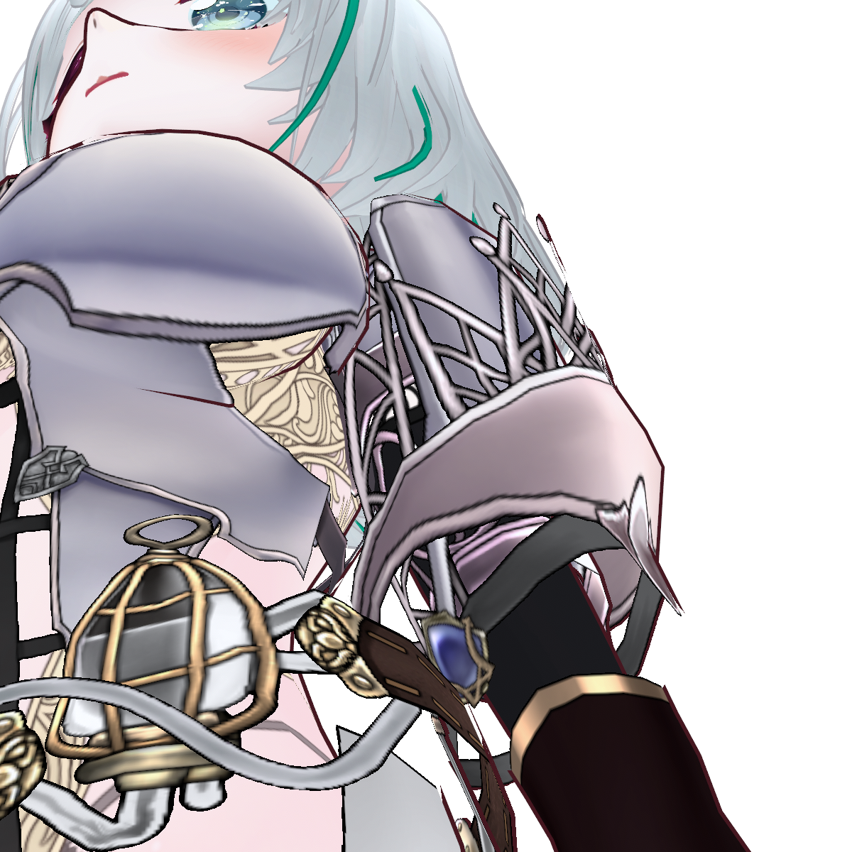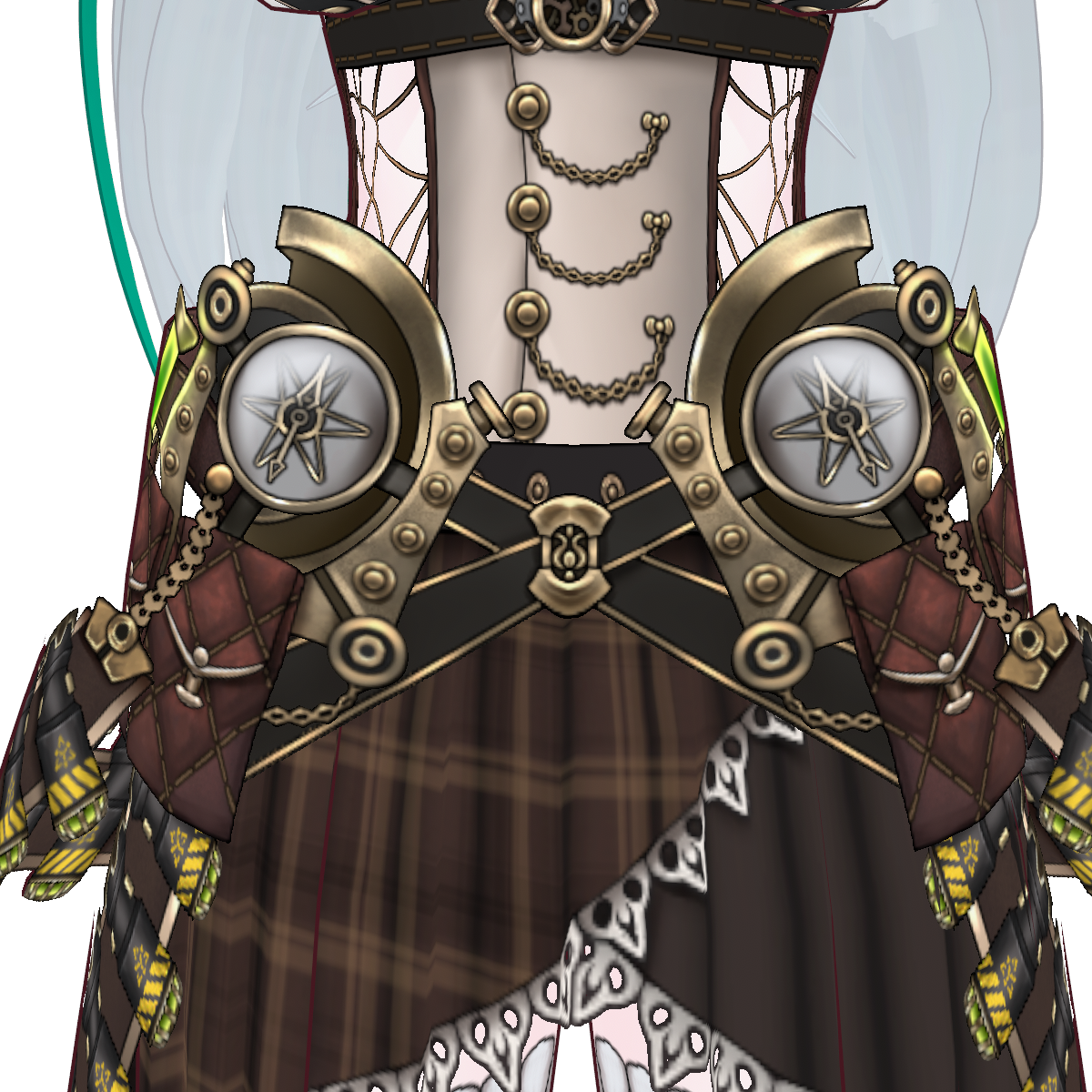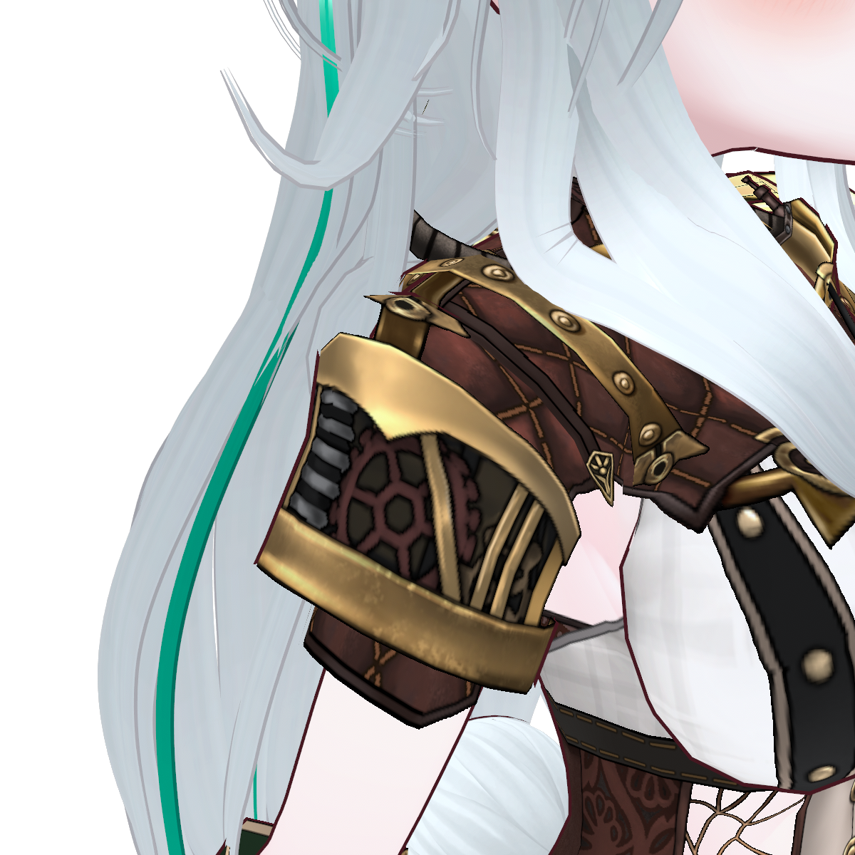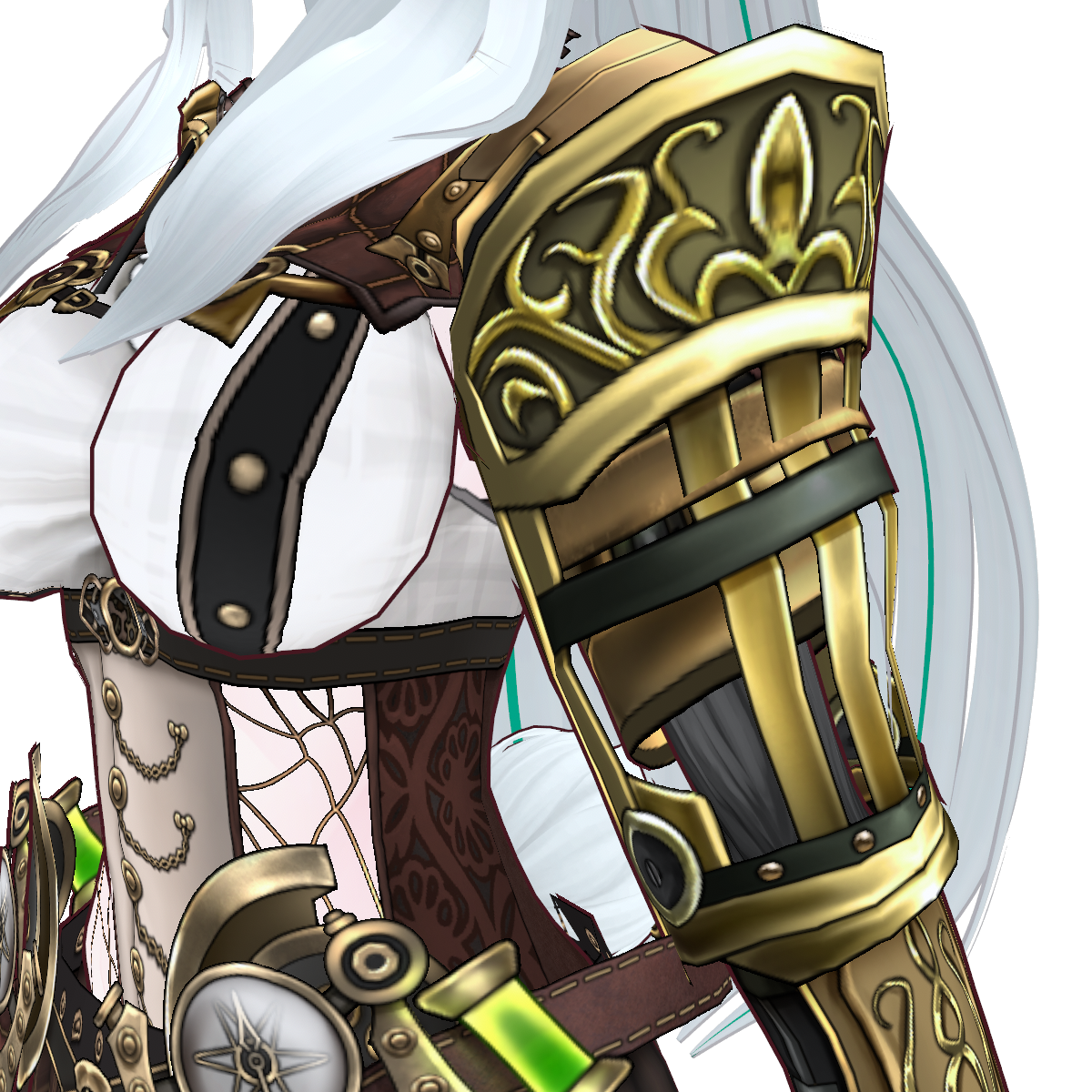 肌が露出している部分があります。露出部分にはレースのようなディテールがあしらわれています。重たい衣装なので肌とのバランスで重くなりすぎないようにしてください。左右で腕の装飾が違います。