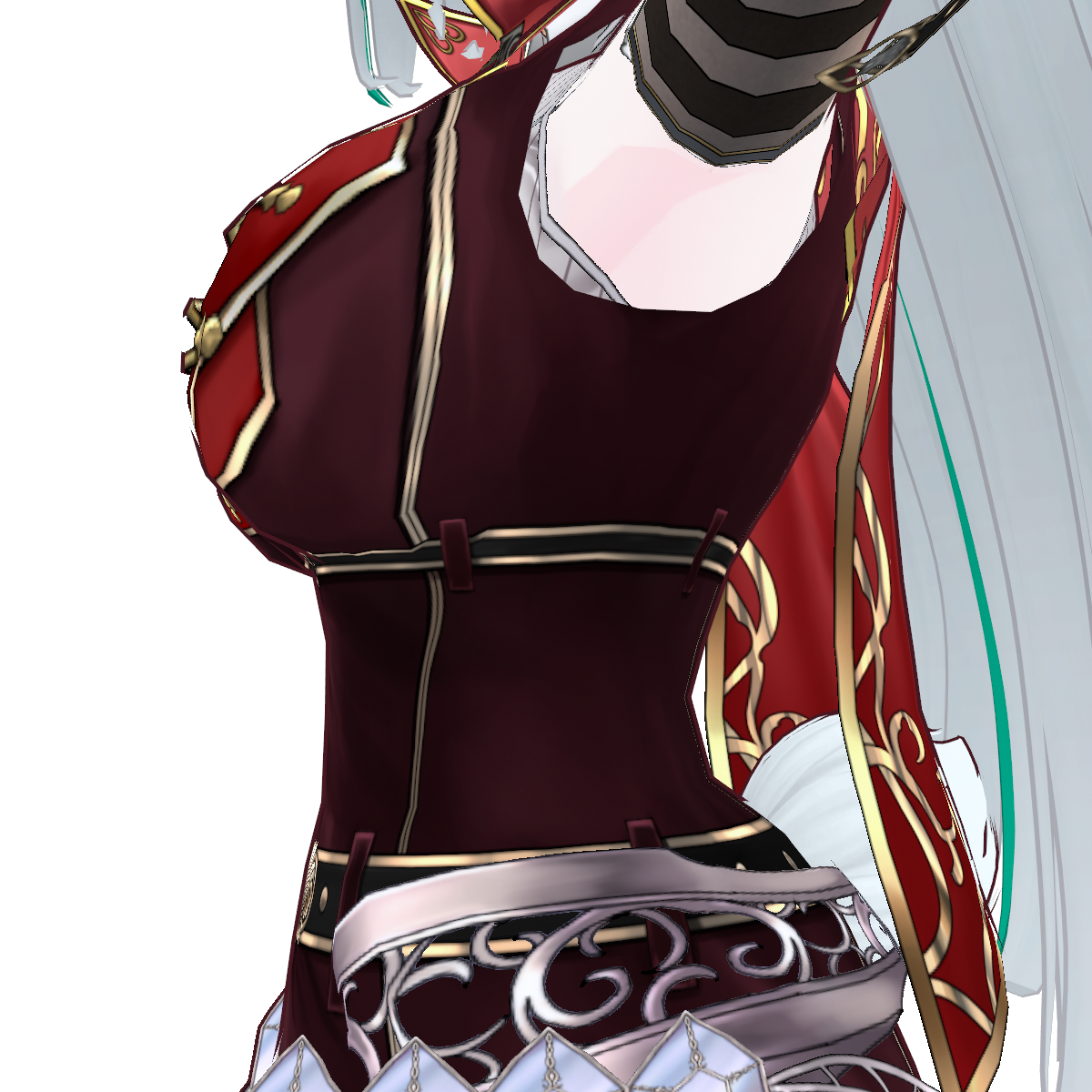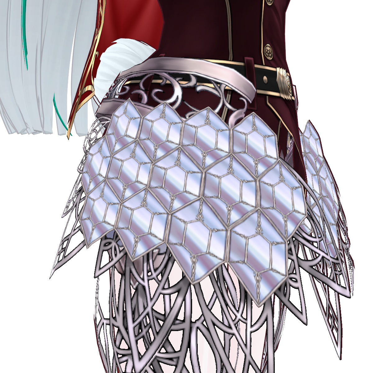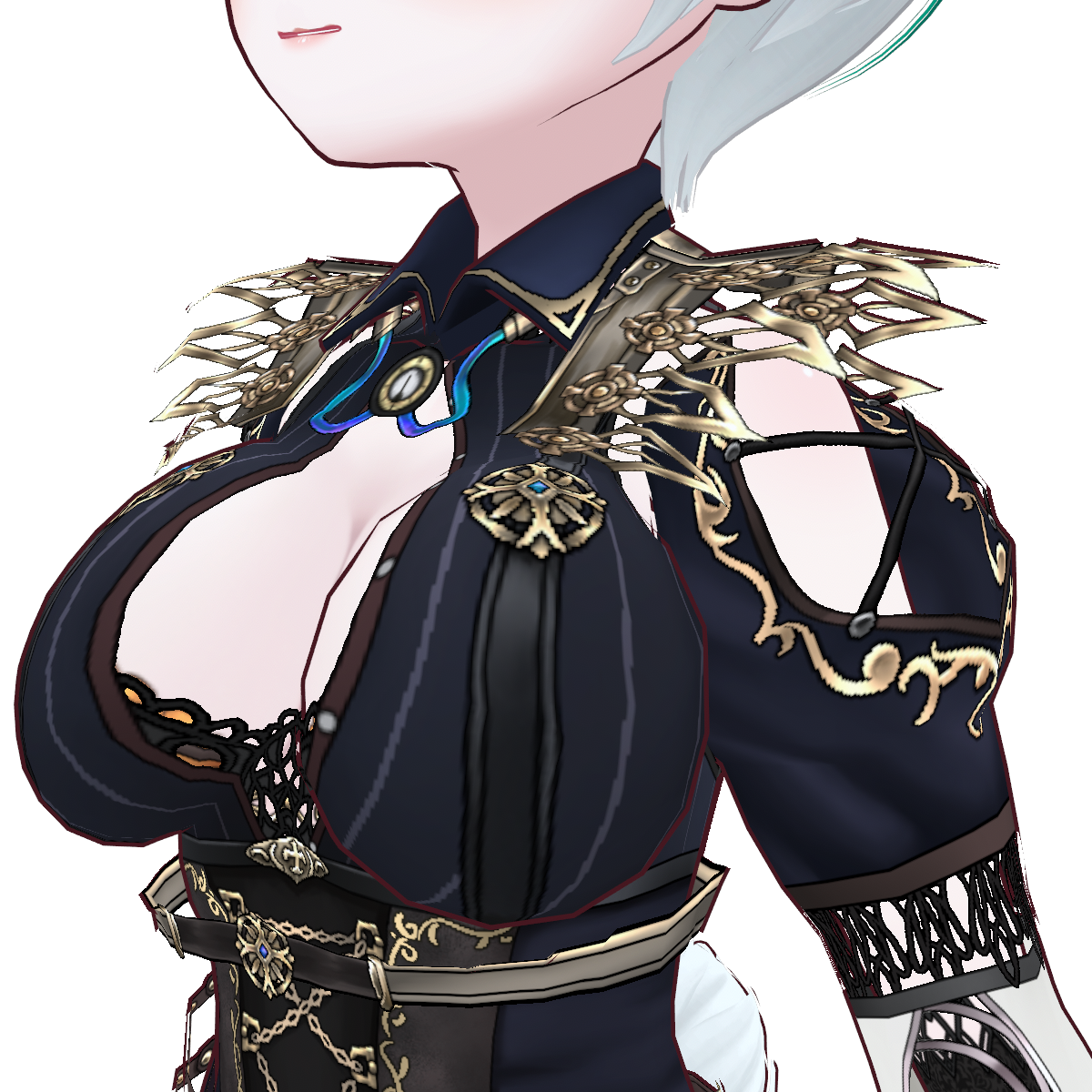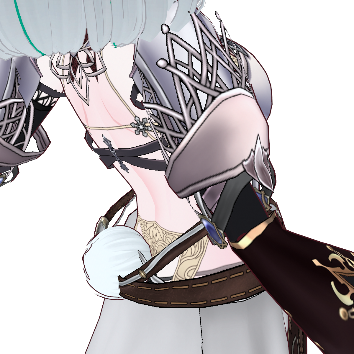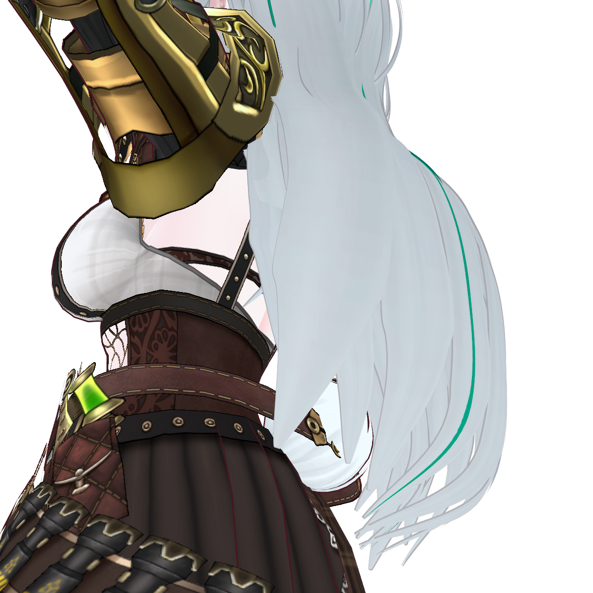 肌が露出している部分があります。露出部分にはレースのようなディテールがあしらわれています。重たい衣装なので肌とのバランスで重くなりすぎないようにしてください。左右で腕の装飾が違います。