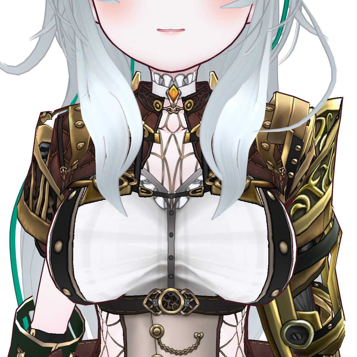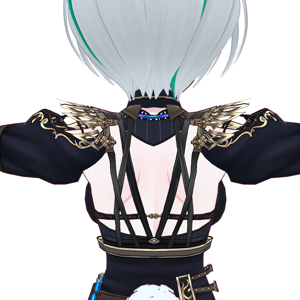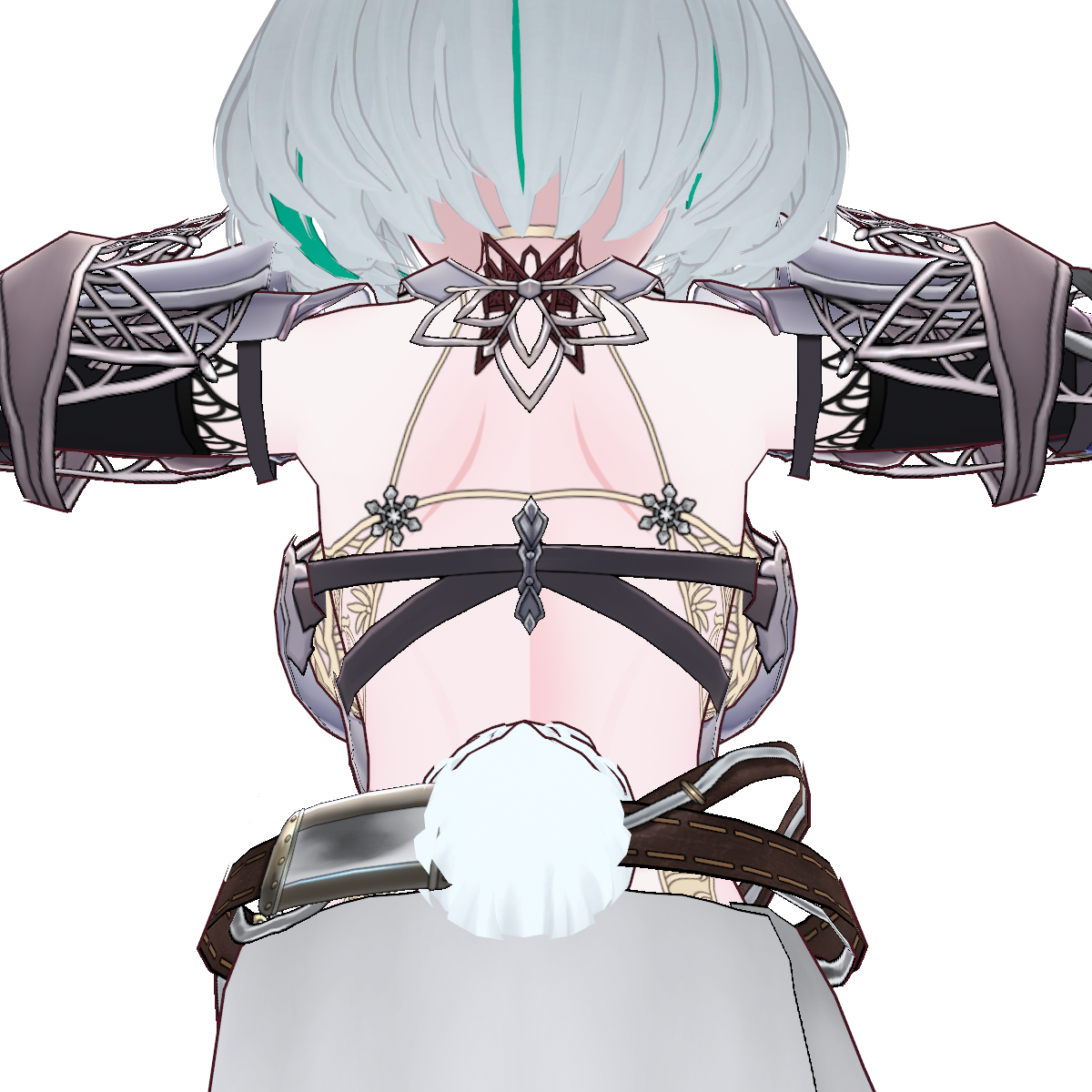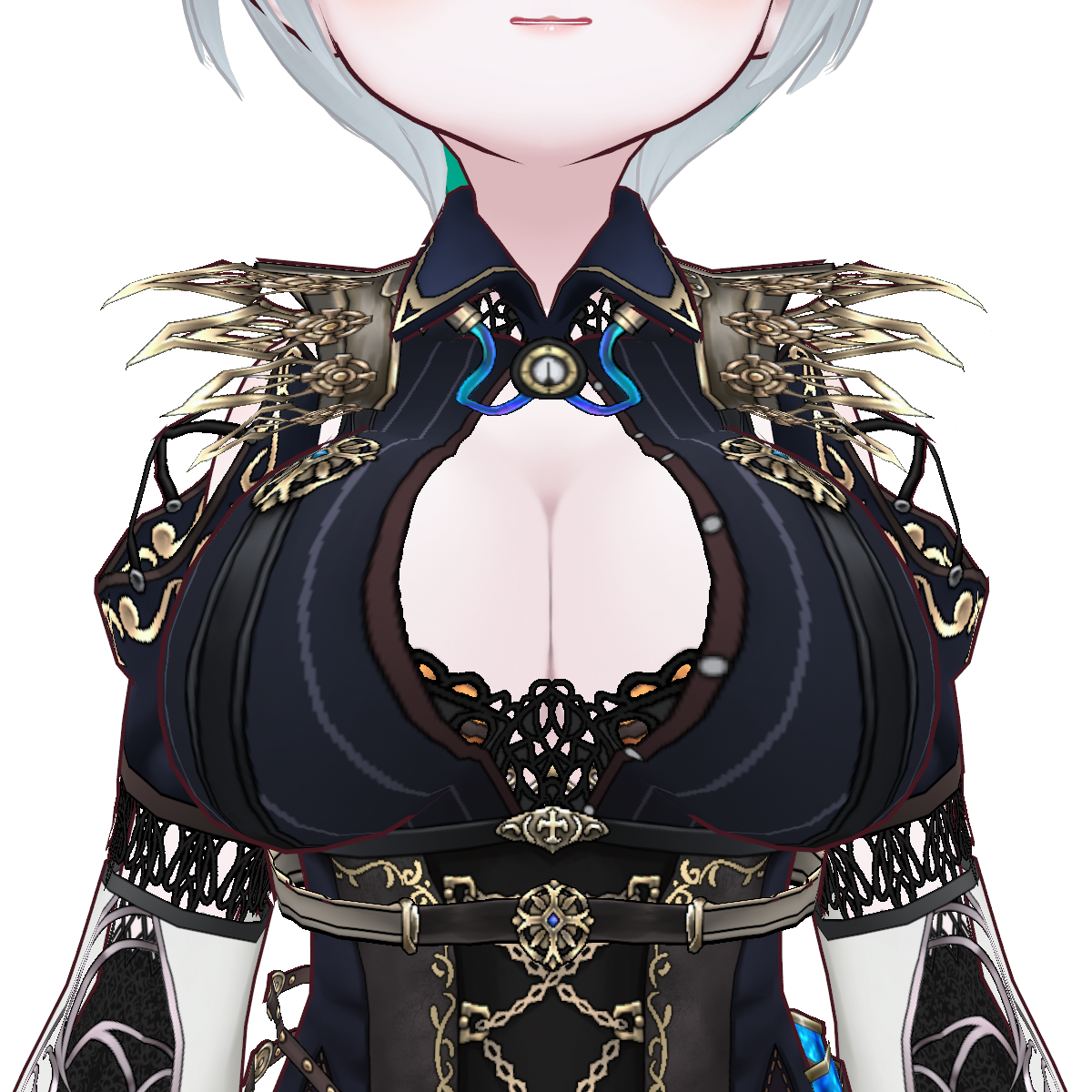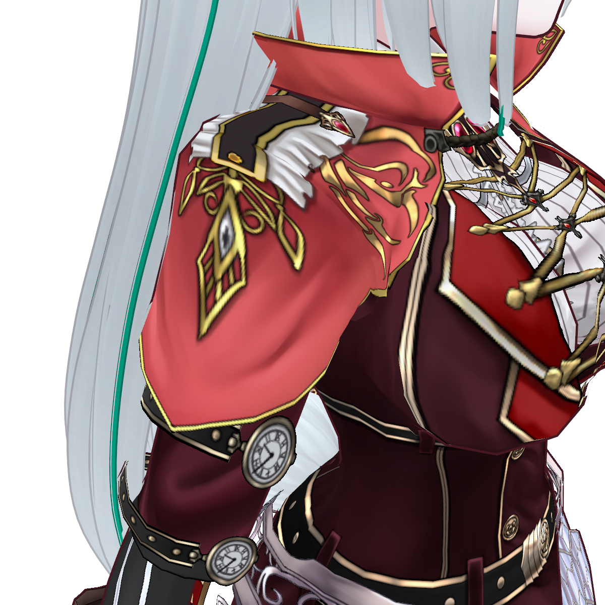 肌が露出している部分があります。露出部分にはレースのようなディテールがあしらわれています。重たい衣装なので肌とのバランスで重くなりすぎないようにしてください。左右で腕の装飾が違います。