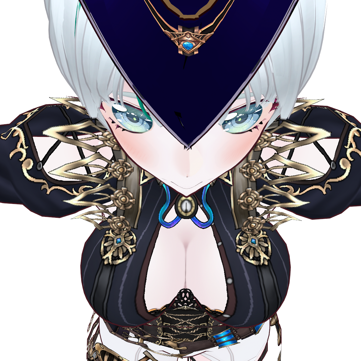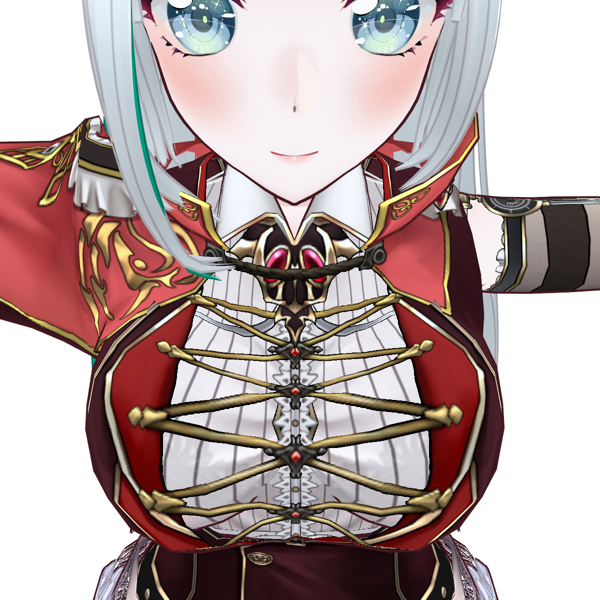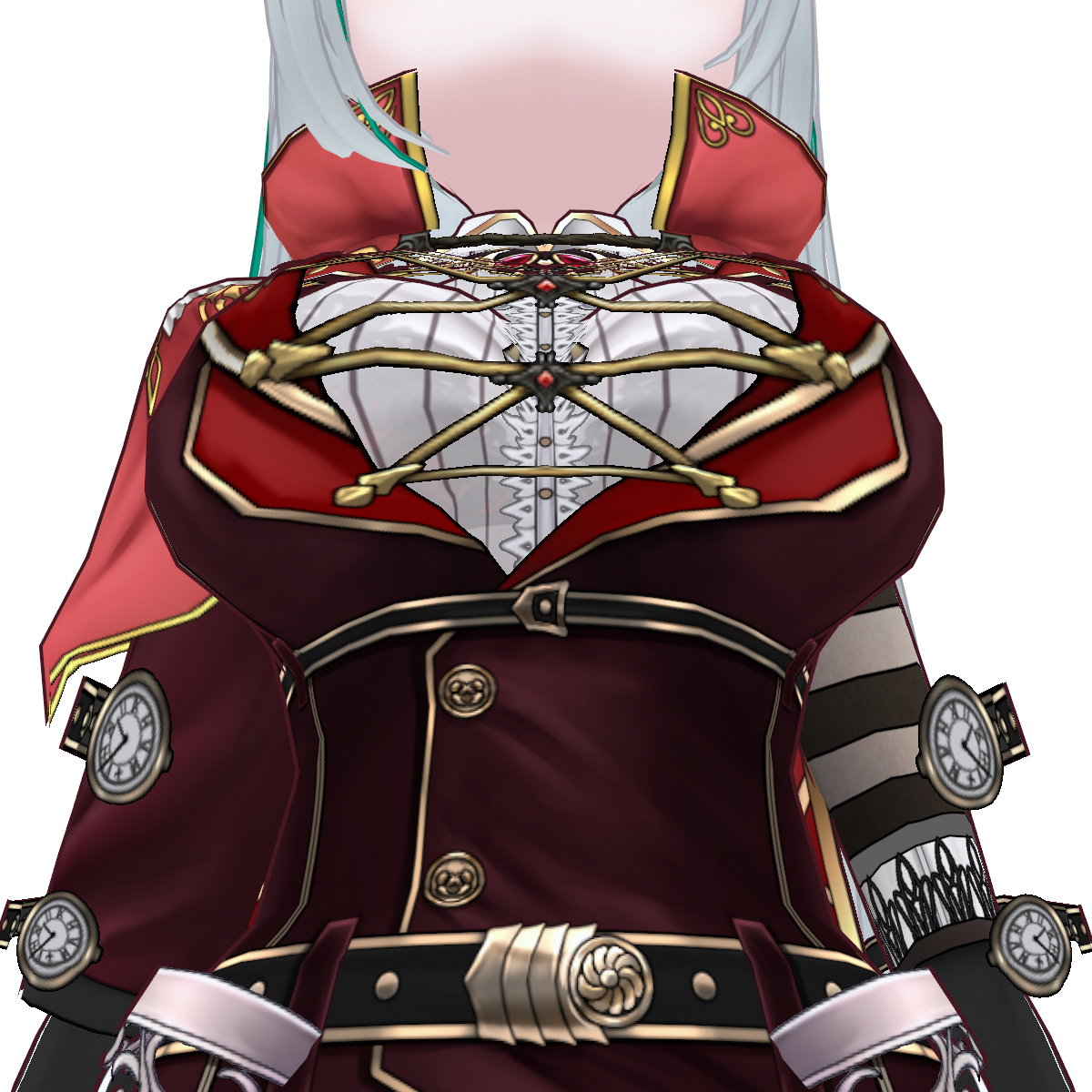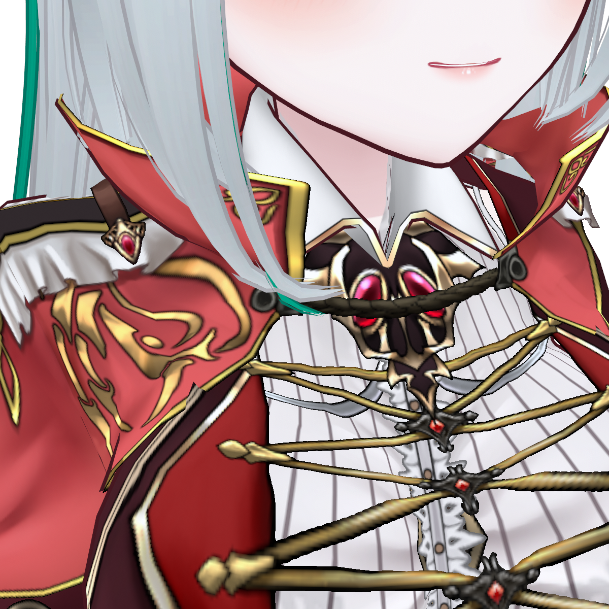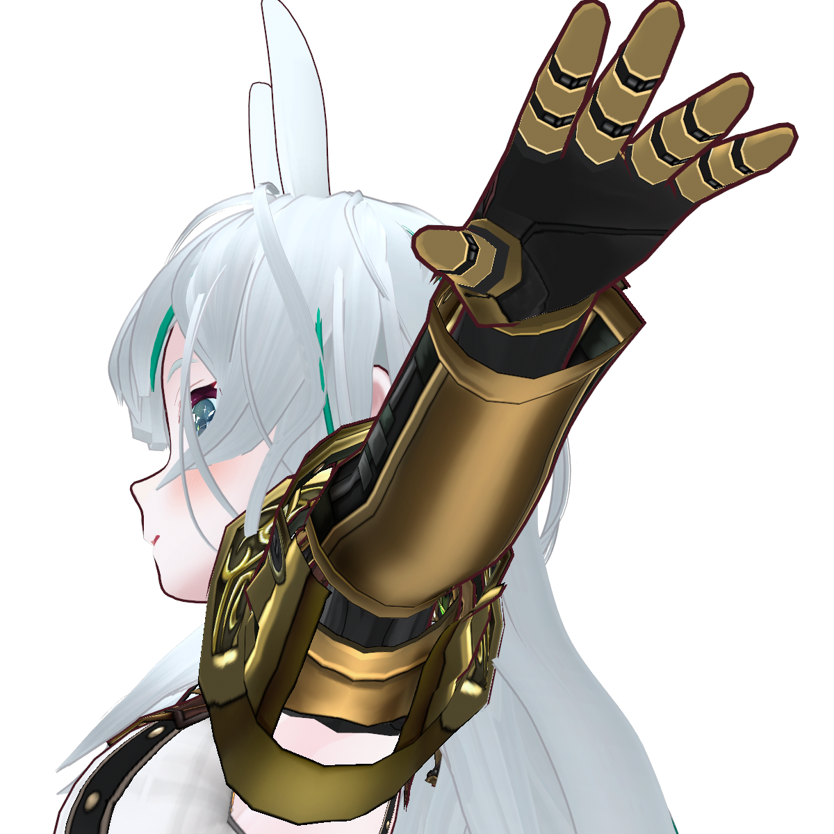 肌が露出している部分があります。露出部分にはレースのようなディテールがあしらわれています。重たい衣装なので肌とのバランスで重くなりすぎないようにしてください。左右で腕の装飾が違います。