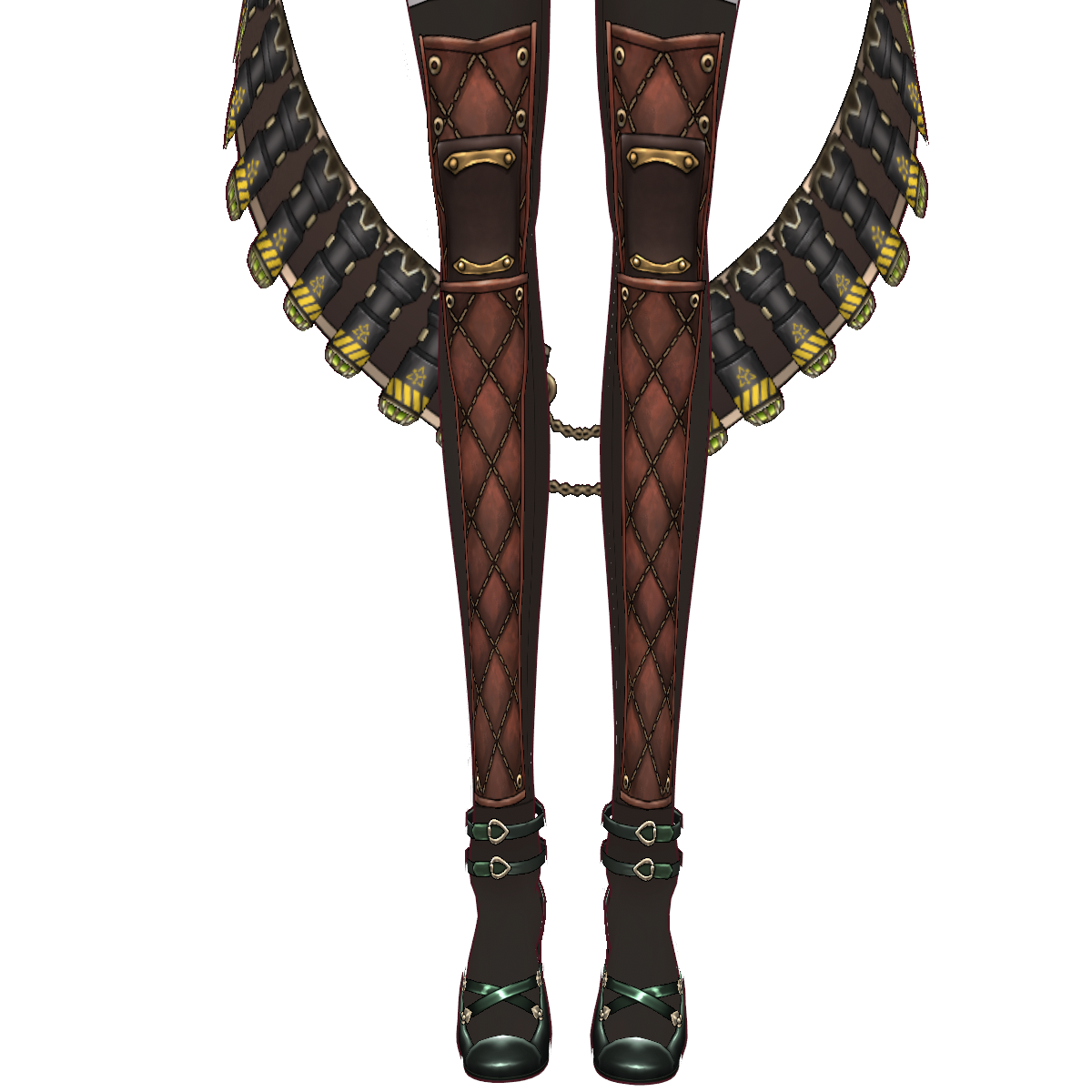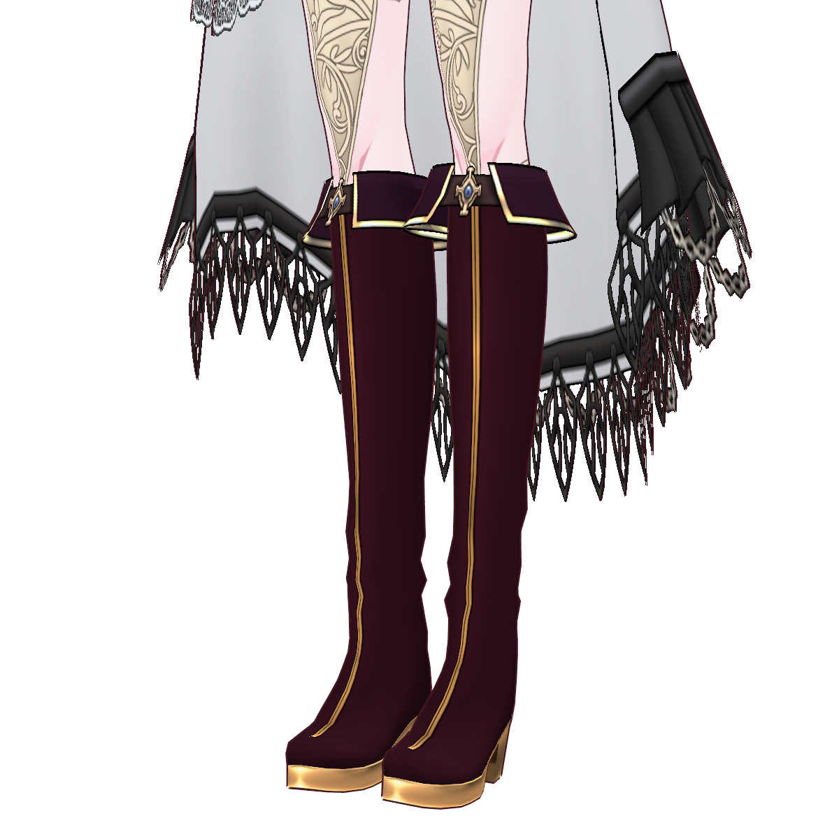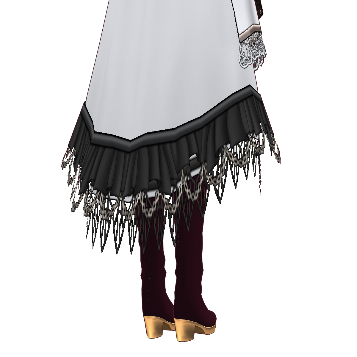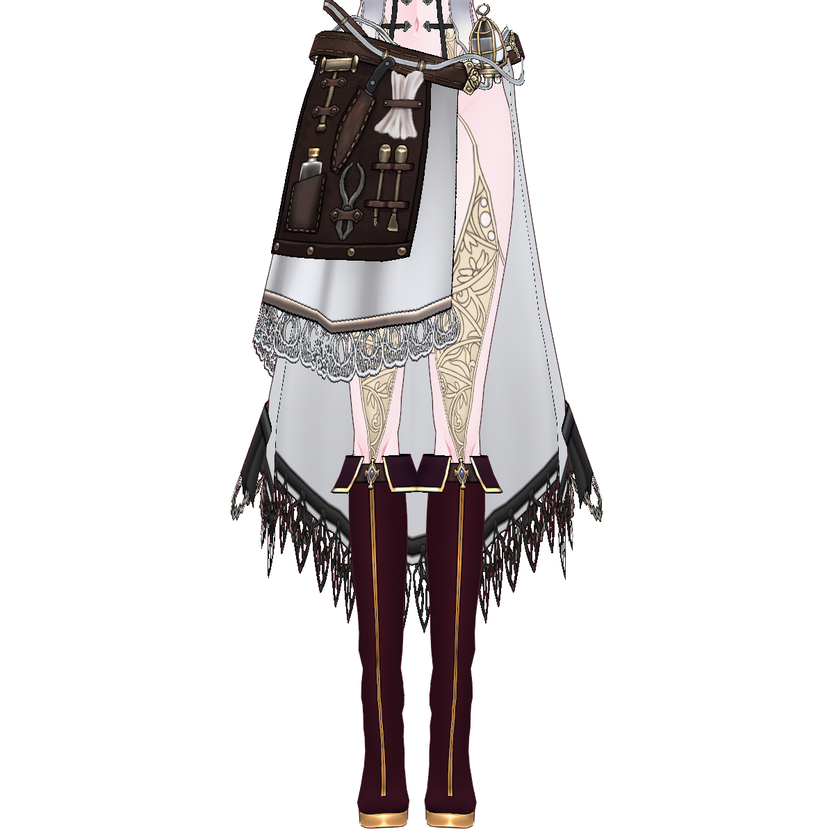 膝上丈のロングの革ブーツを履いています。腰巻は裾にレースデザインが施されており豪華になっています。腰布はアシンメトリーのレイヤードデザインになっています。