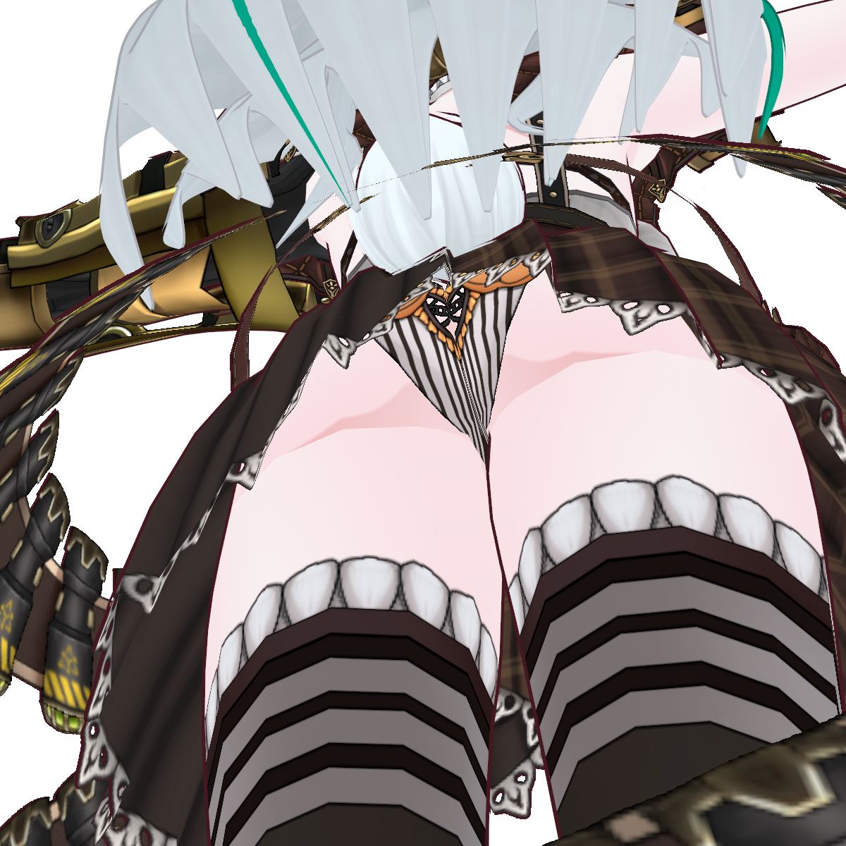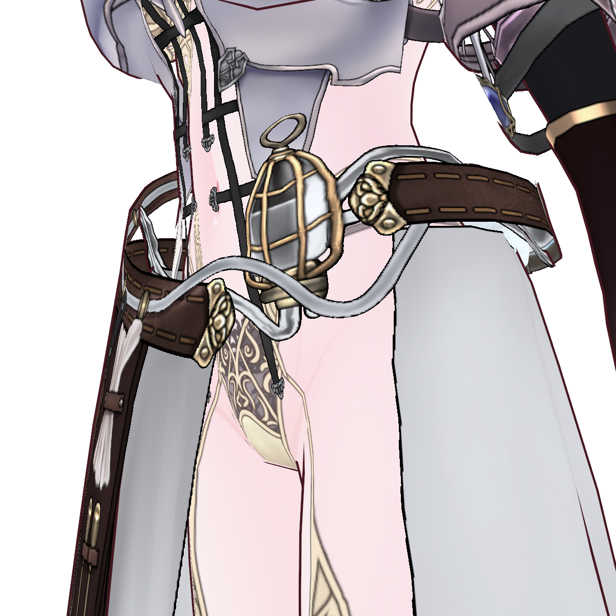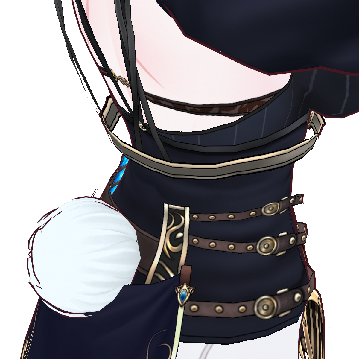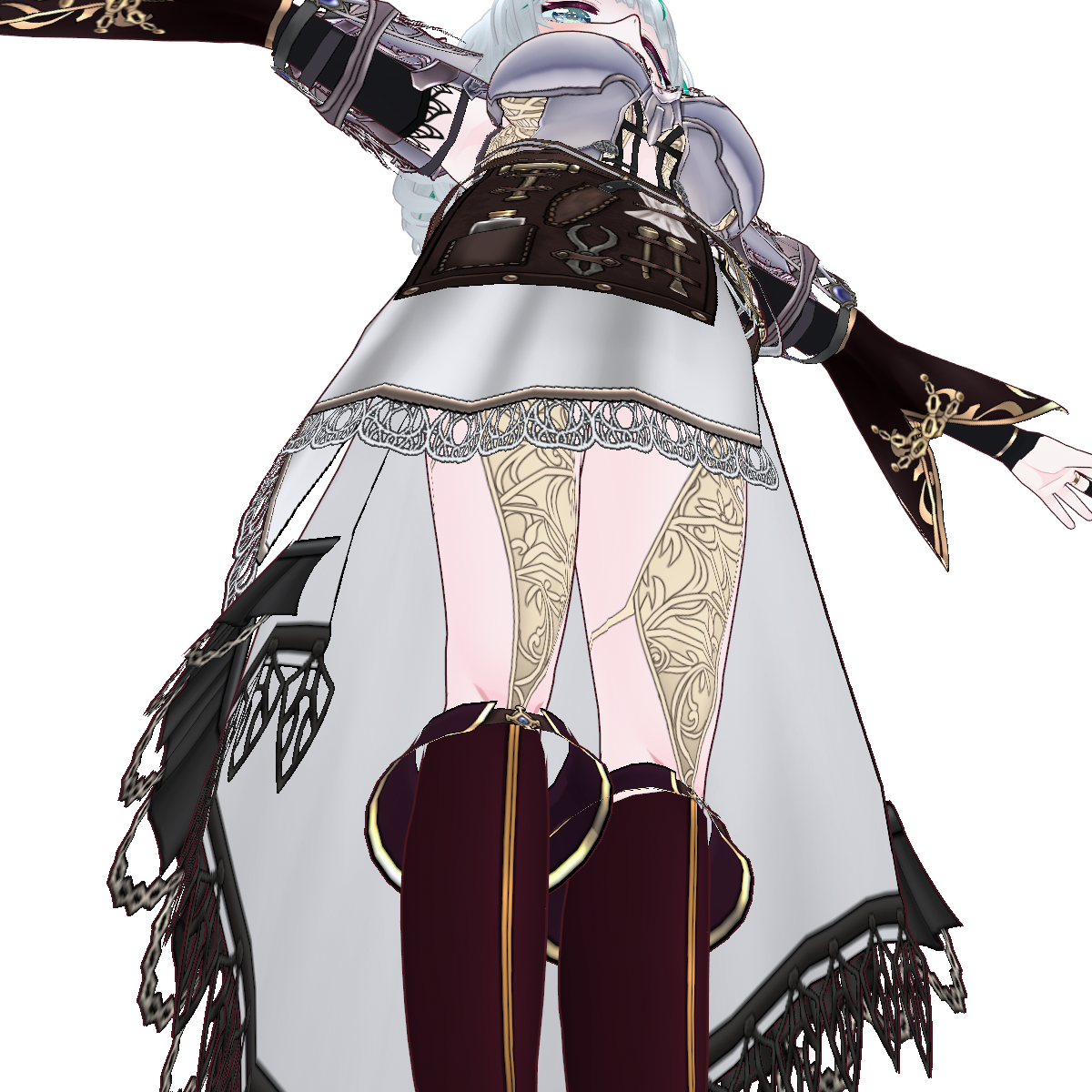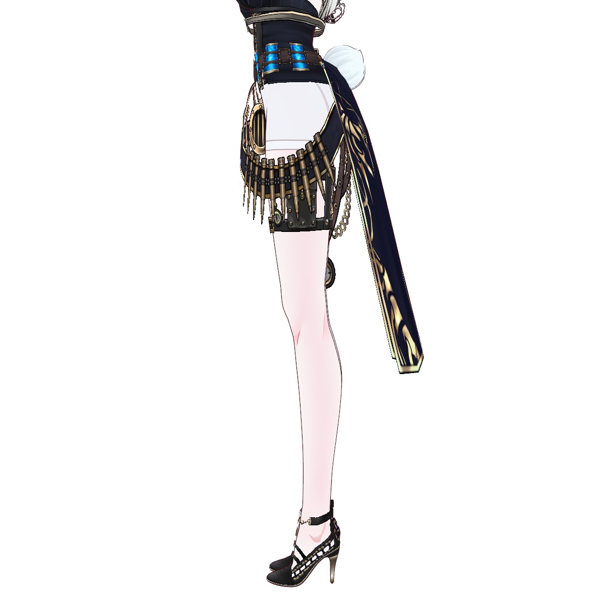 膝上丈のロングの革ブーツを履いています。腰巻は裾にレースデザインが施されており豪華になっています。腰布はアシンメトリーのレイヤードデザインになっています。
