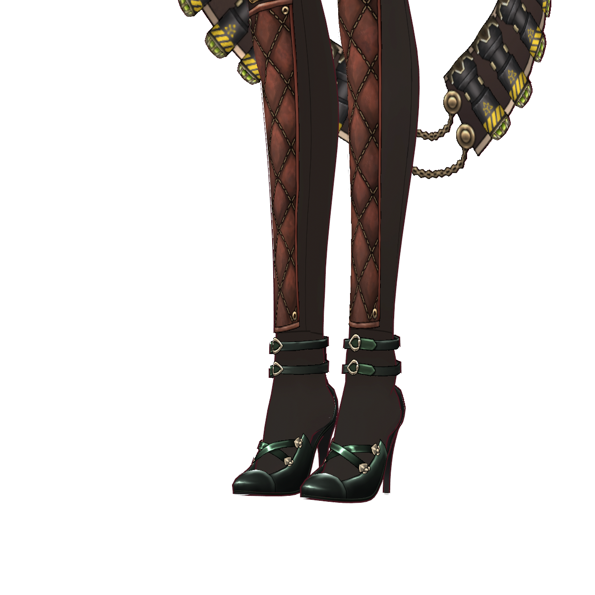 ペンシル型のミニスカートでサイドスリットが入っており、緑色が見えています。ガーターベルトを着けており、ソックス(網タイツ)は左右でデザインが違います。靴はくるみボタンのついたヒールです。