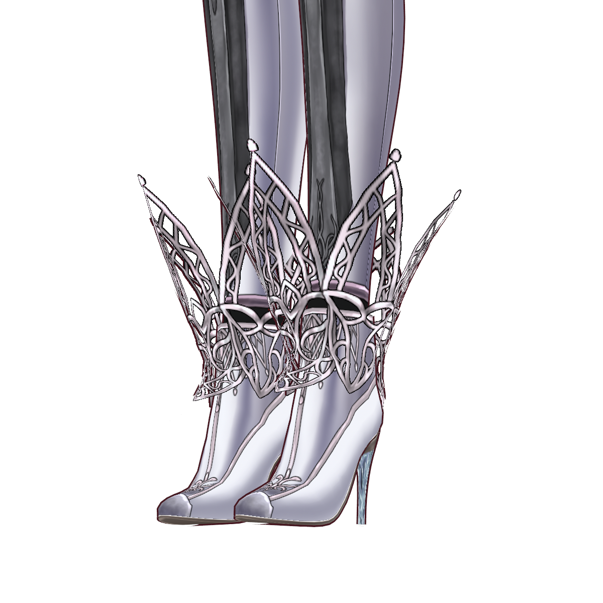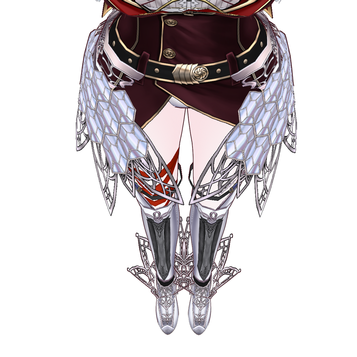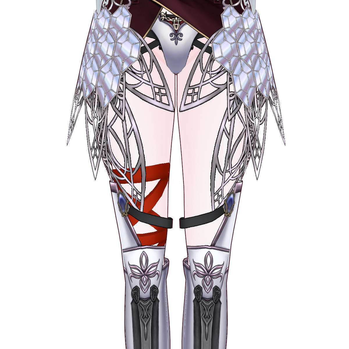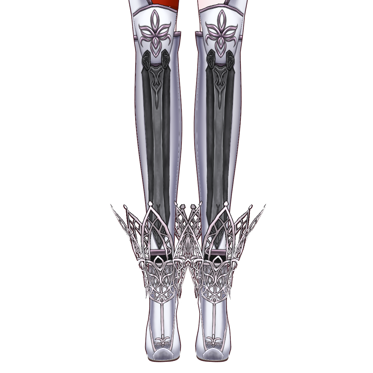 向かって左側の足には赤いリボンの装飾をまとっています。ニーハイ丈の甲冑を履いています。ヒールパンプスも鋼鉄仕様で花びらのような飾りがついています。