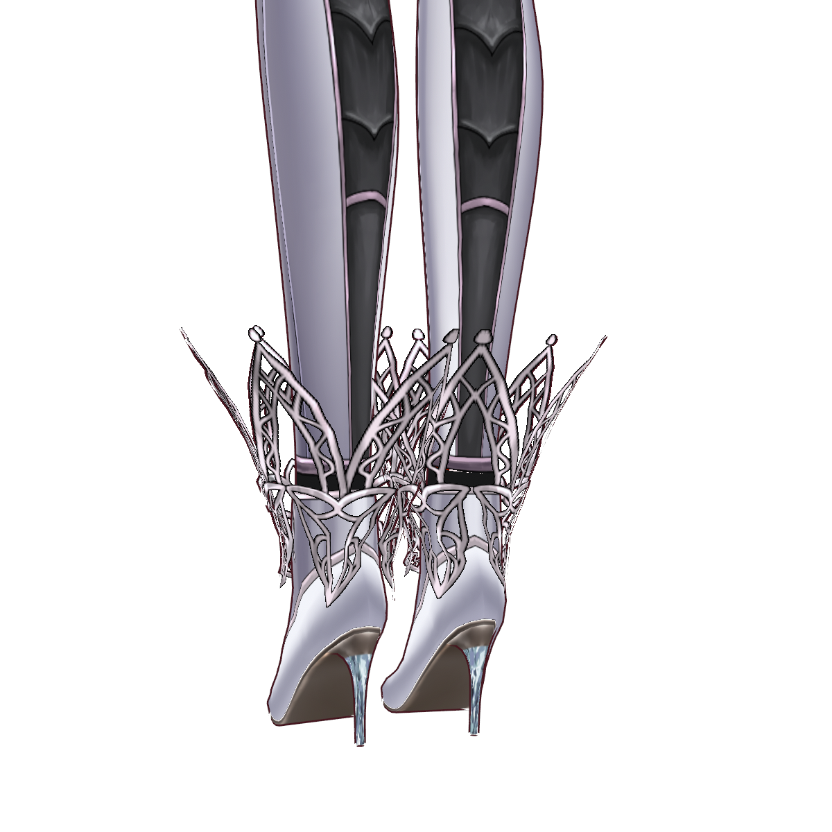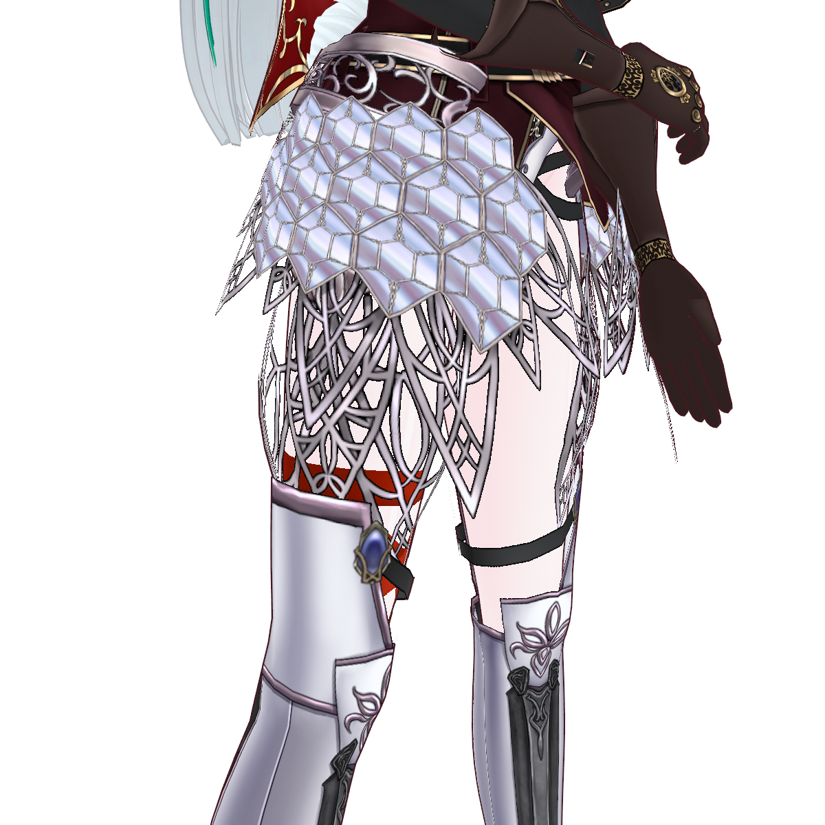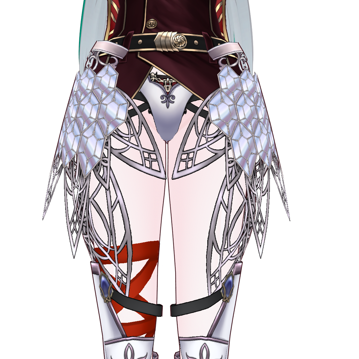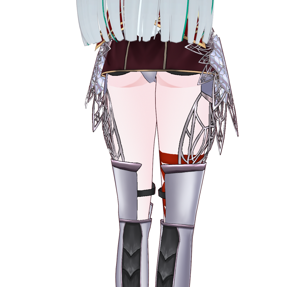 向かって左側の足には赤いリボンの装飾をまとっています。ニーハイ丈の甲冑を履いています。ヒールパンプスも鋼鉄仕様で花びらのような飾りがついています。