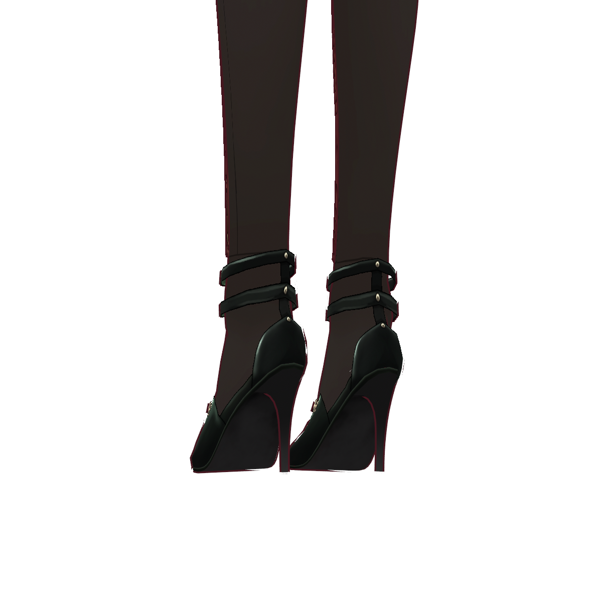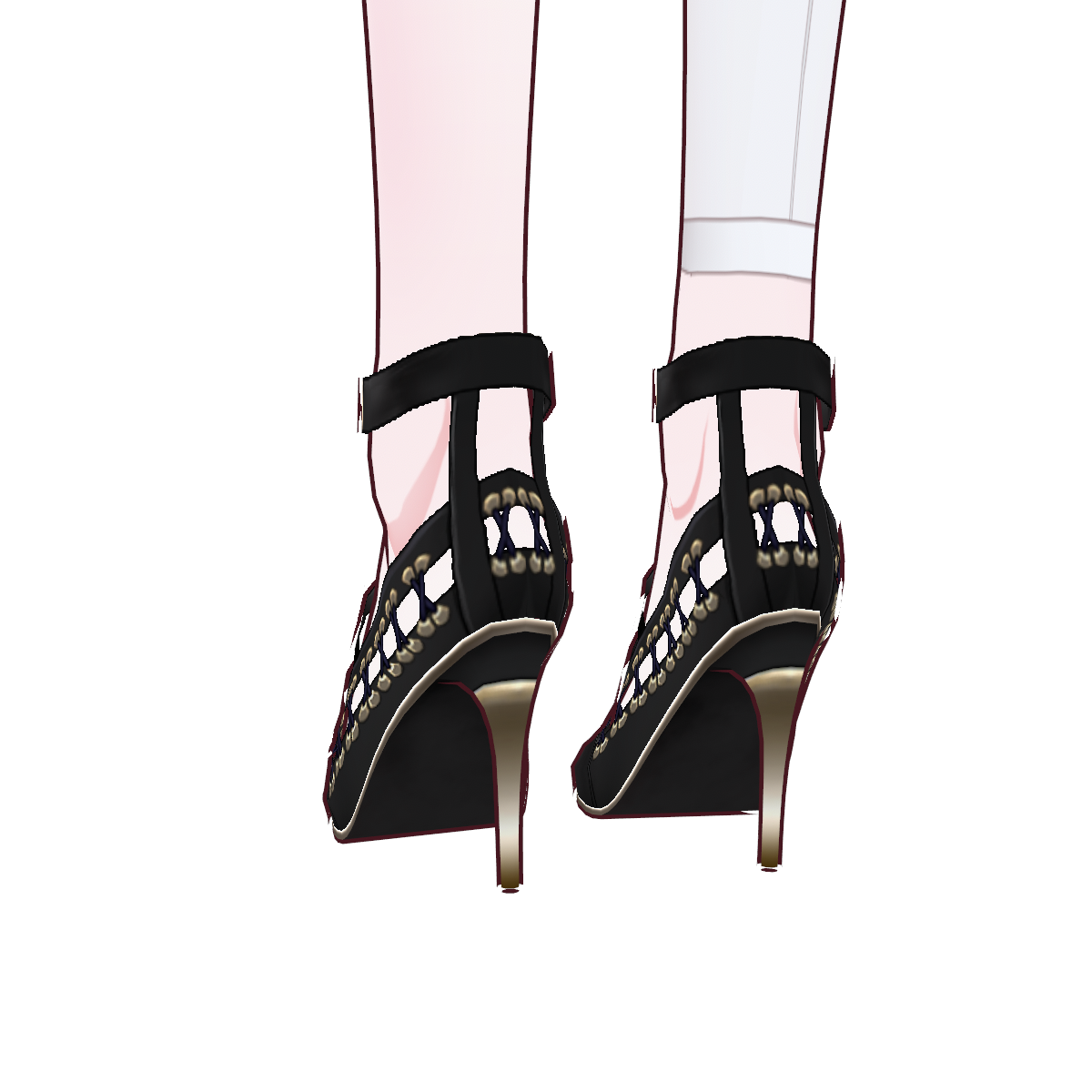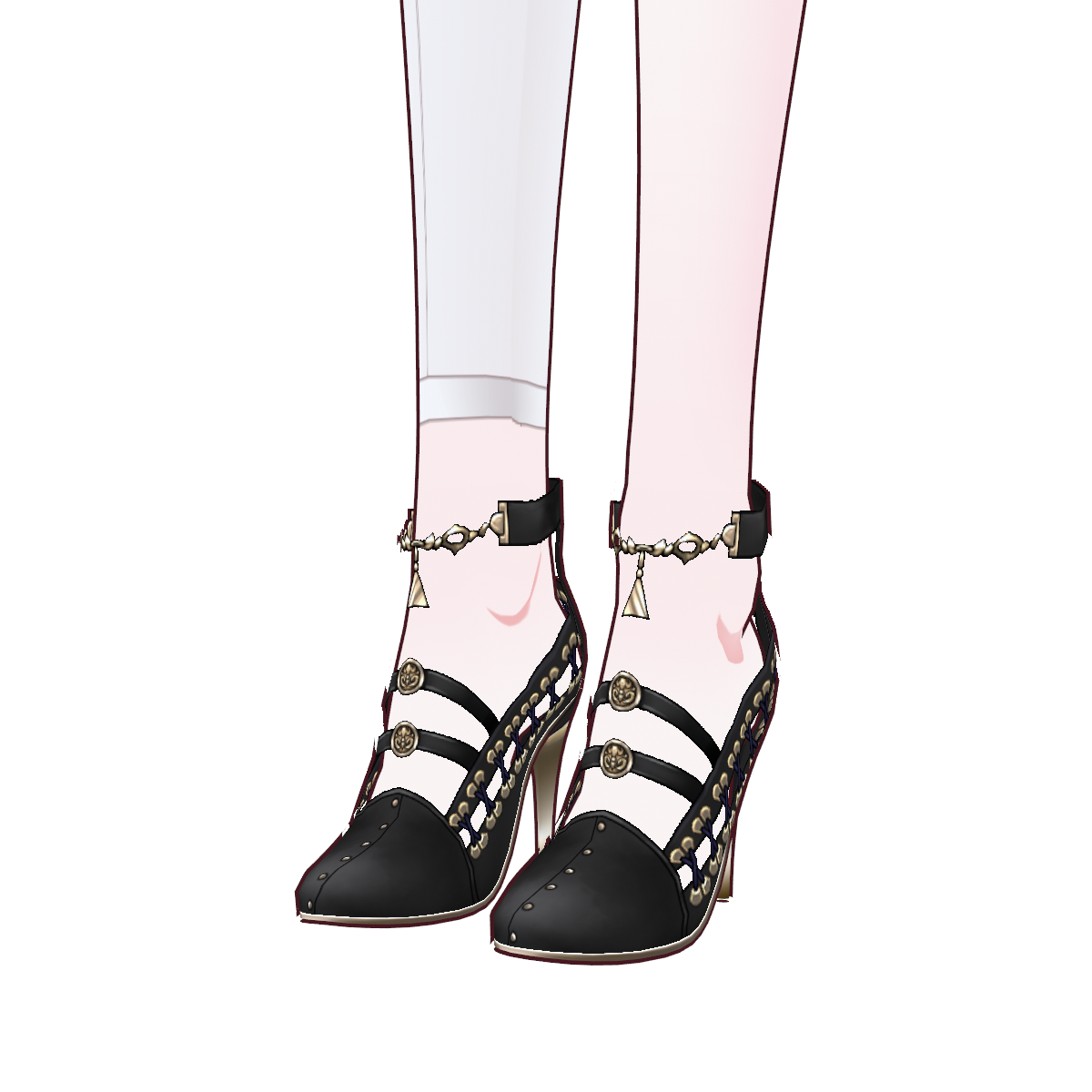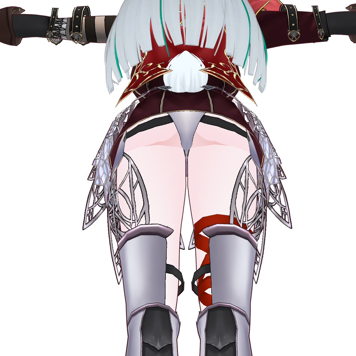 向かって左側の足には赤いリボンの装飾をまとっています。ニーハイ丈の甲冑を履いています。ヒールパンプスも鋼鉄仕様で花びらのような飾りがついています。