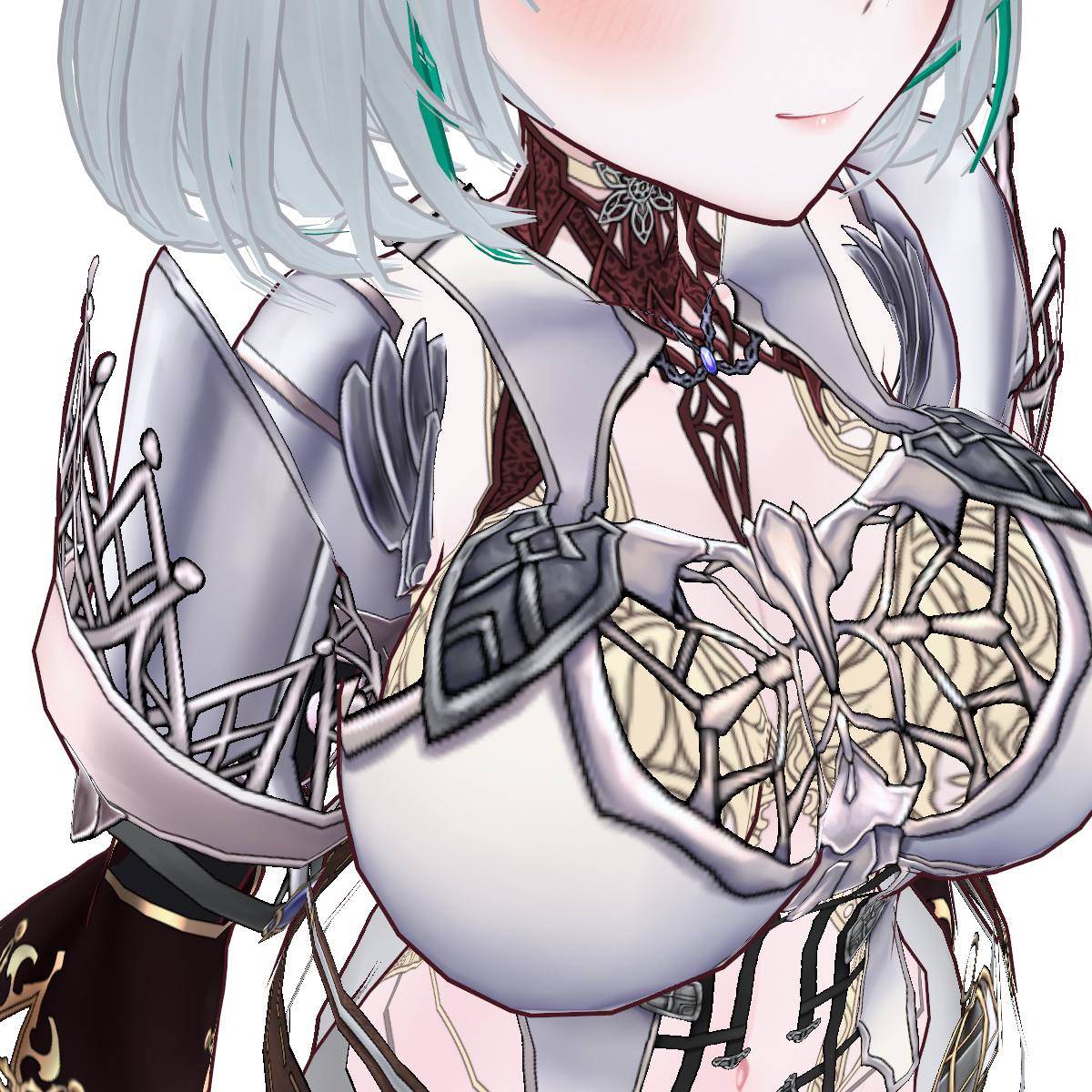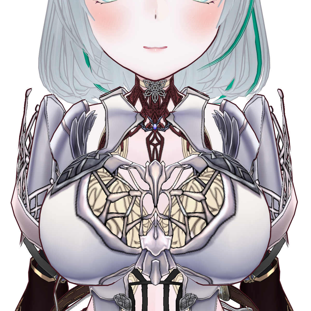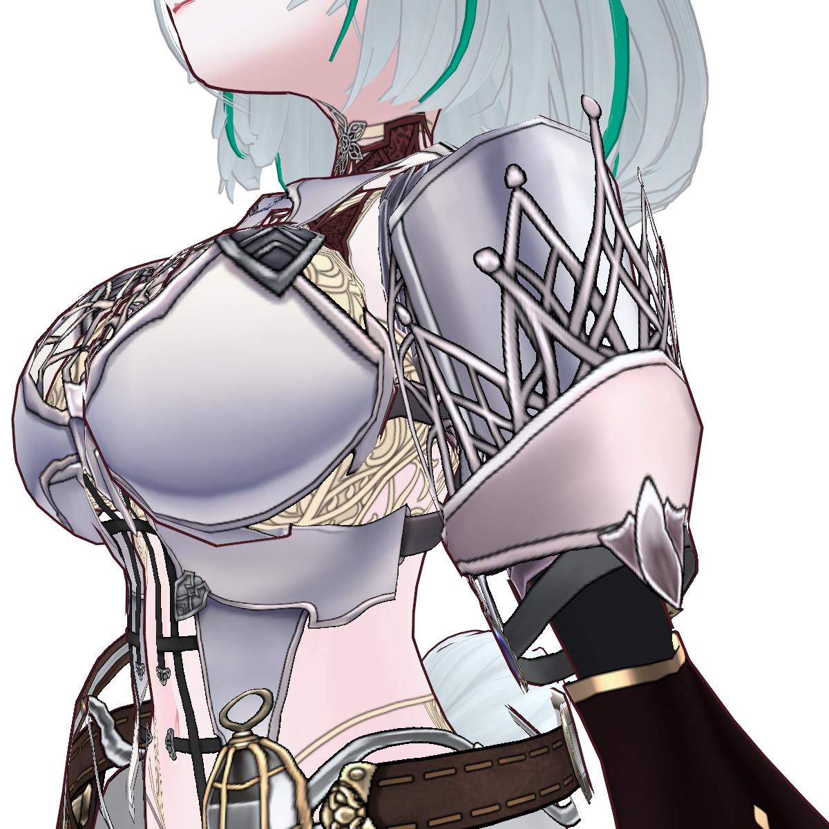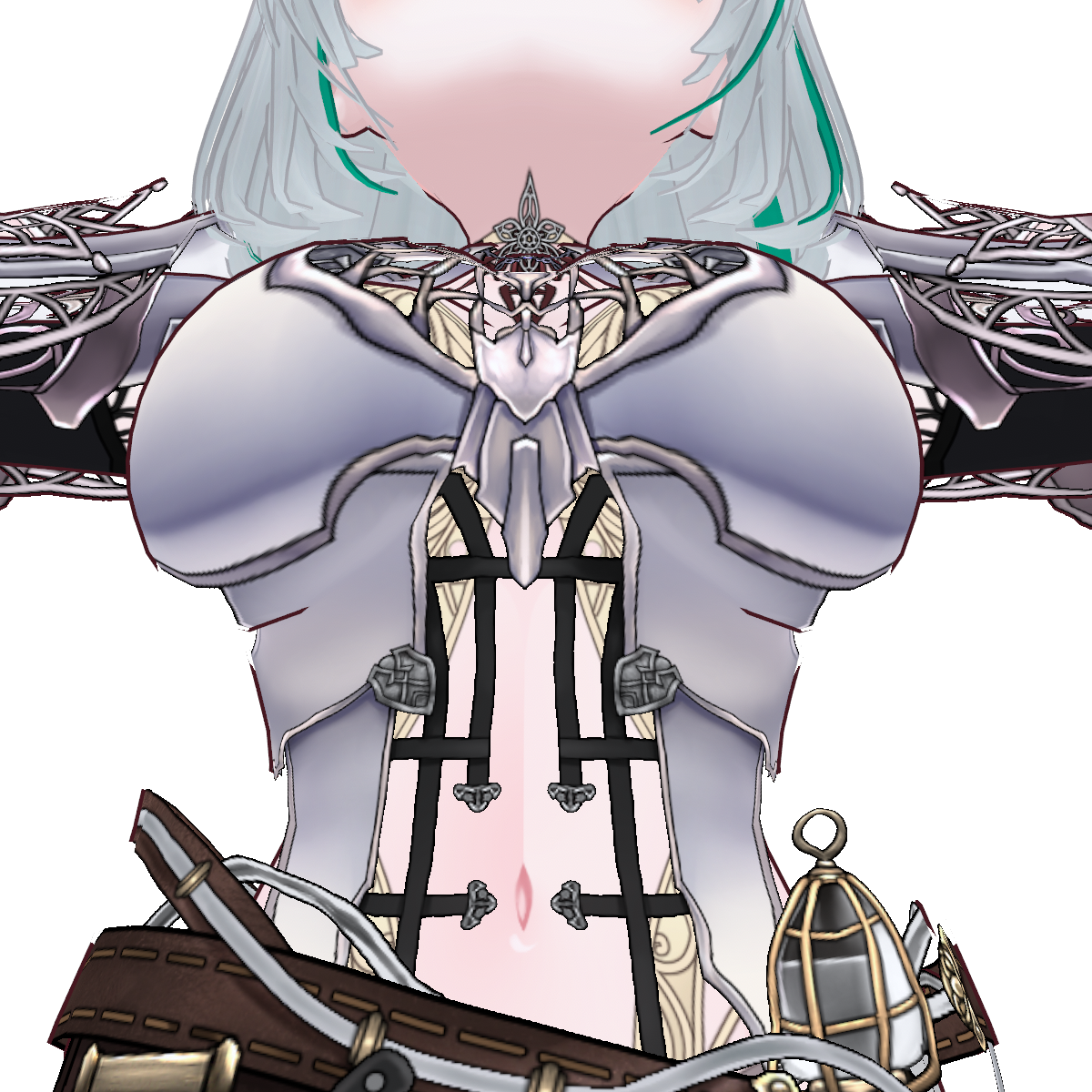 露出している肌に一部紋章のような装飾があります。鎧部分の素材感は重くなりすぎないライトシルバーくらいの色味です。現代的な金属素材です。