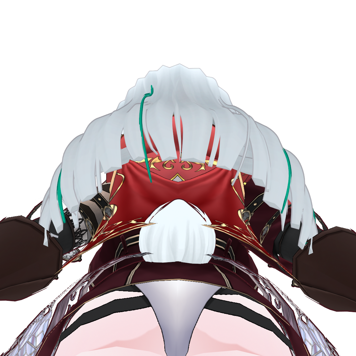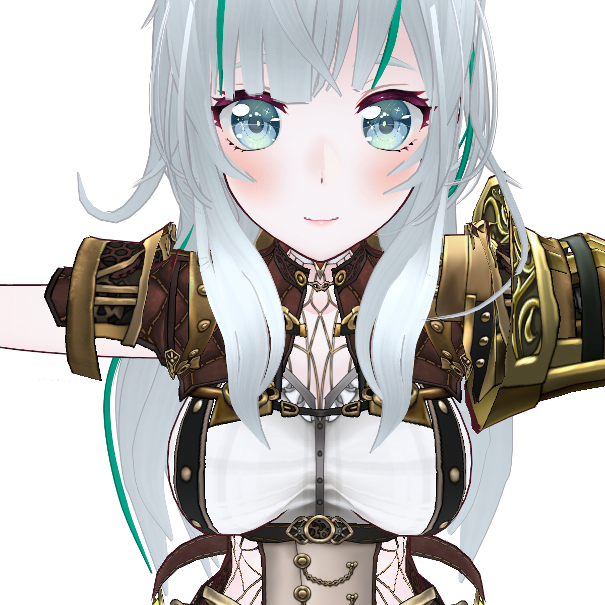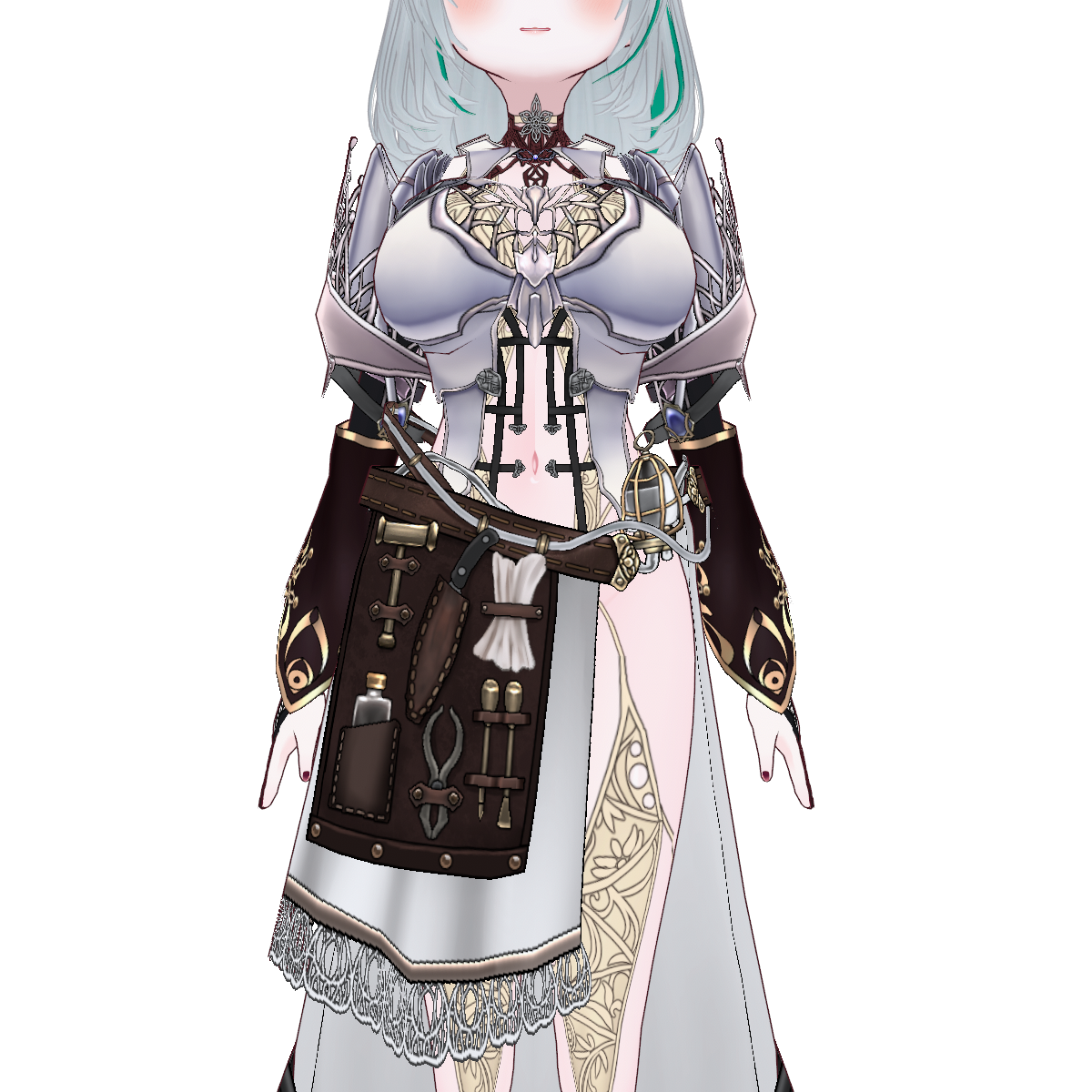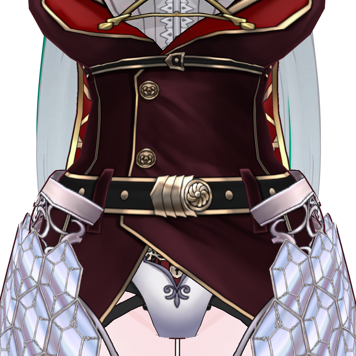 露出している肌に一部紋章のような装飾があります。鎧部分の素材感は重くなりすぎないライトシルバーくらいの色味です。現代的な金属素材です。