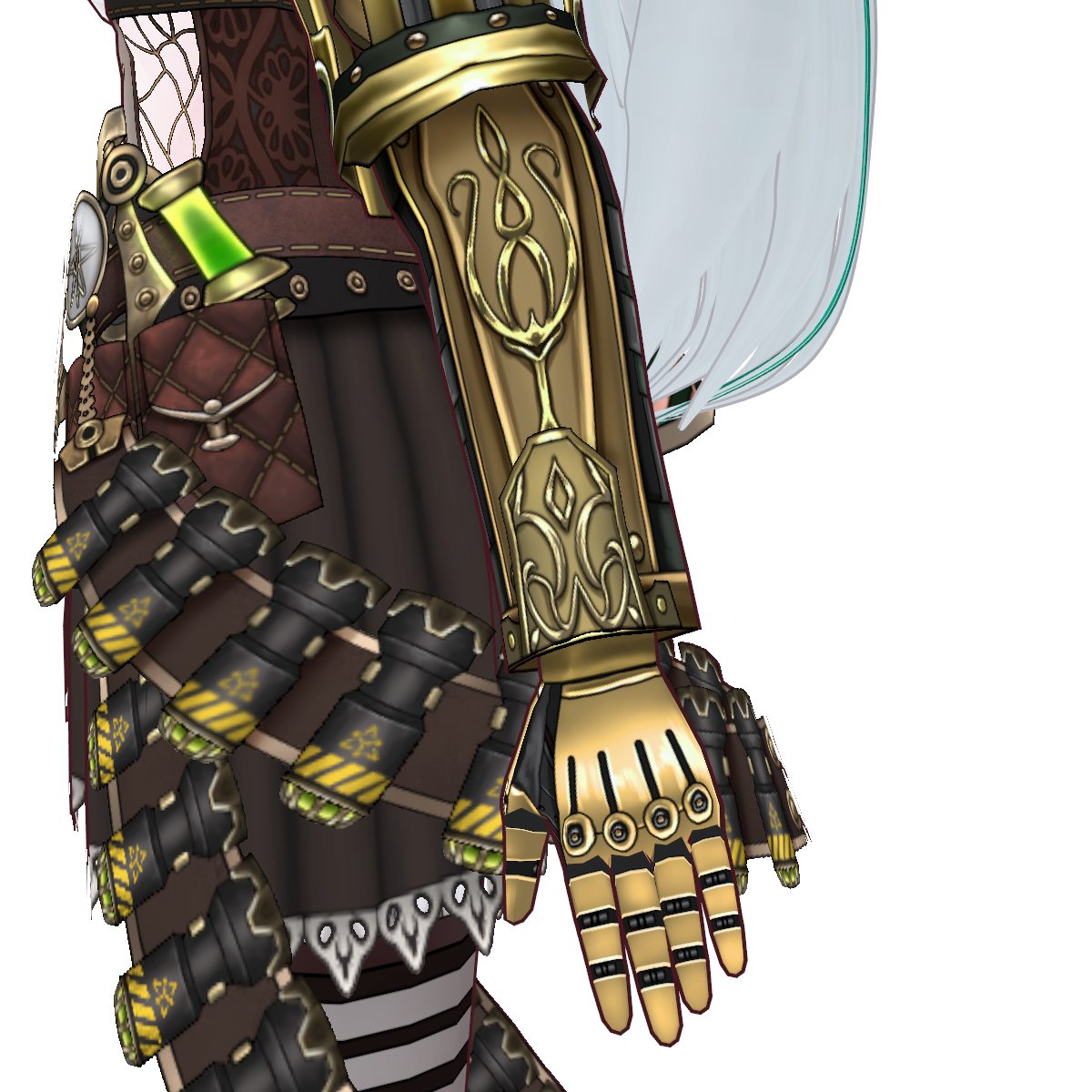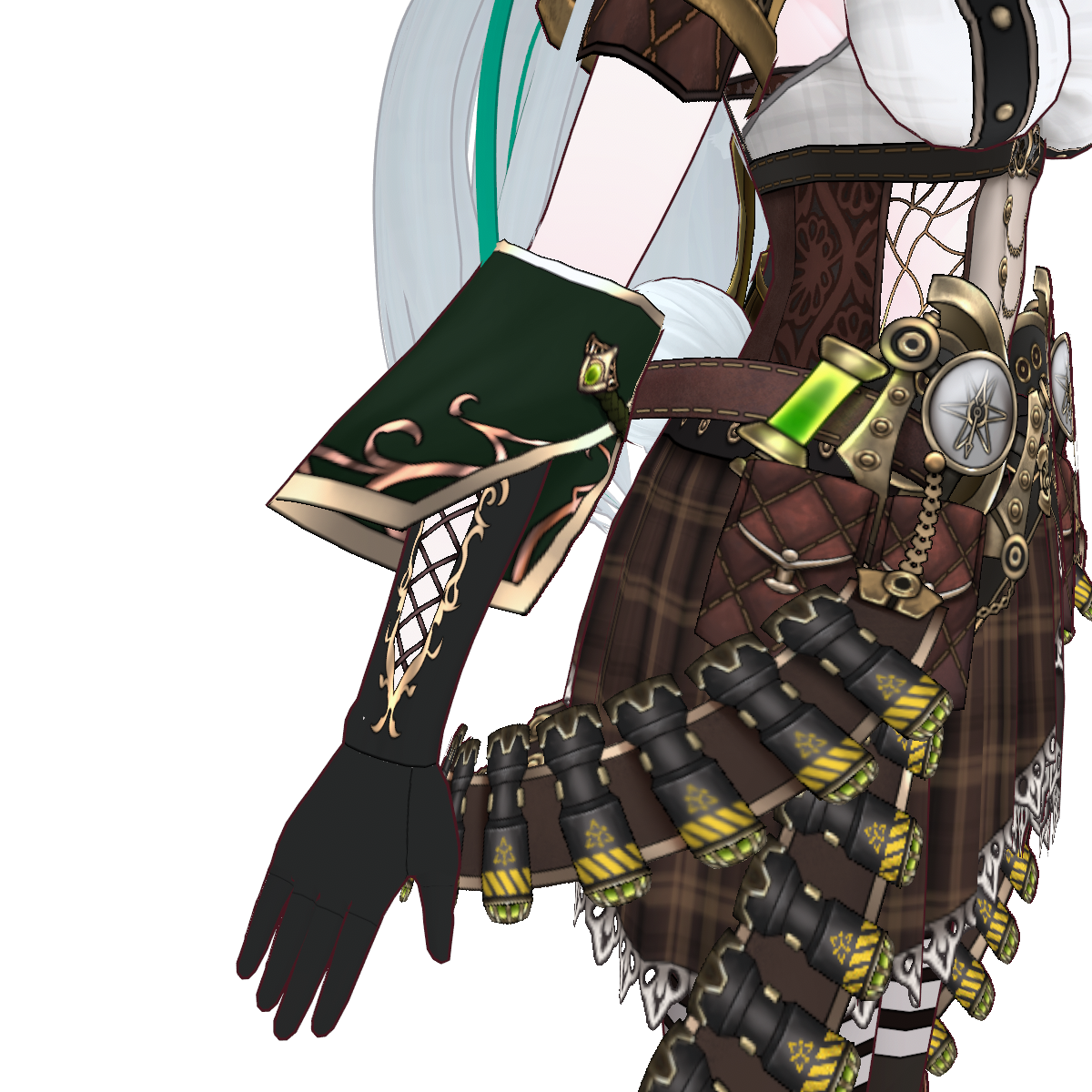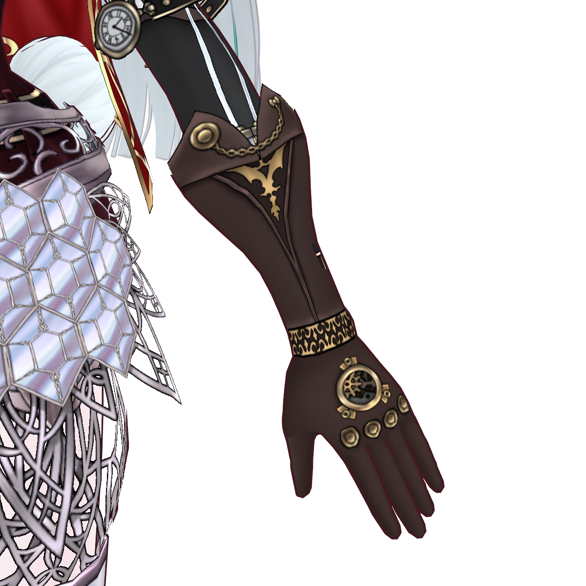 時計の巻き付いたようなデザインの腕の装飾と茶色の皮手袋を装着しています。腰回りは近未来的なプロテクション防具をまとっています。金属製のファールカップのような見せパンを履いています。トップスのジャケット丈はお尻が隠れ切らないくらいの丈です。