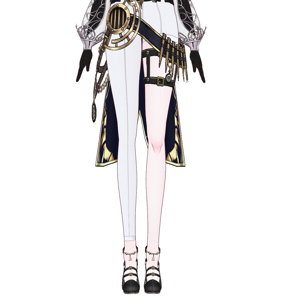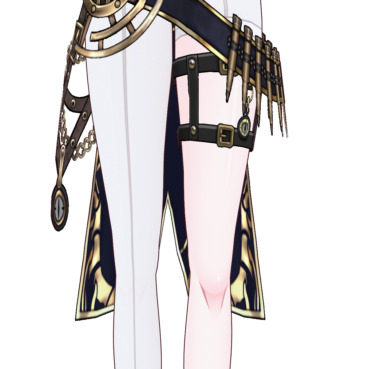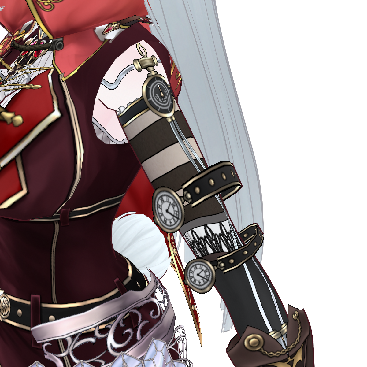 時計の巻き付いたようなデザインの腕の装飾と茶色の皮手袋を装着しています。腰回りは近未来的なプロテクション防具をまとっています。金属製のファールカップのような見せパンを履いています。トップスのジャケット丈はお尻が隠れ切らないくらいの丈です。