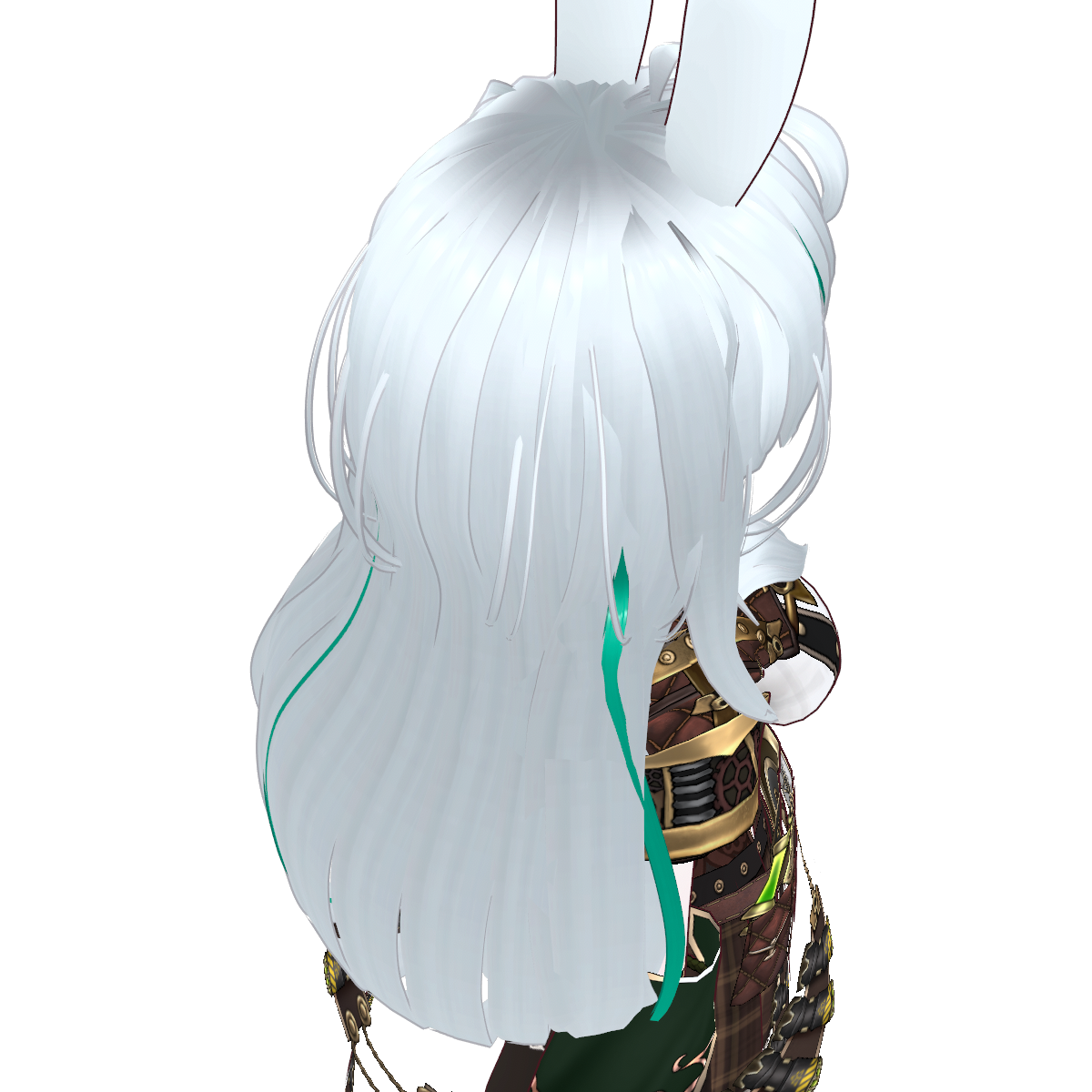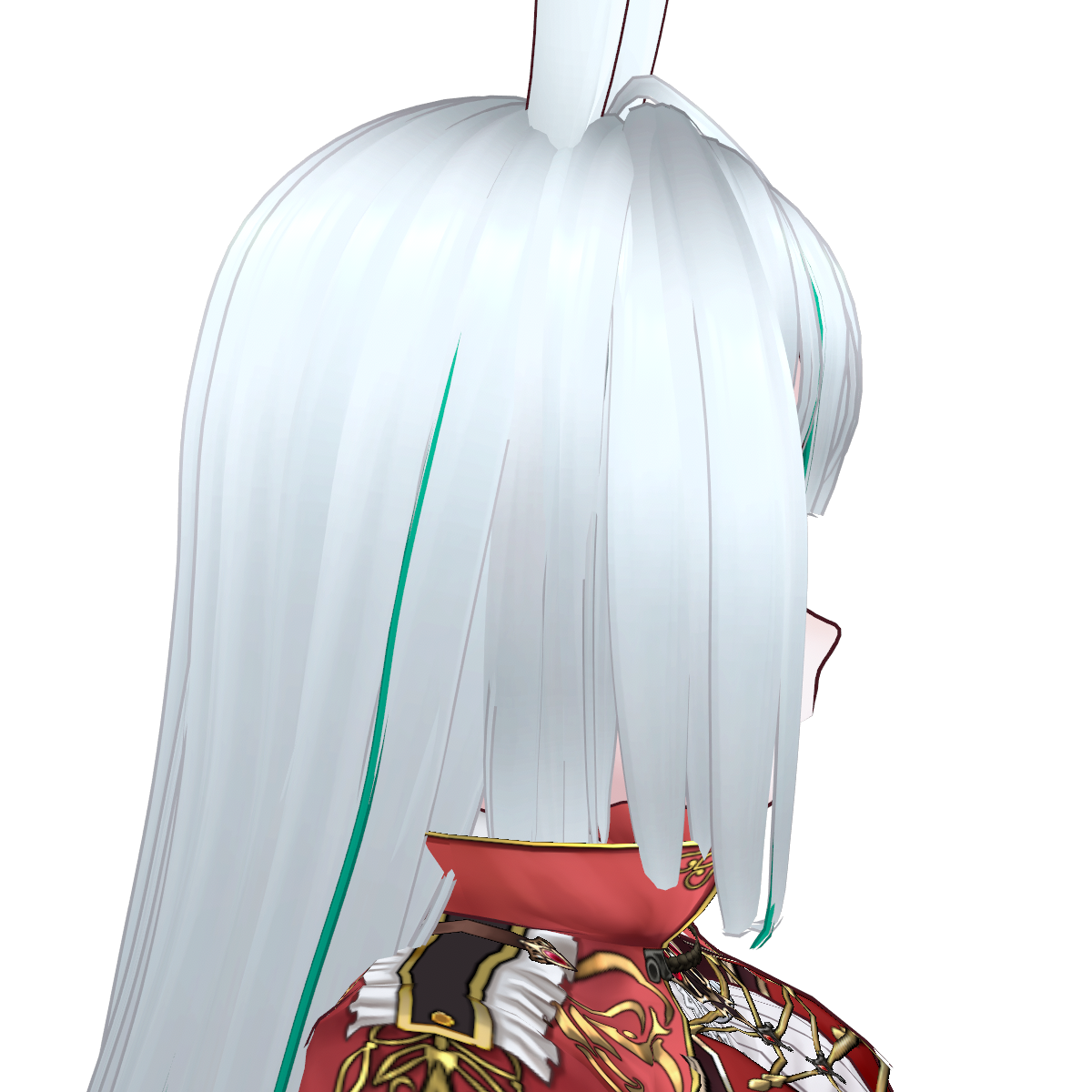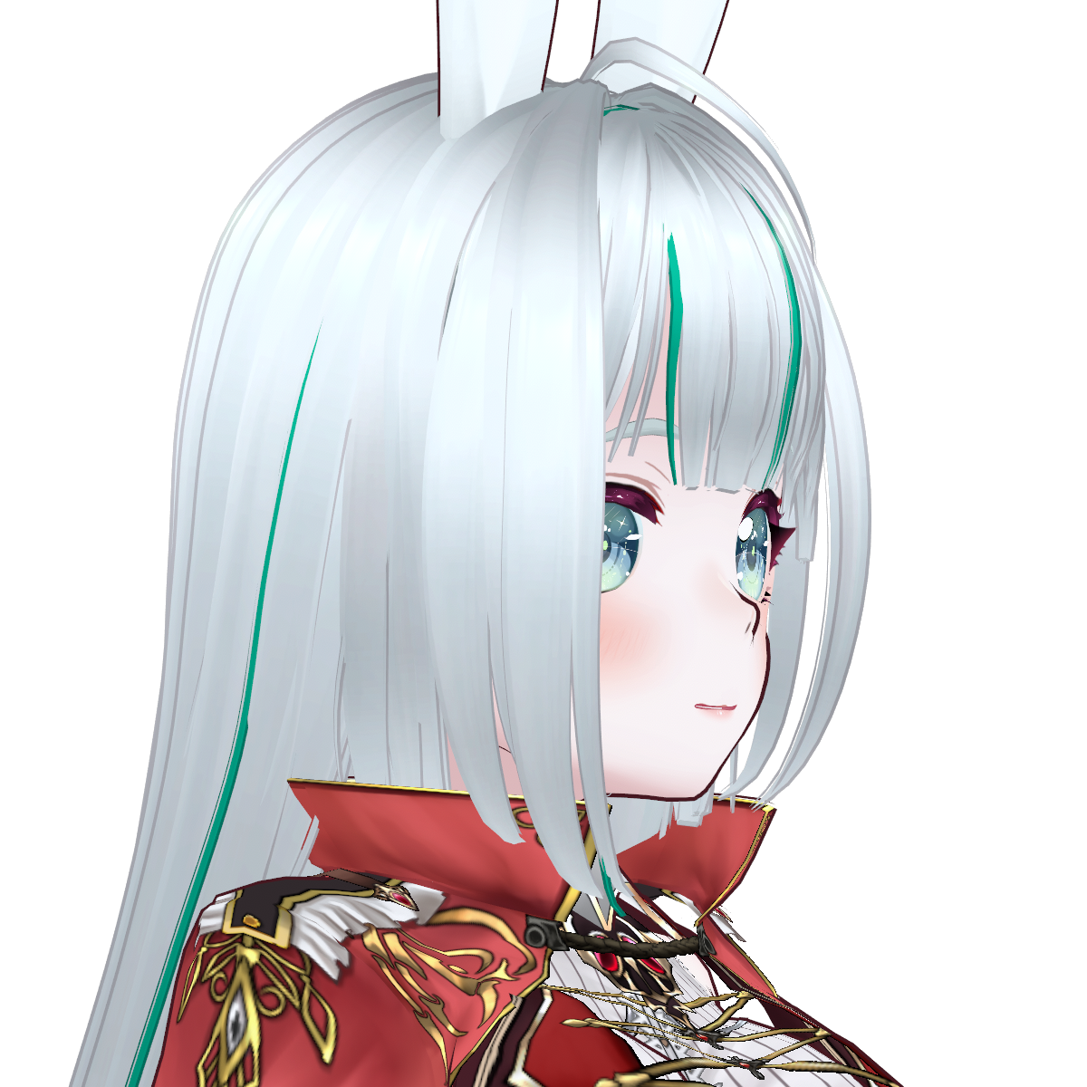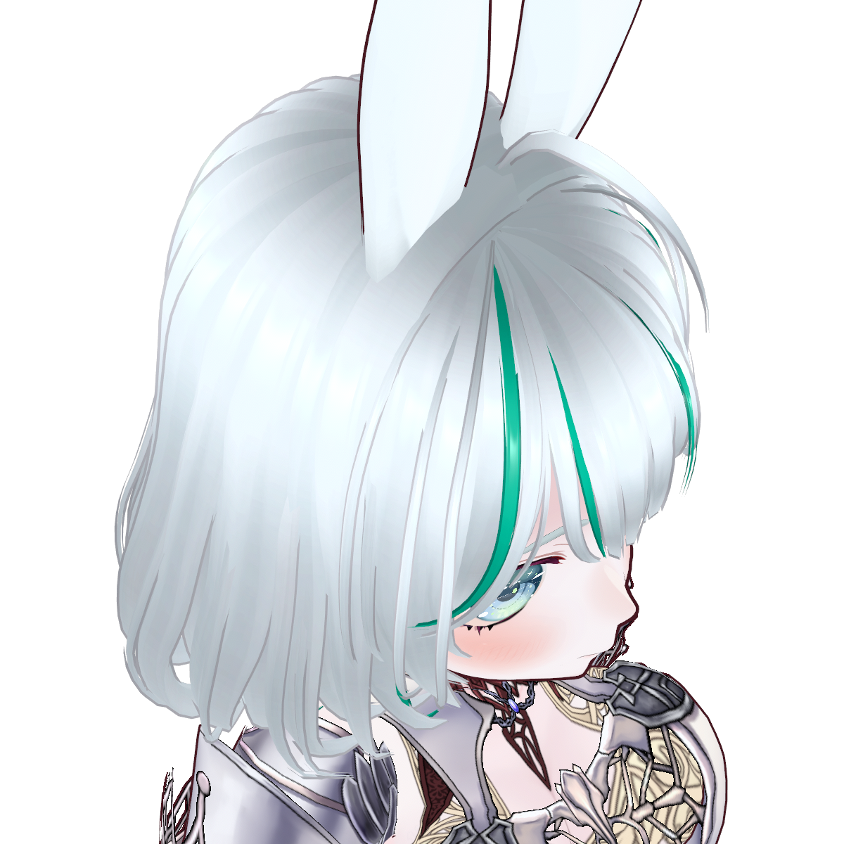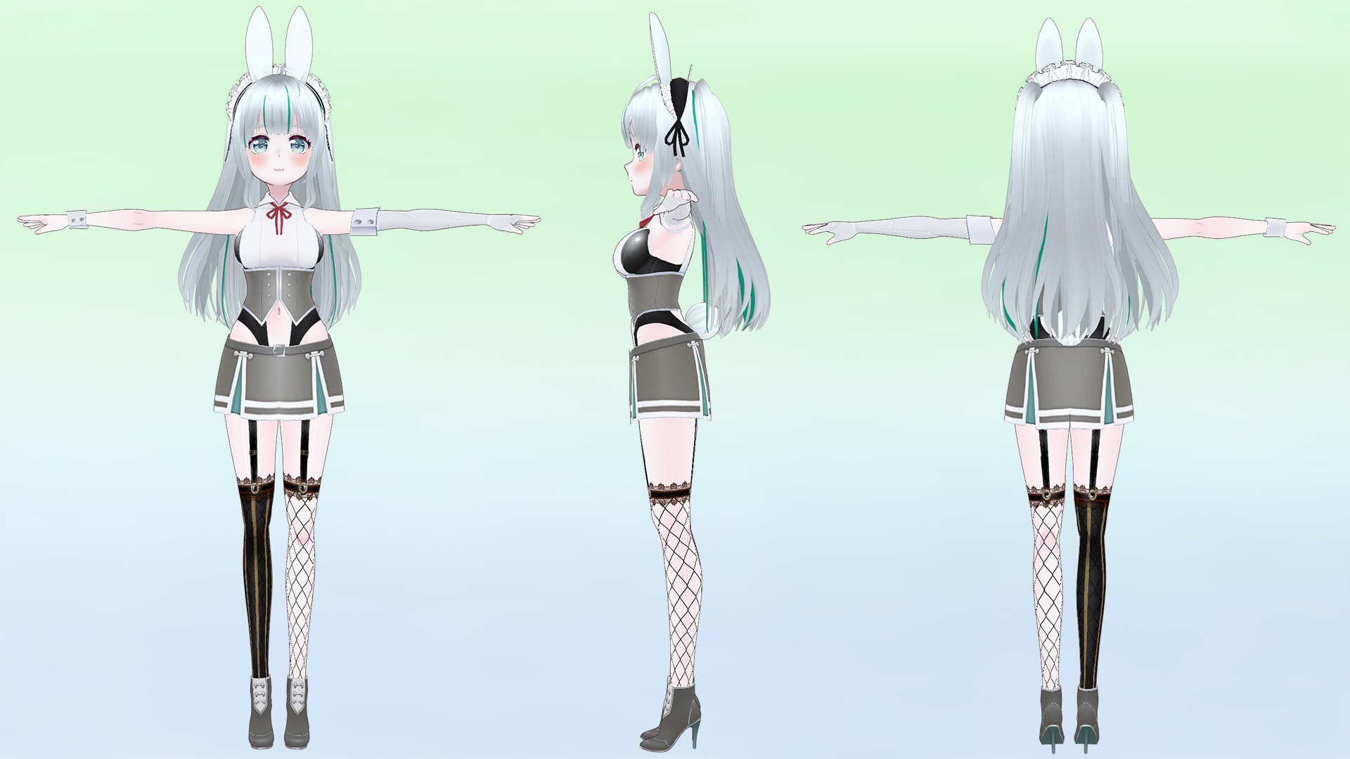 シルバーヘアで、うさ耳は頭から直に生えています。ポニーテールの位置は高めです。