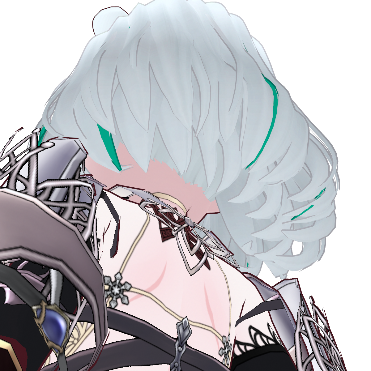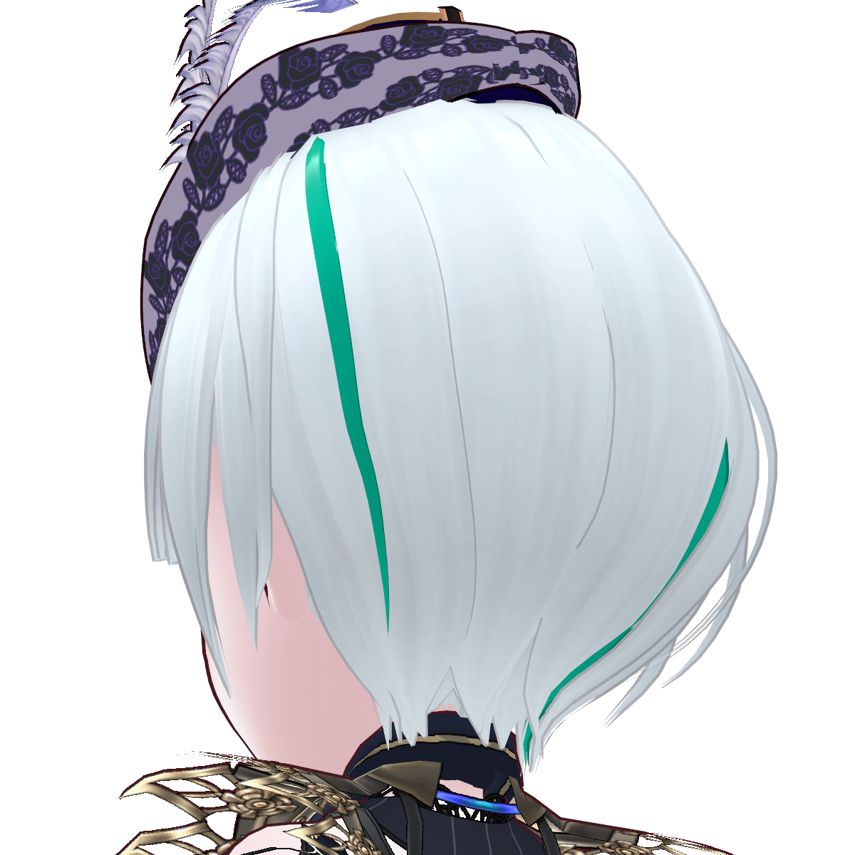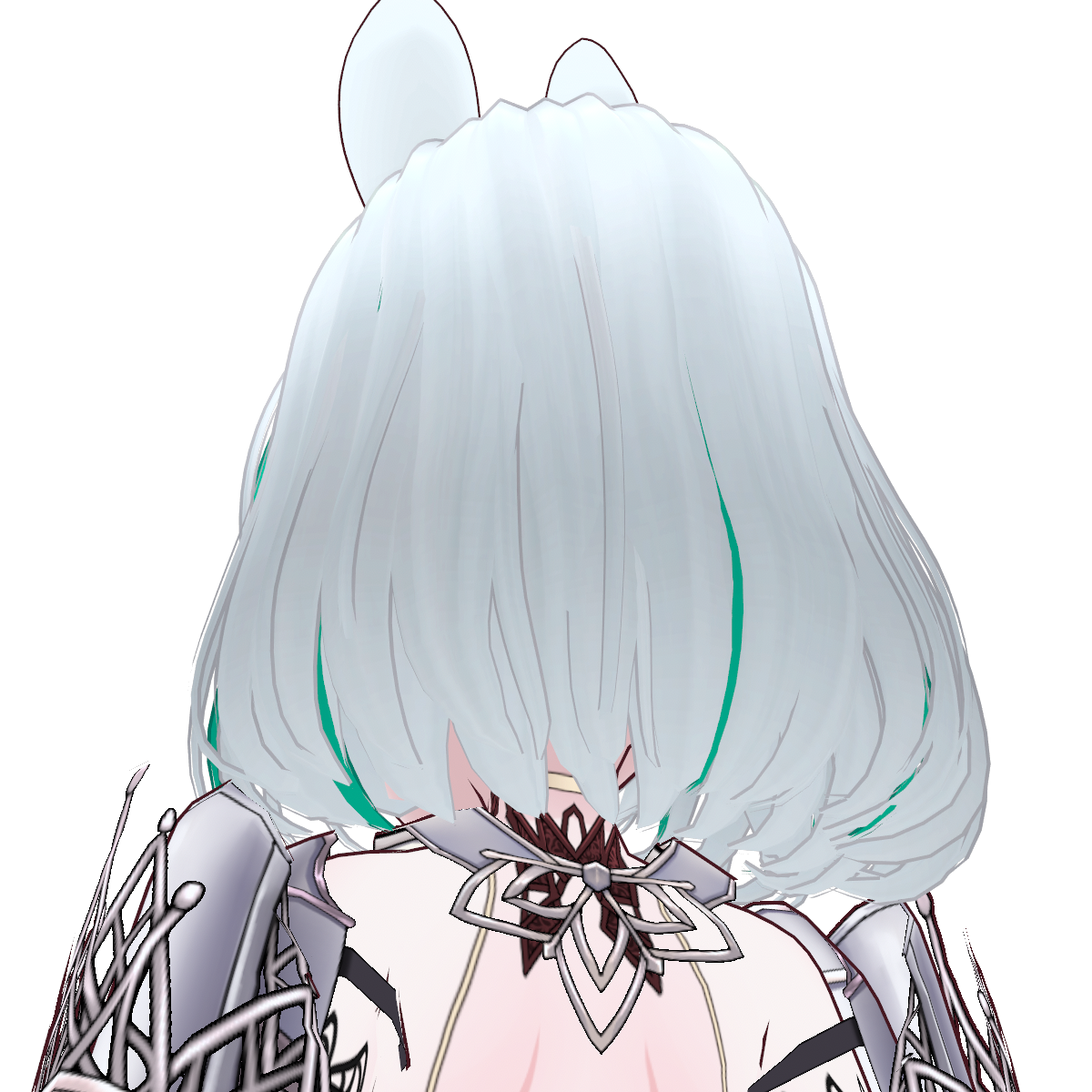 シルバーヘアで、ハイライト(ポイントカラー)は緑色で前髪に3か所、後ろのほうは大体で適宜同じく緑でハイライトをいれてください。頭の高めの位置でサイドツインテールにしています。