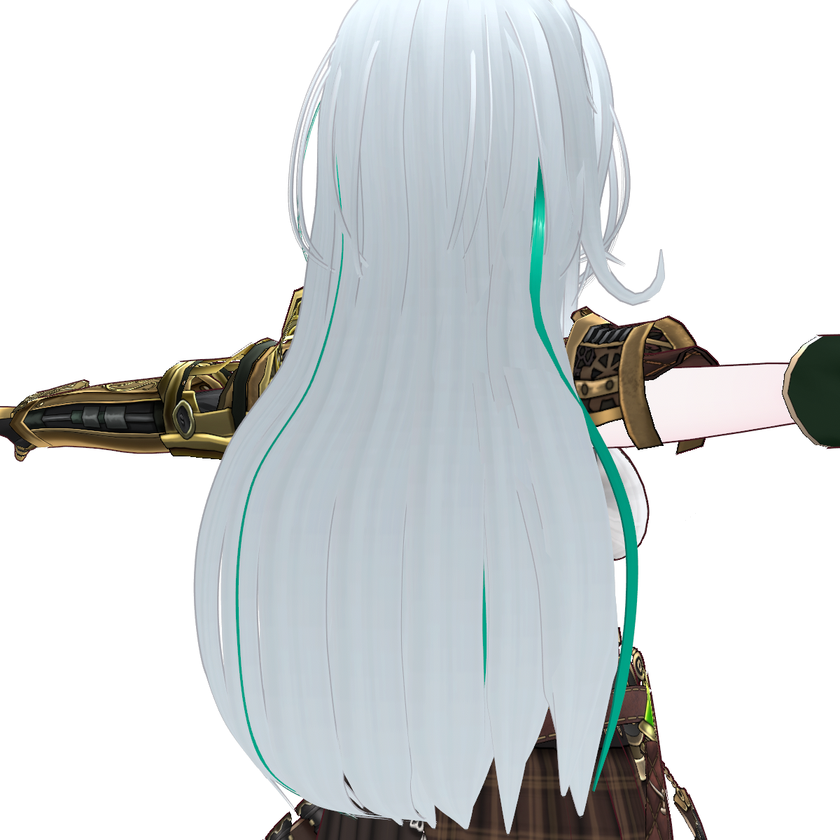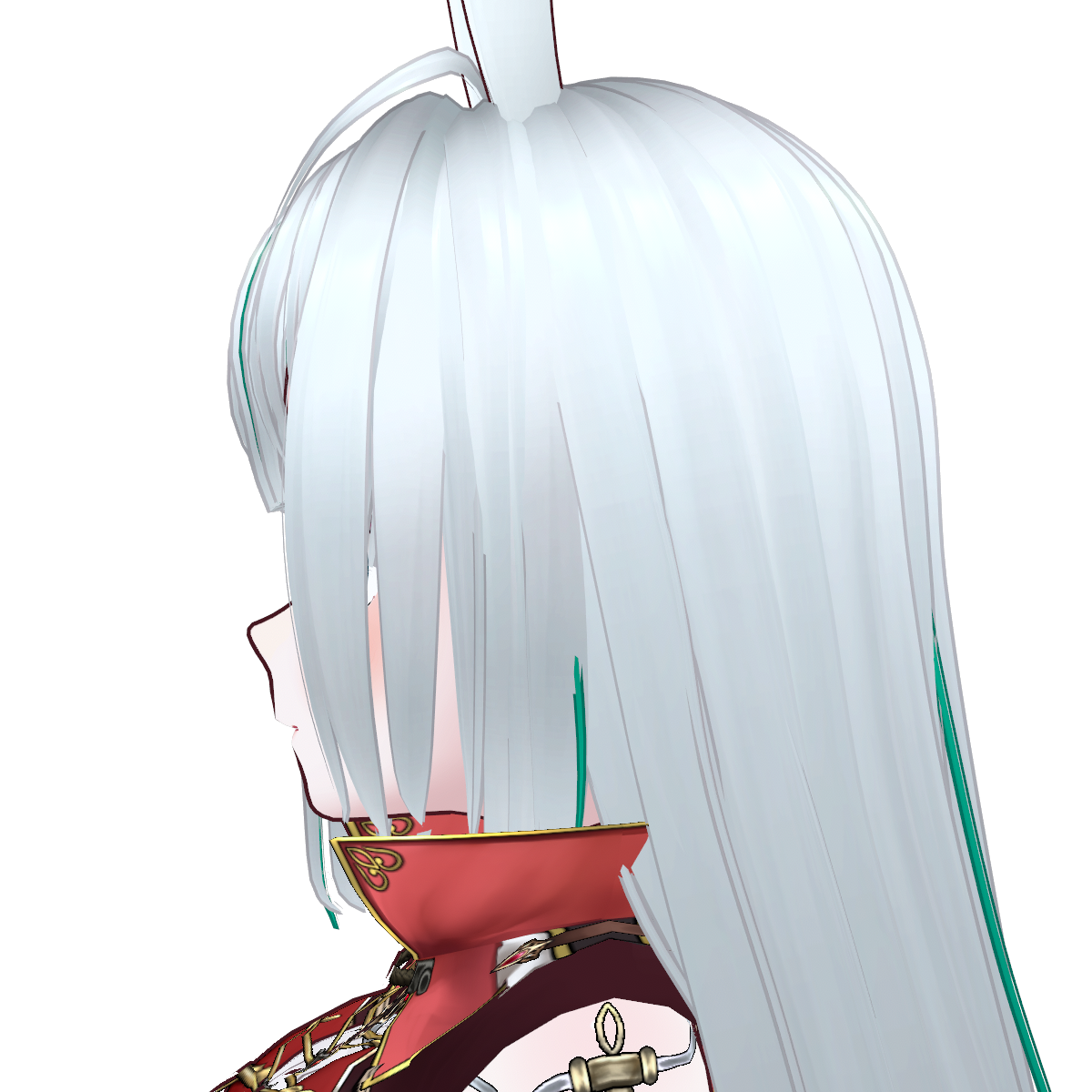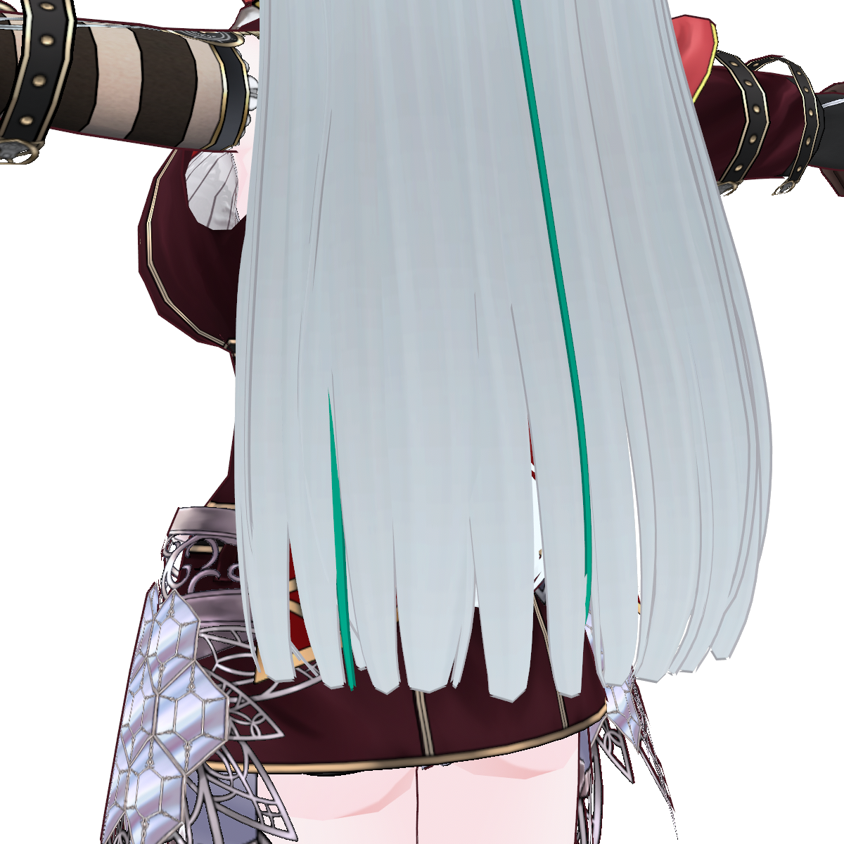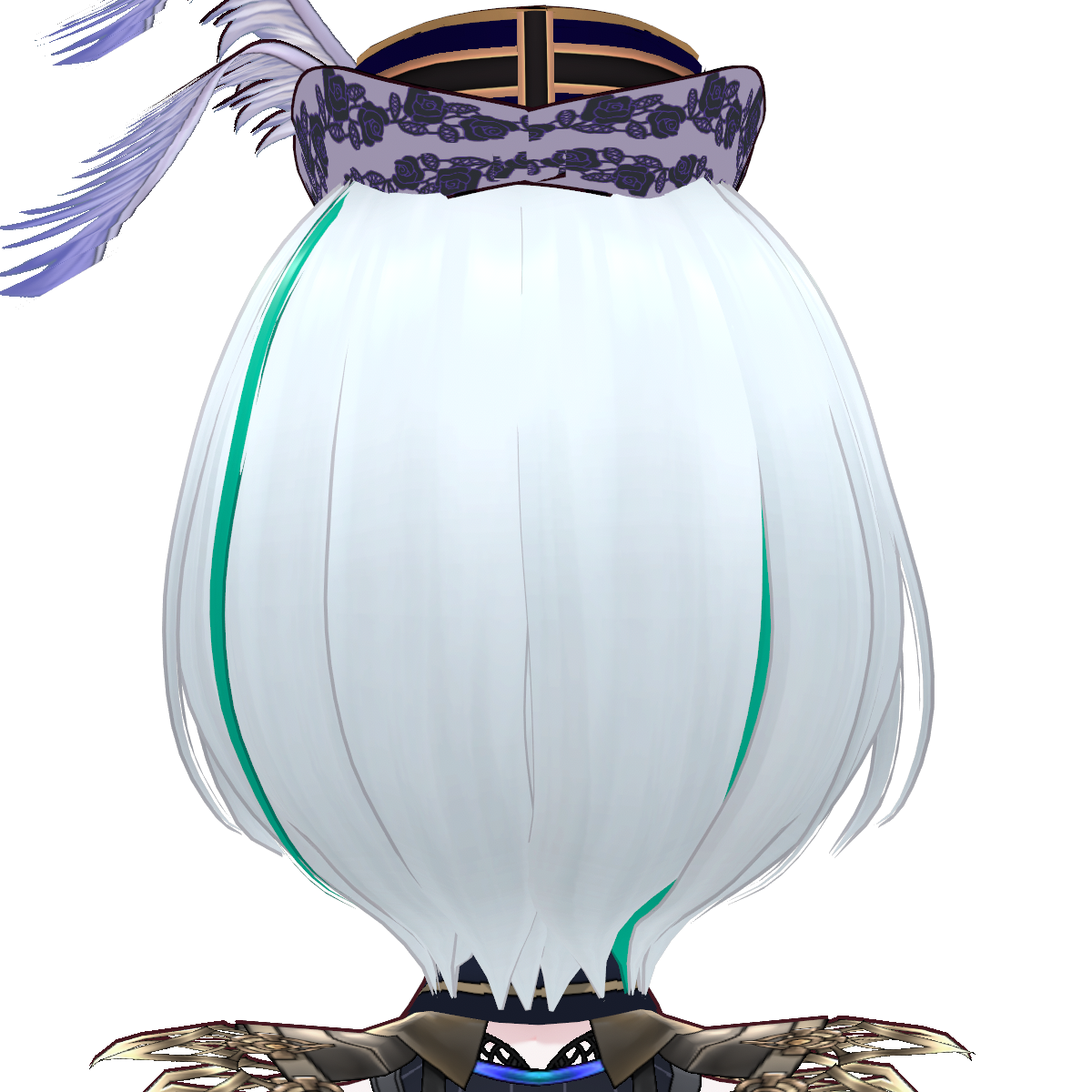 シルバーヘアで、ハイライト(ポイントカラー)は緑色で前髪に3か所、後ろのほうは大体で適宜同じく緑でハイライトをいれてください。頭の高めの位置でサイドツインテールにしています。