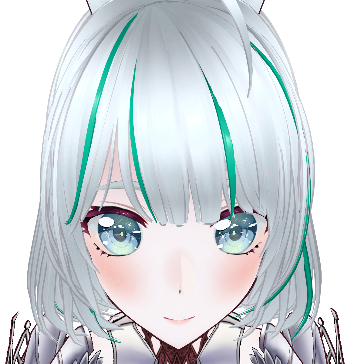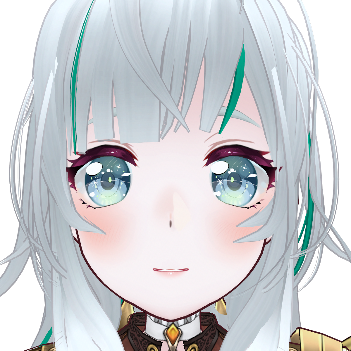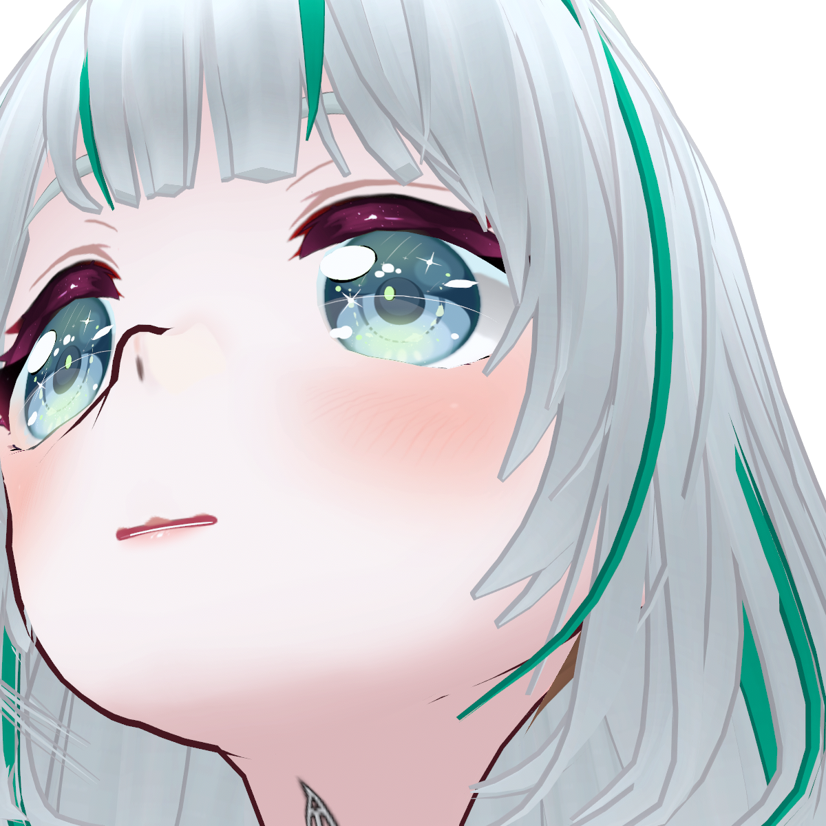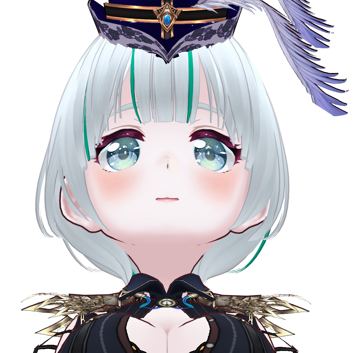 たれ目で瞳の色は「ブルー」がベースです、下部が緑っぽいグラデーションになっています。優しい目元です。眉毛は太めの下がり気味眉です。
