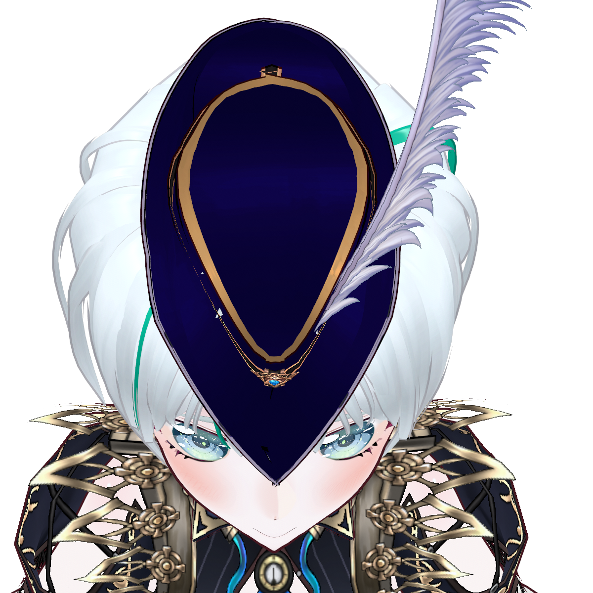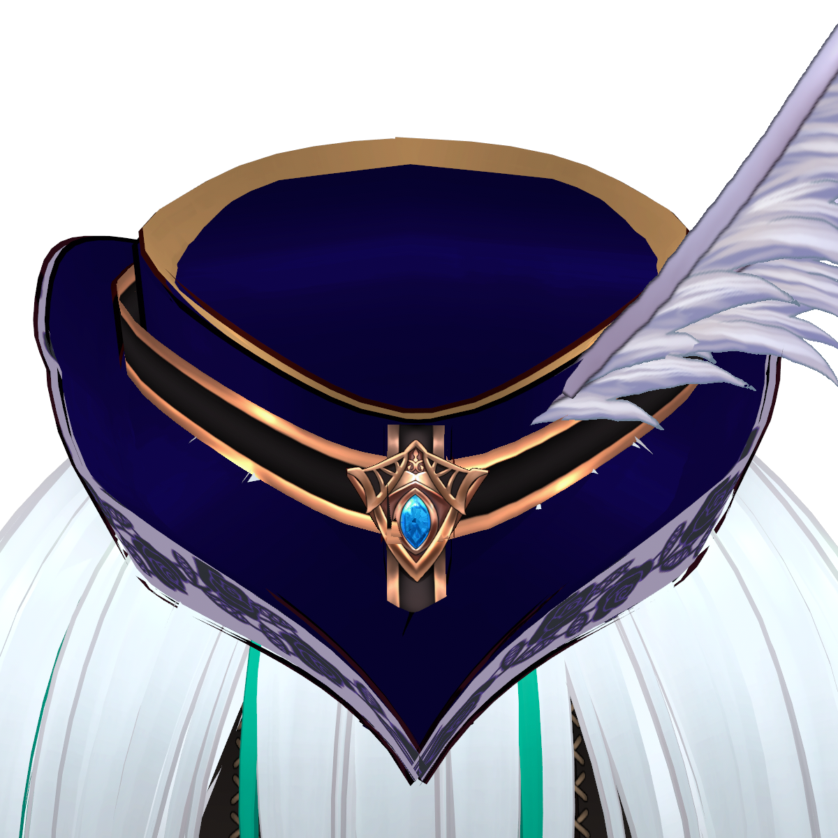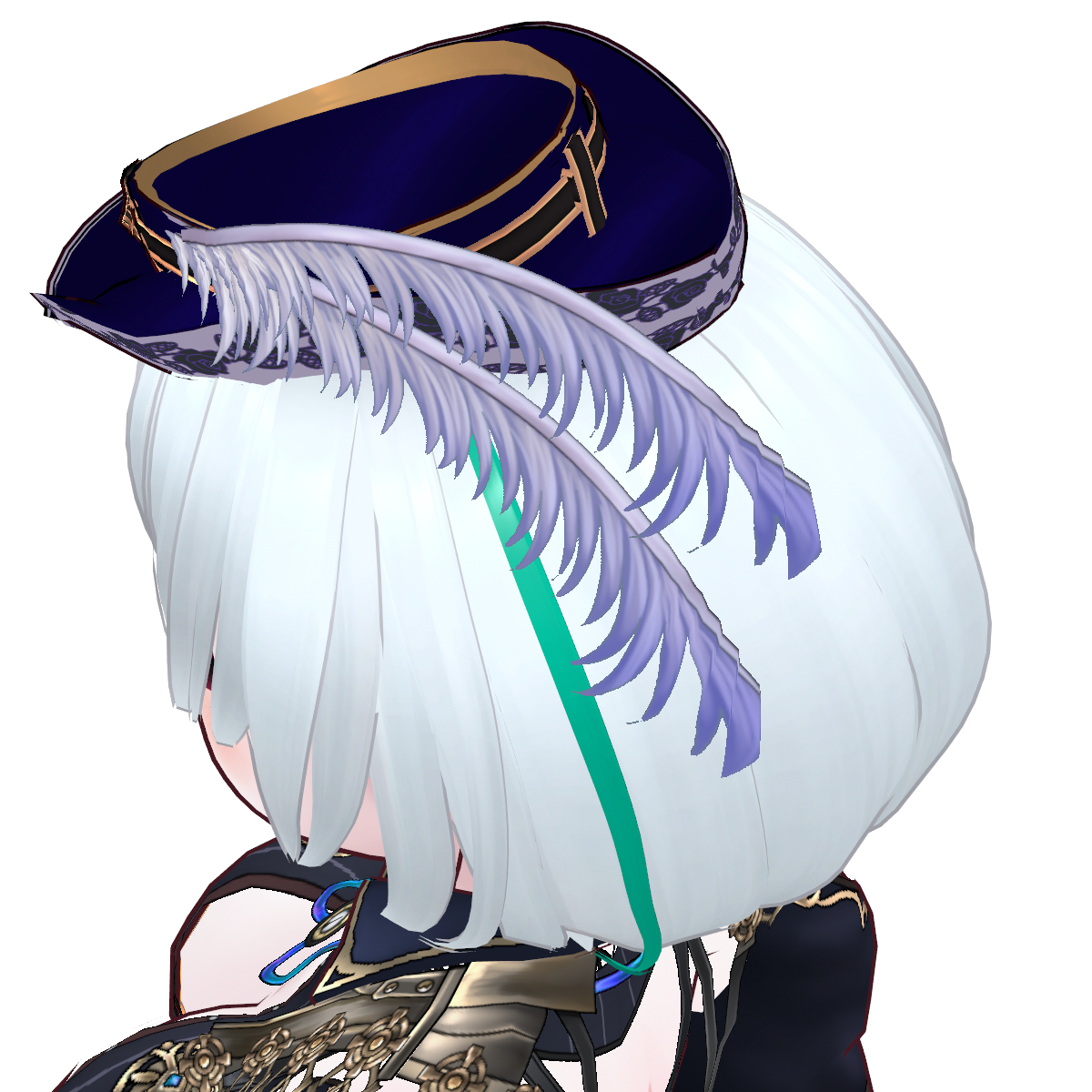 羽のような装飾のあるダークネイビーのトップスに、下は白のパンツスタイルです。帽子をかぶっています。