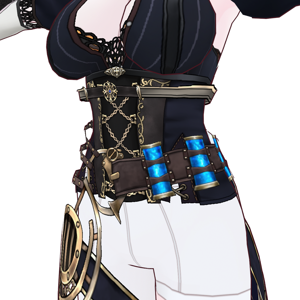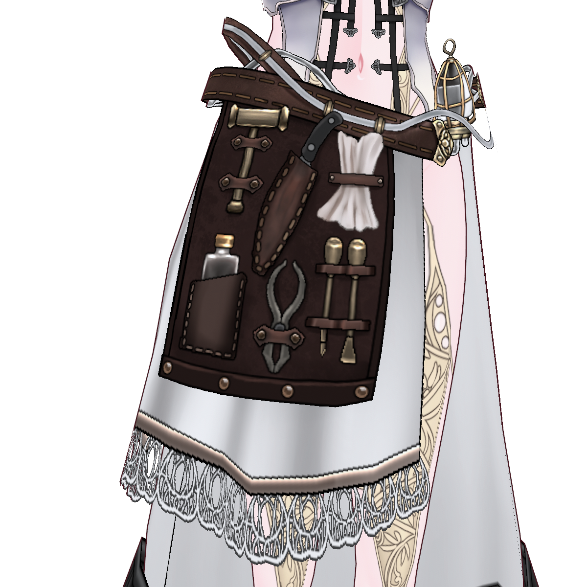 鍛冶道具セットがついた革の腰巻をしています。背面や腰布以外の箇所は露出が高く、角度によっては紋章のような柄の前貼りが見えます。