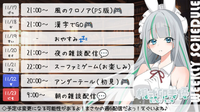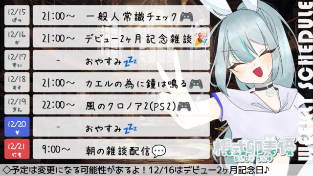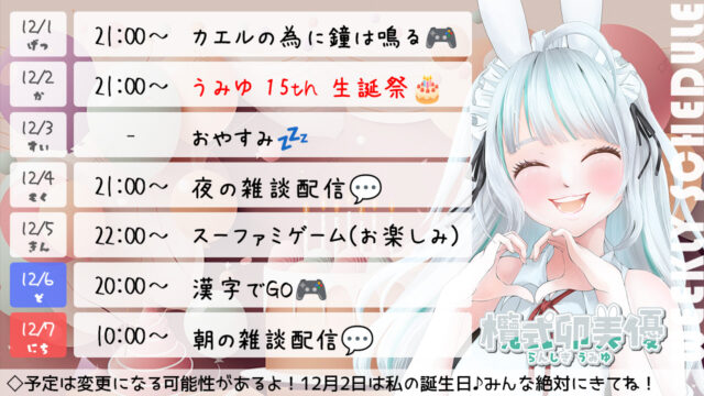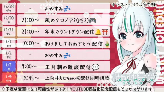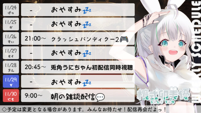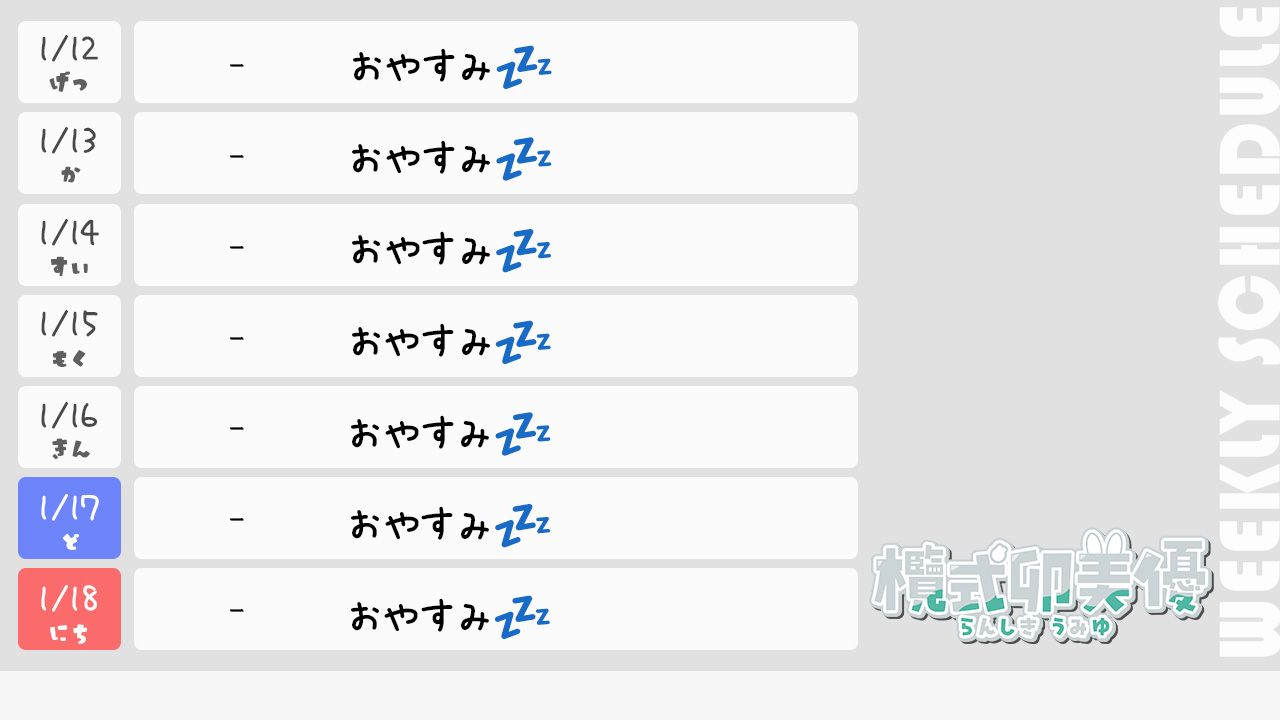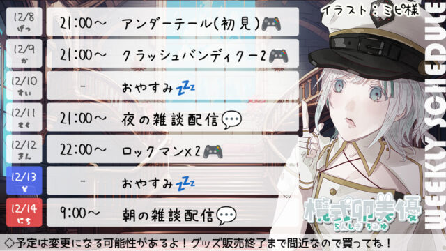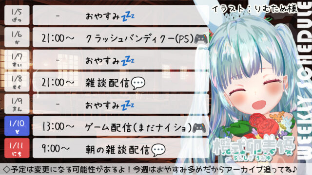 今週の配信スケジュール ▽▽最新スケジュール表はこちらです▽▽ 表示期間:1月12(月)~1月18日(日) ※画像を長押しで保存してもらうのがおすすめです。 今週の見どころ1週間の活動自粛とさせていただきます。 過去の配信スケジュール表 ※過去の配信スケジュールも確認ができます♪ ◆2026年~ ◆2025年~