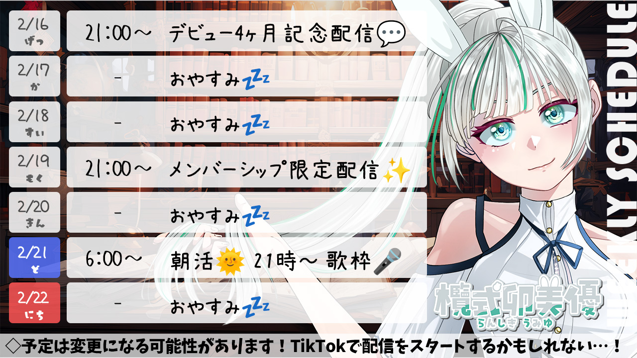 今週の配信スケジュール ▽▽最新スケジュール表はこちらです▽▽ 表示期間:2月16(月)~2月22日(日) ※画像を長押しで保存してもらうのがおすすめです。 今週の見どころ4ヶ月記念配信と、メンバーシップ限定配信をするからね♪ 過去の配信スケジュール表 ※過去の配信スケジュールも確認ができます♪ ◆2026年~ ◆2025年~
